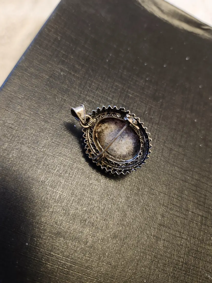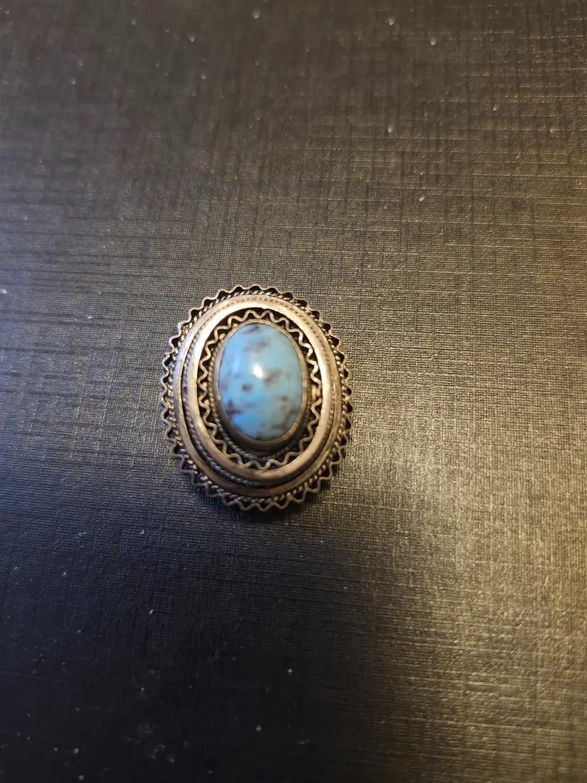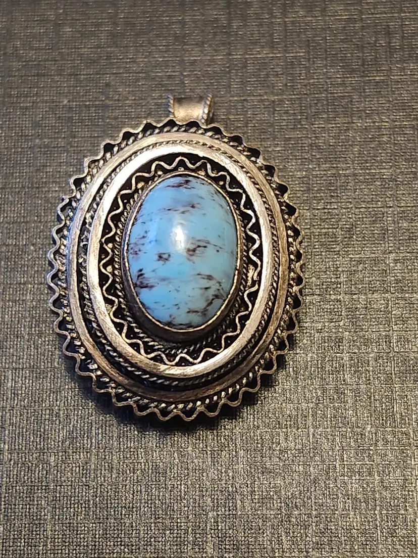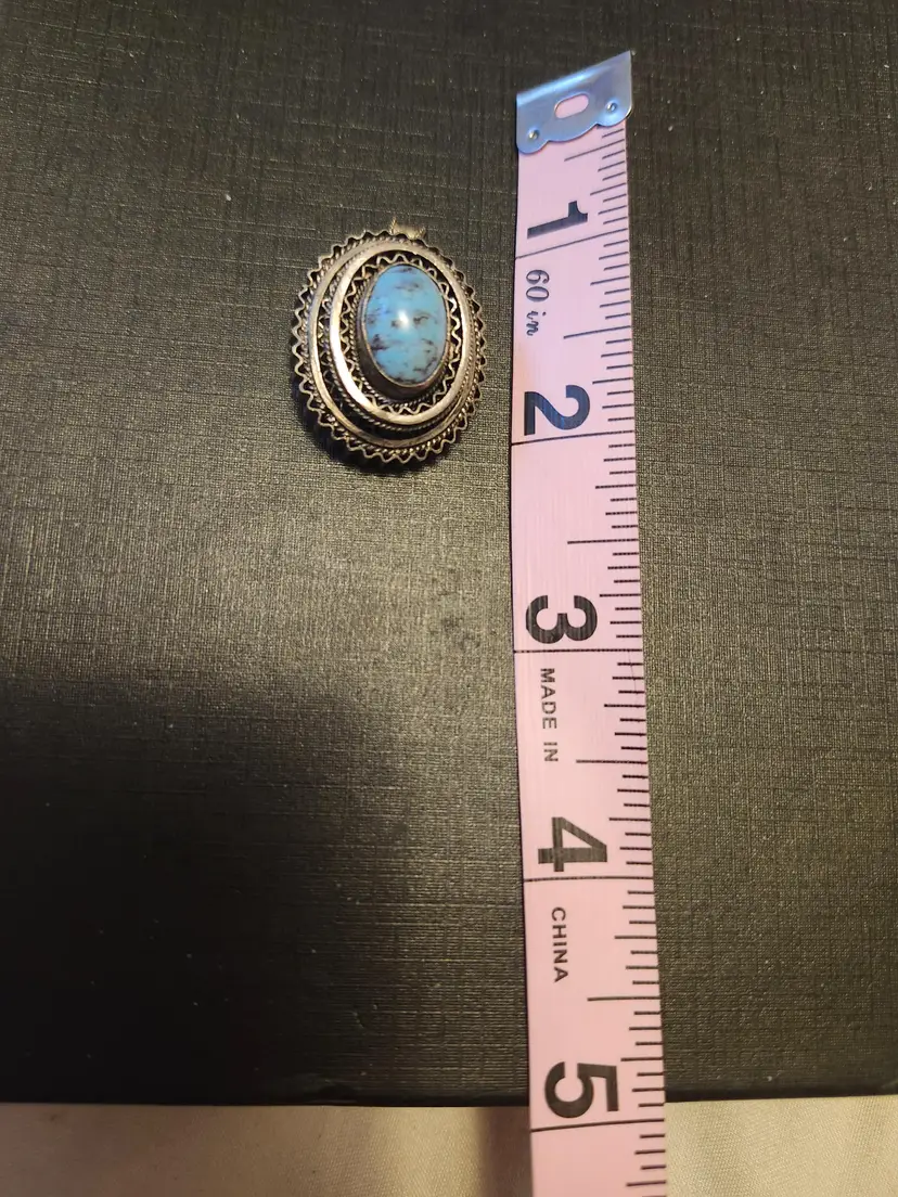 This Antique Navajo Brooch/Pendant is a stunning piece of jewellery that showcases the beauty of Native American craftsmanship. Made from sterling silver with a 925 metal purity, this piece features an oval-shaped turquoise stone in a vibrant blue color. The turquoise stone is the main attraction of this brooch/pendant, adding a pop of color to any outfit.