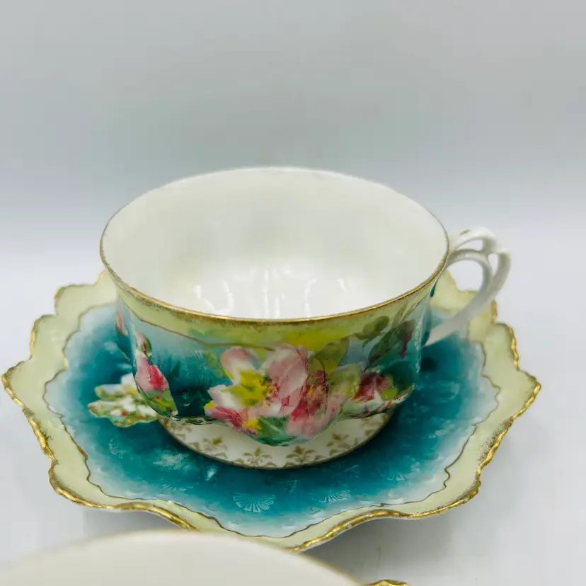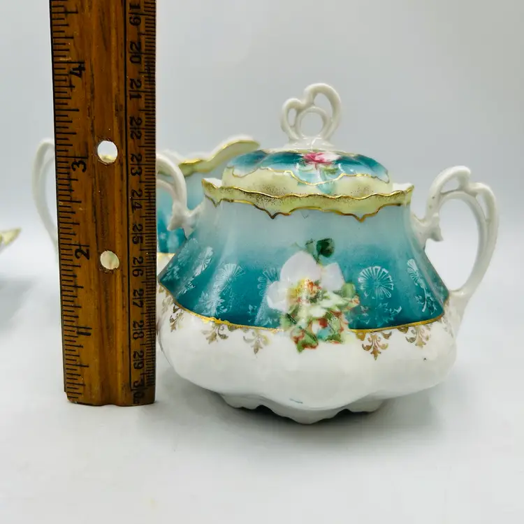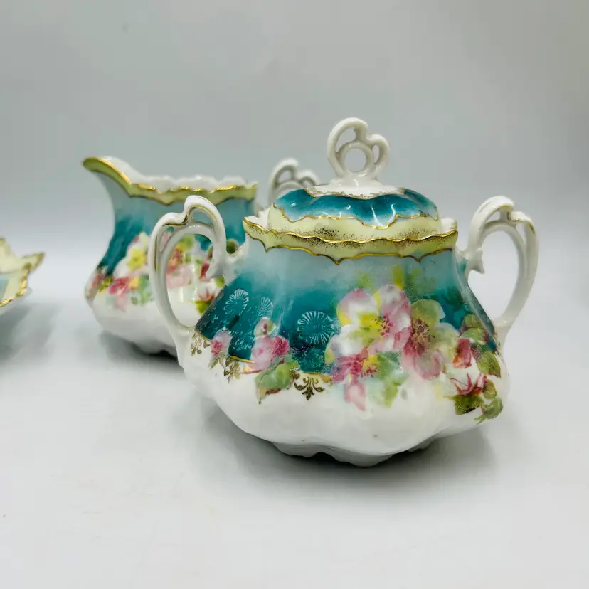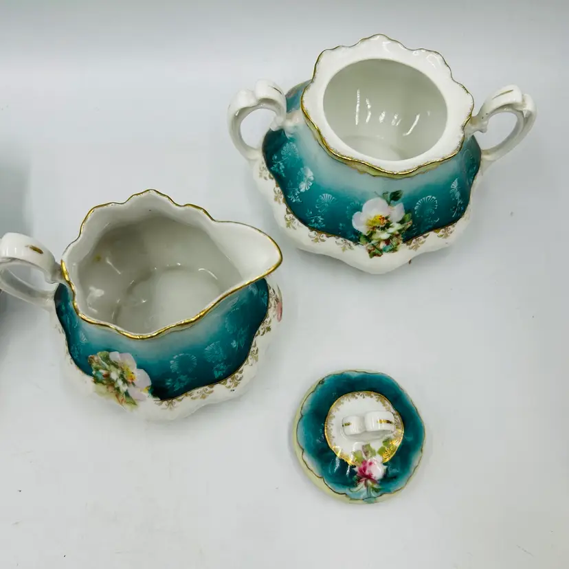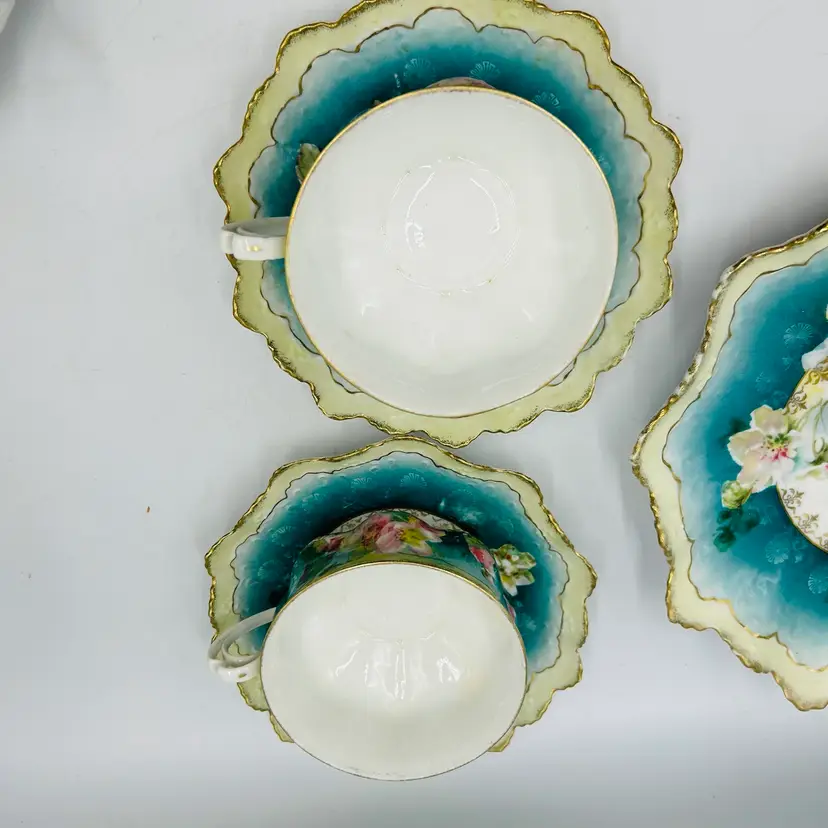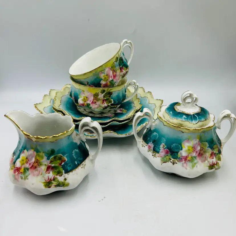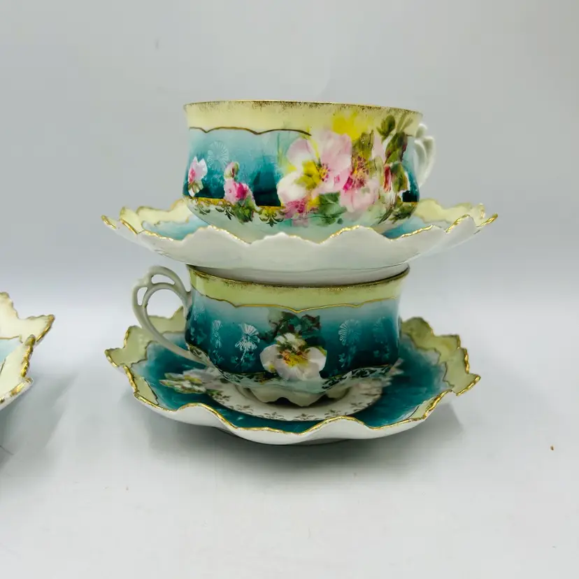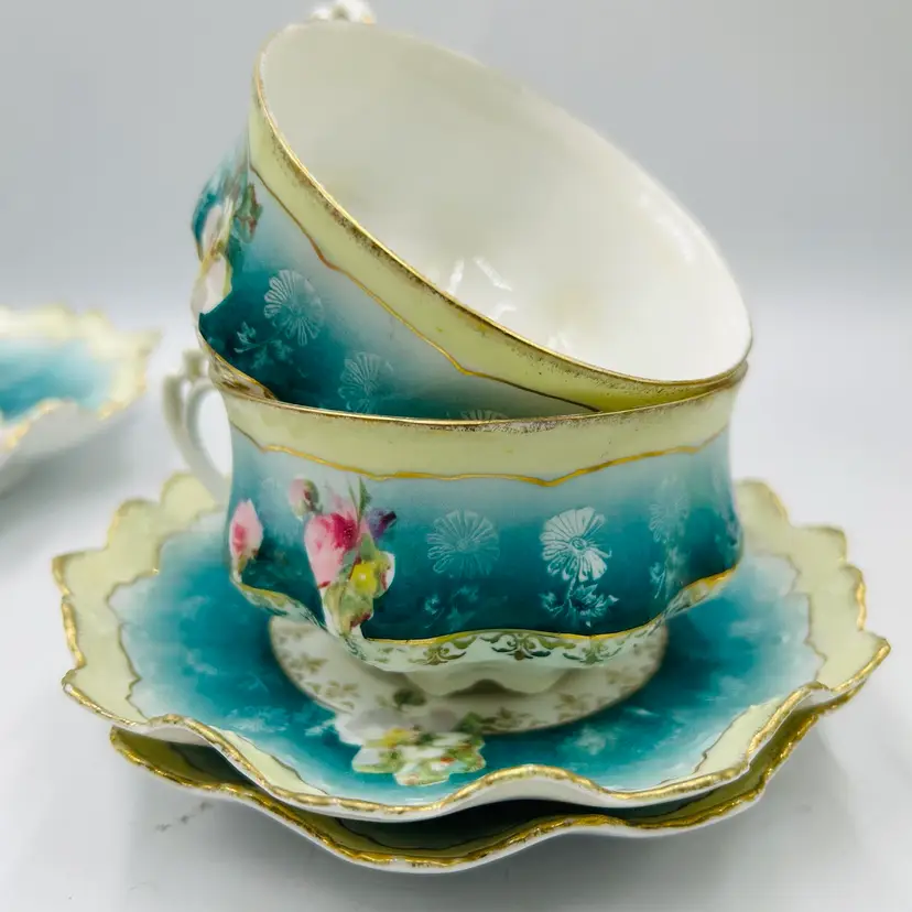 2 cups and saucers, sugar and creamer, and a dessert plate