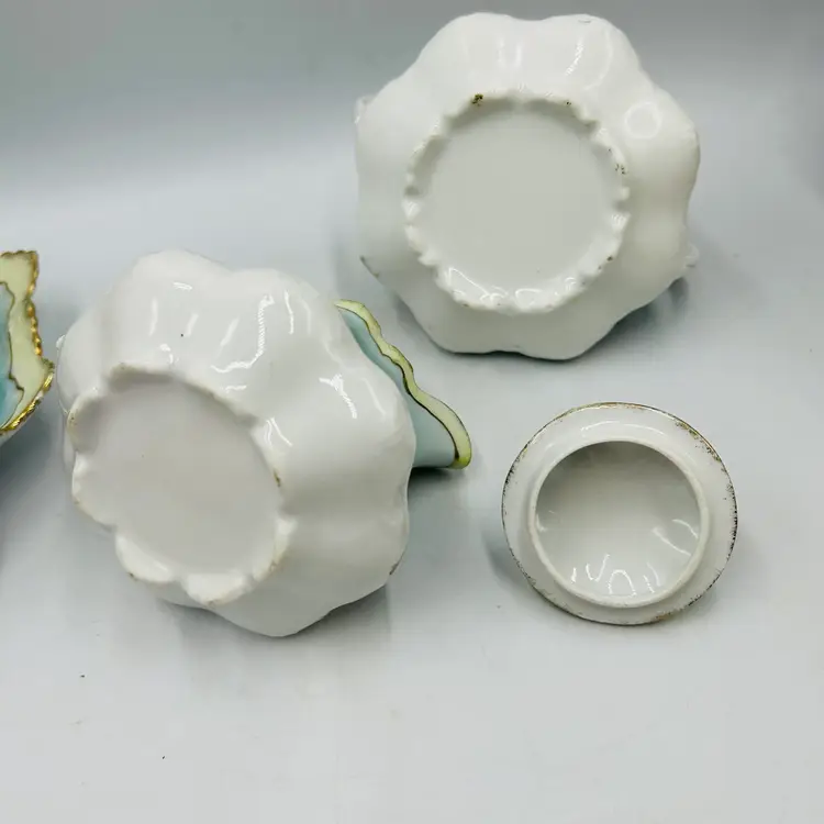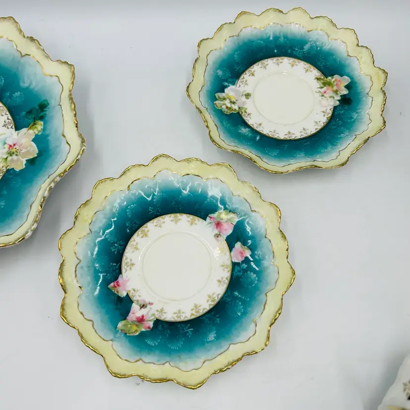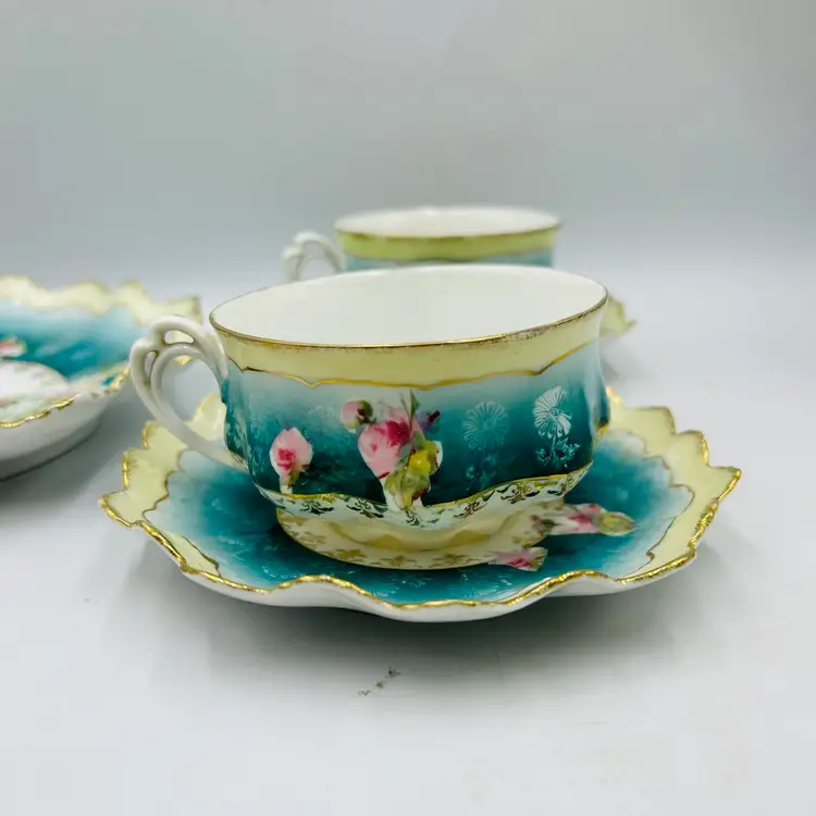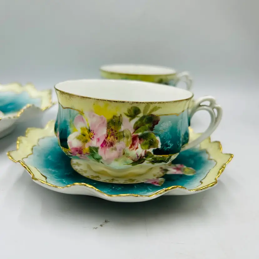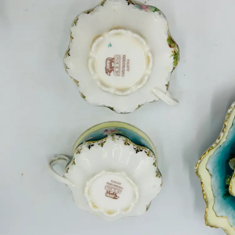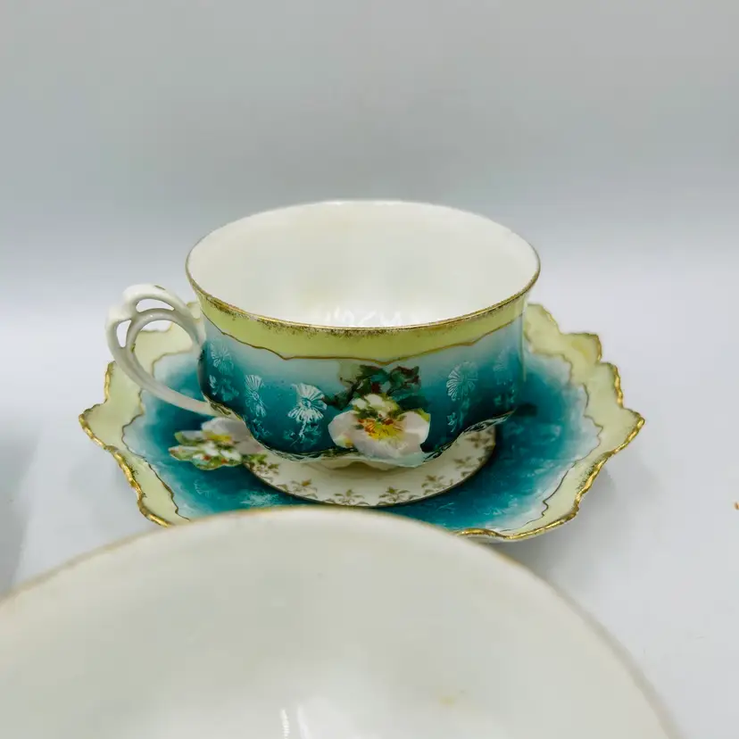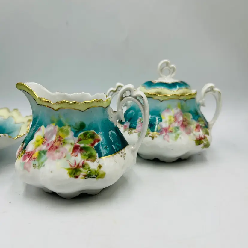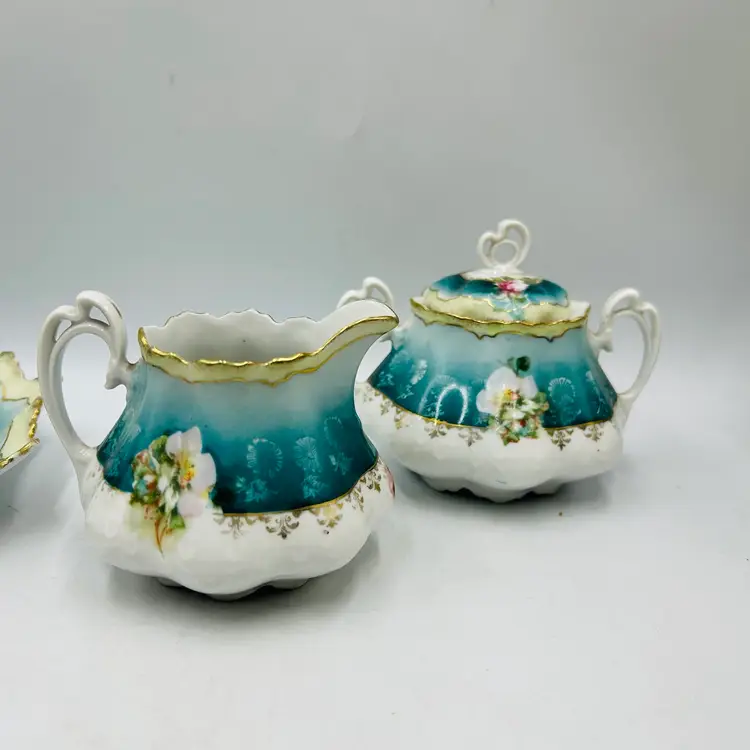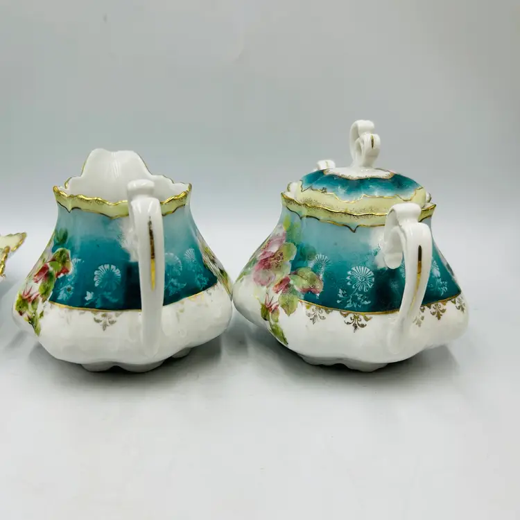 2 cups and saucers, sugar and creamer, and a dessert plate