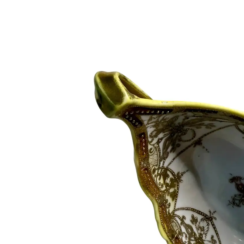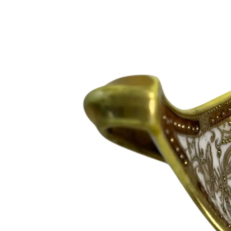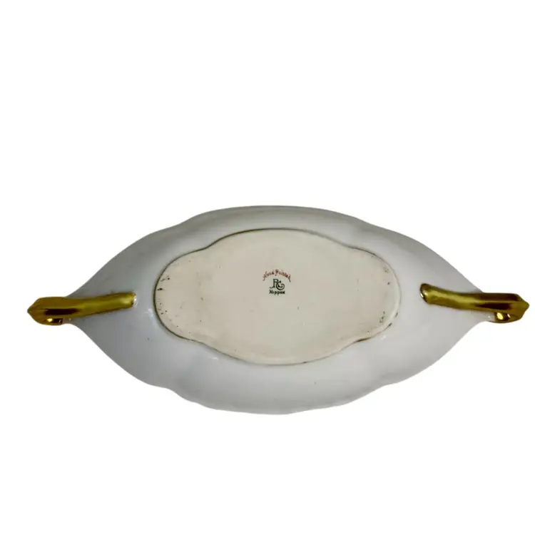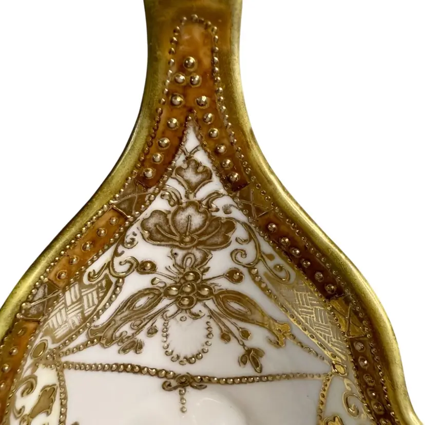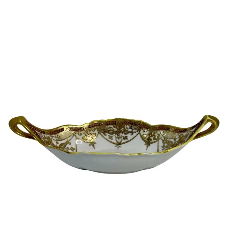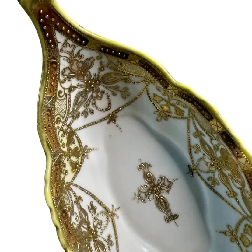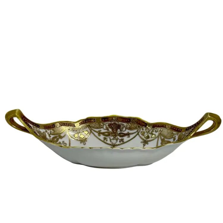 This is an antique hand-painted Nippon porcelain celery or candy dish possibly made by Morimura Bros. The dish features intricate gold "moriage" detailing, which refers to the raised enamel beading and decoration. The style is characteristic of the "Nippon era" (1890-1921), when ceramics were produced in Japan for export to the US market, often imitating European styles.
