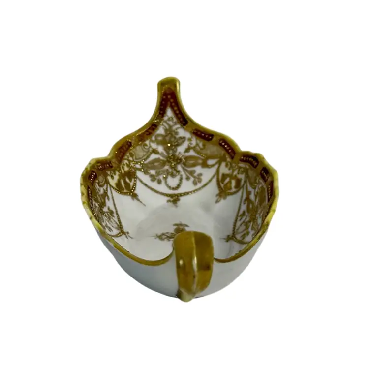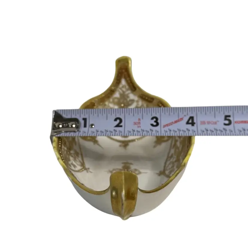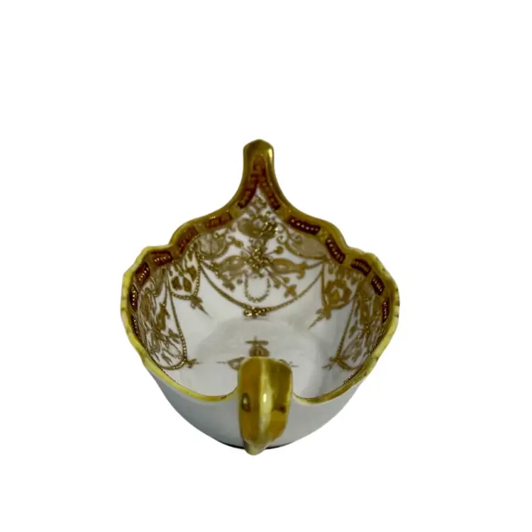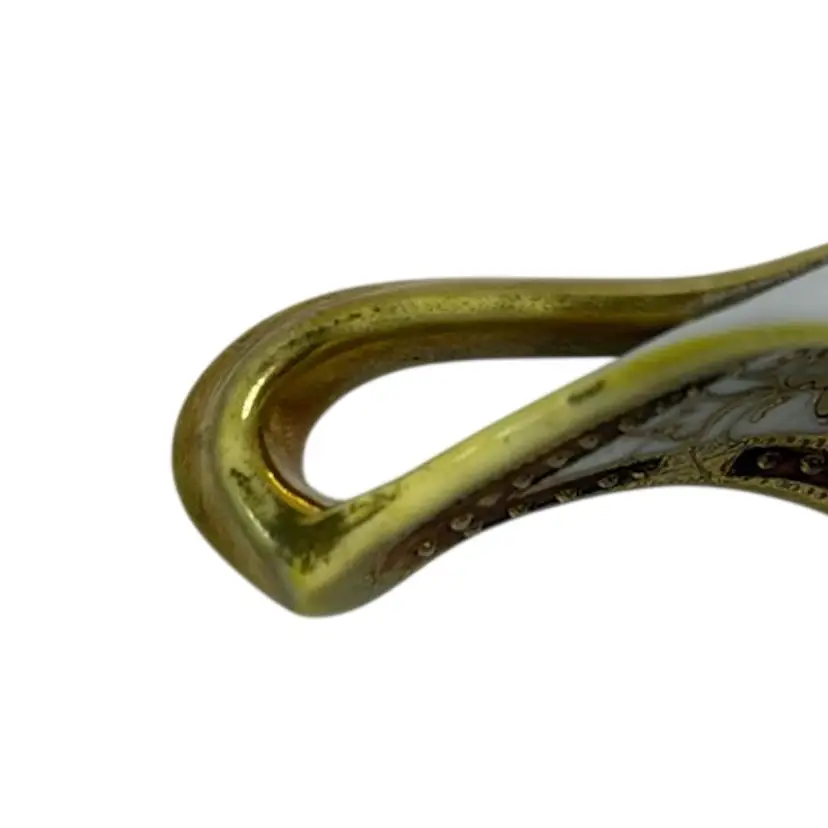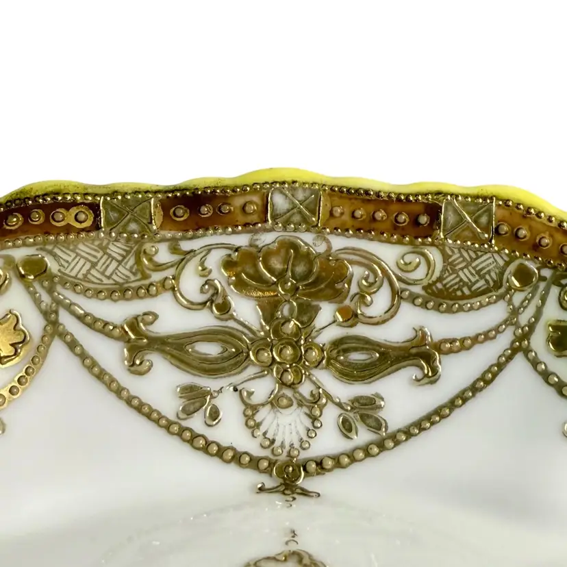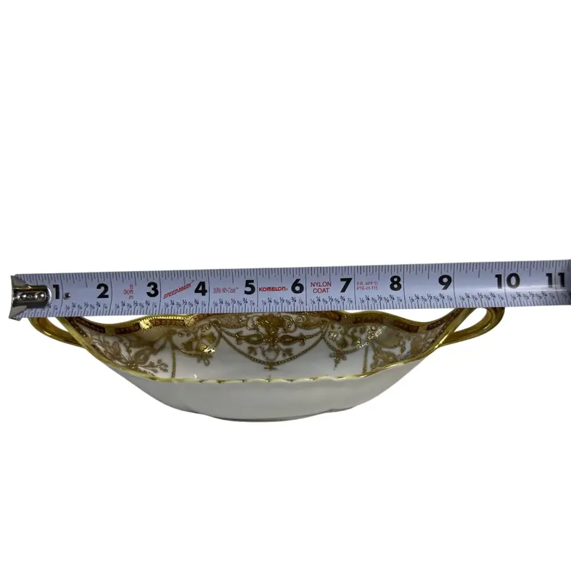 This is an antique hand-painted Nippon porcelain celery or candy dish possibly made by Morimura Bros. The dish features intricate gold "moriage" detailing, which refers to the raised enamel beading and decoration. The style is characteristic of the "Nippon era" (1890-1921), when ceramics were produced in Japan for export to the US market, often imitating European styles.