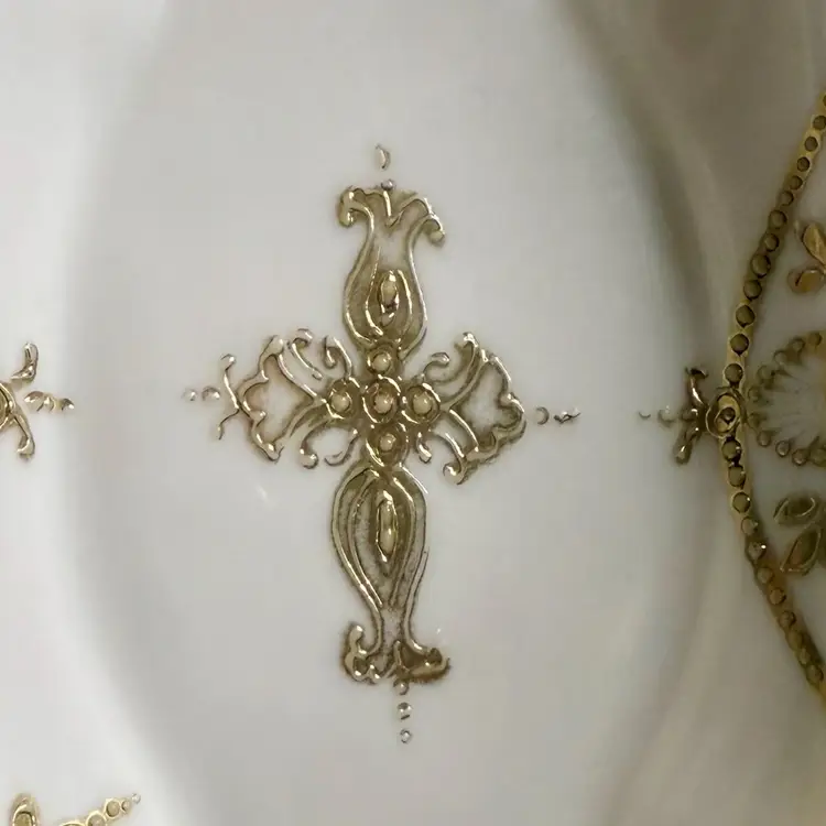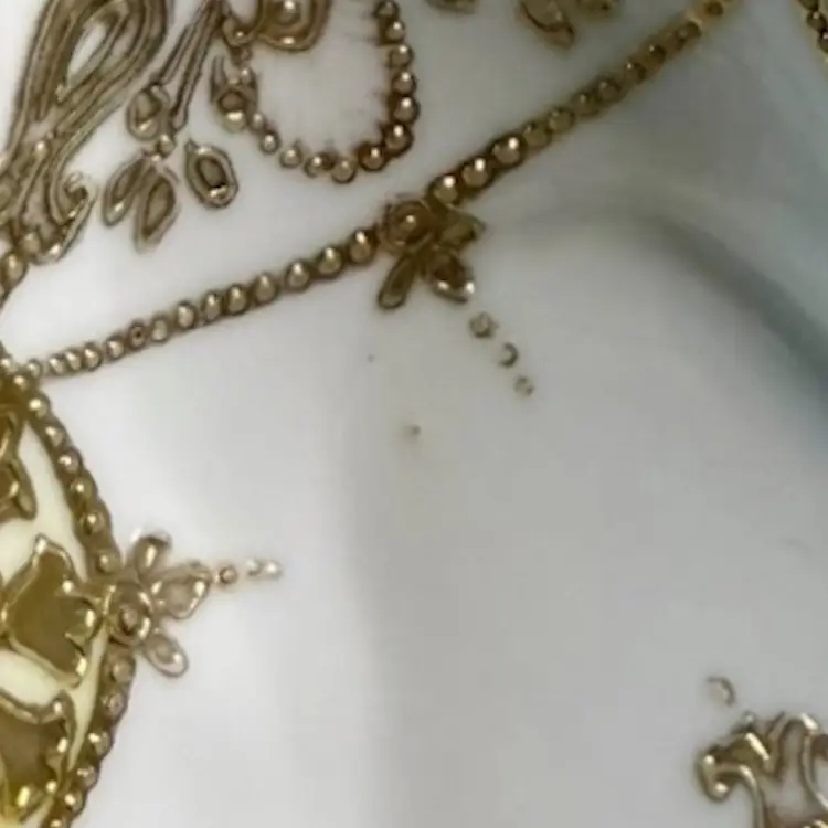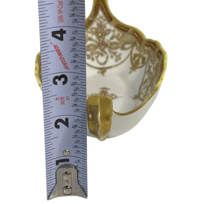 Condition: Wear on gold paint around the edge and handles. One small raised bump inside on the bottom. No other condition issues noted.