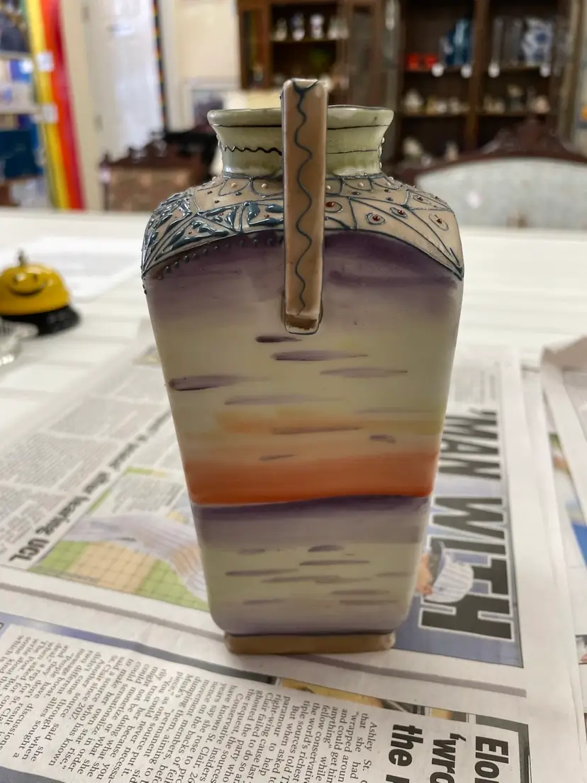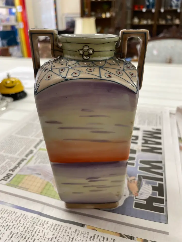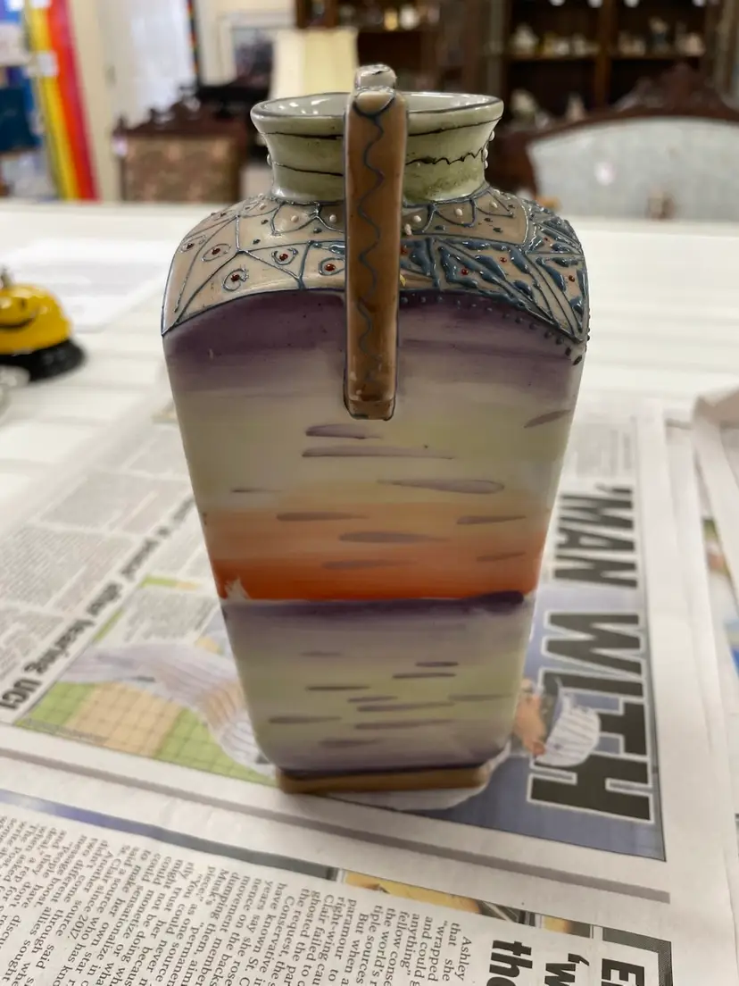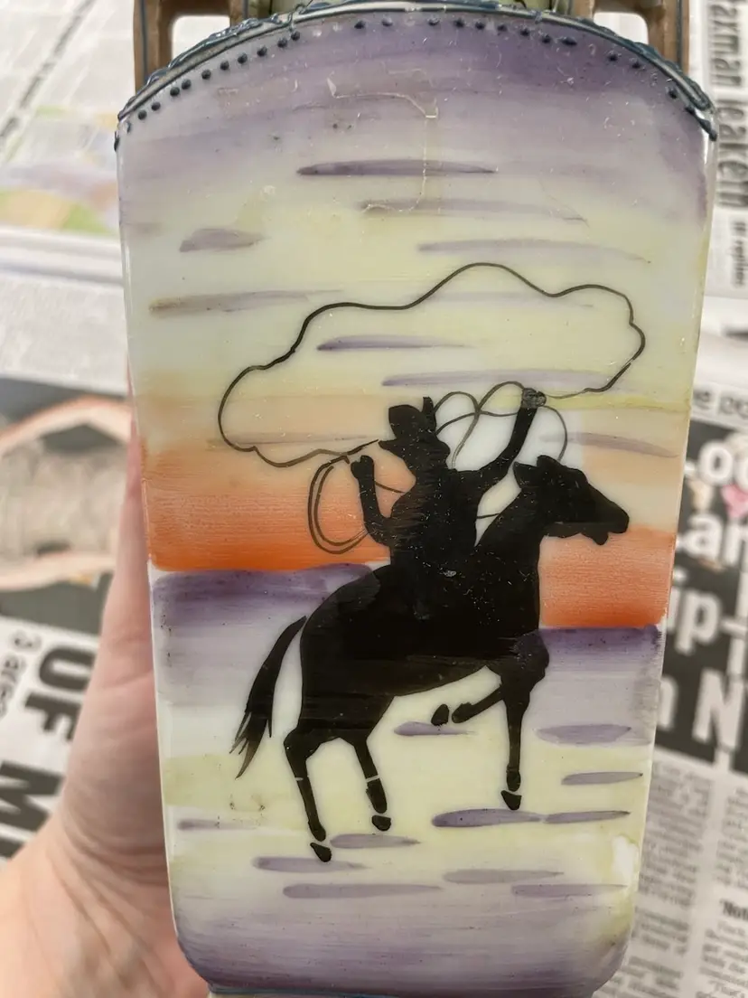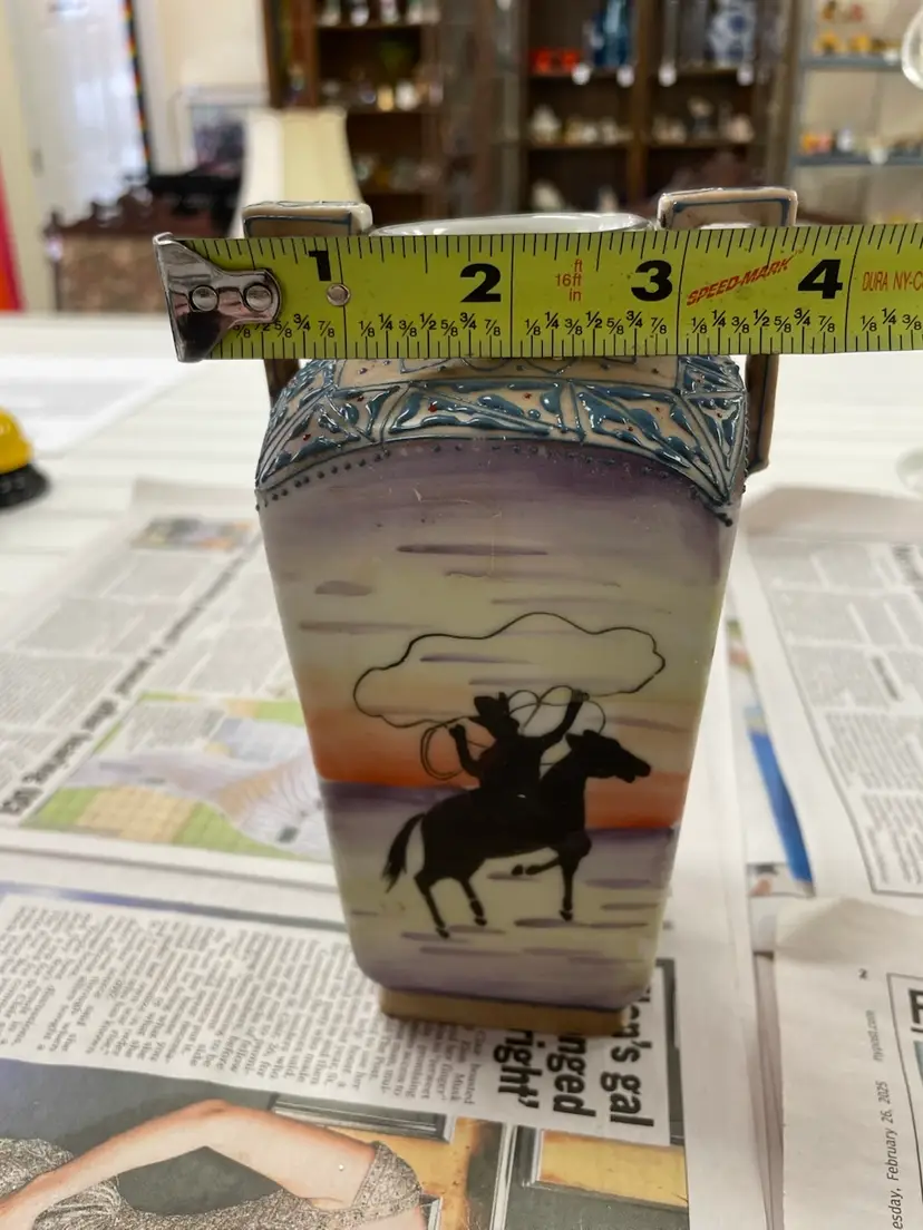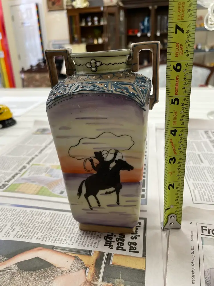 Antique Nippon Hand-Painted Cowboy Double Handle Vase with Intricate Moriage