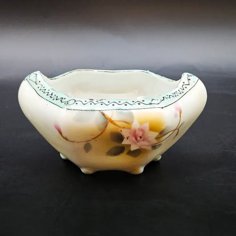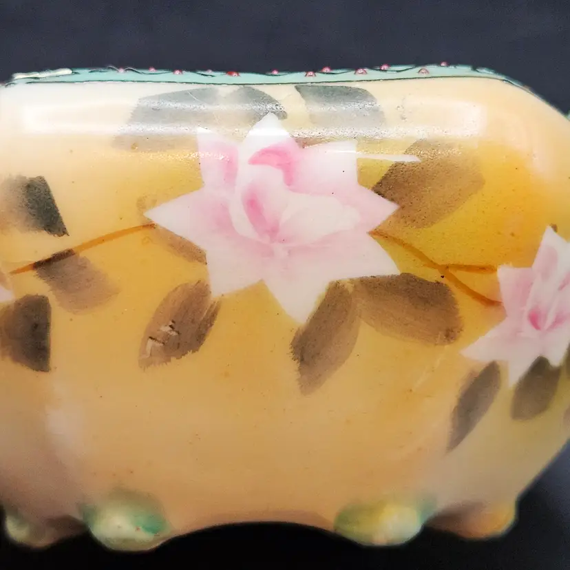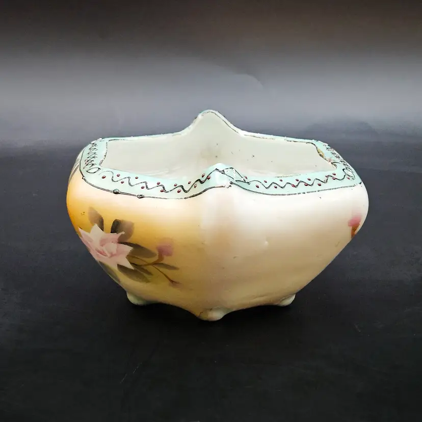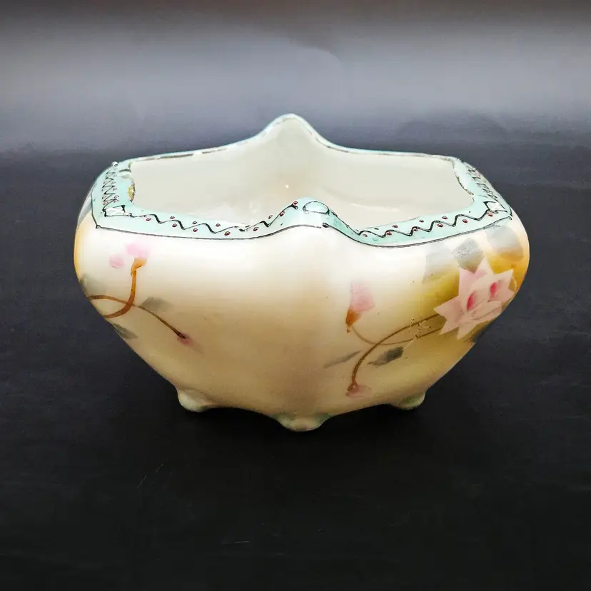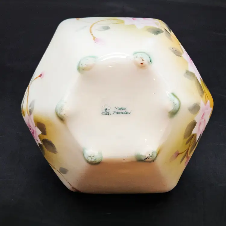 Beautiful vintage hand-painted porcelain bowl, likely Nippon (Japan), dating c.1891–1921. Features delicate pink roses on a soft yellow/cream lusterware ground with a scalloped, hexagonal form. The rim is accented in pale blue with raised moriage beading and fine detailing. Stands on four small feet, ideal as a nut dish, candy bowl, or trinket holder. Classic Art Nouveau/early Art Deco export style.