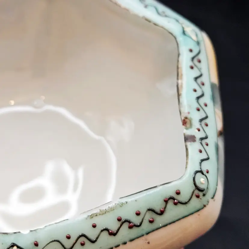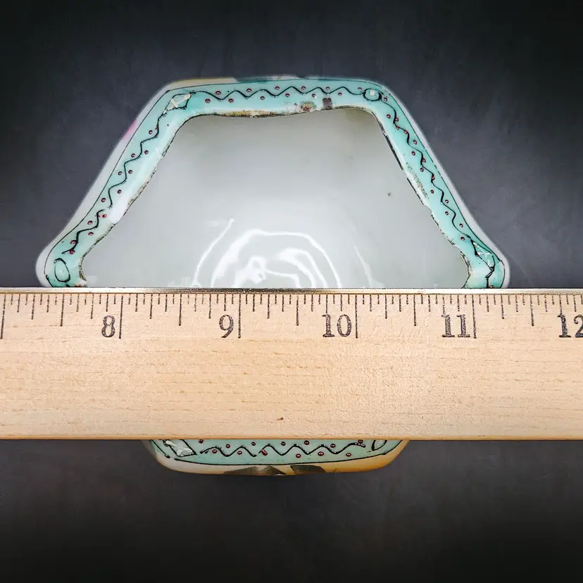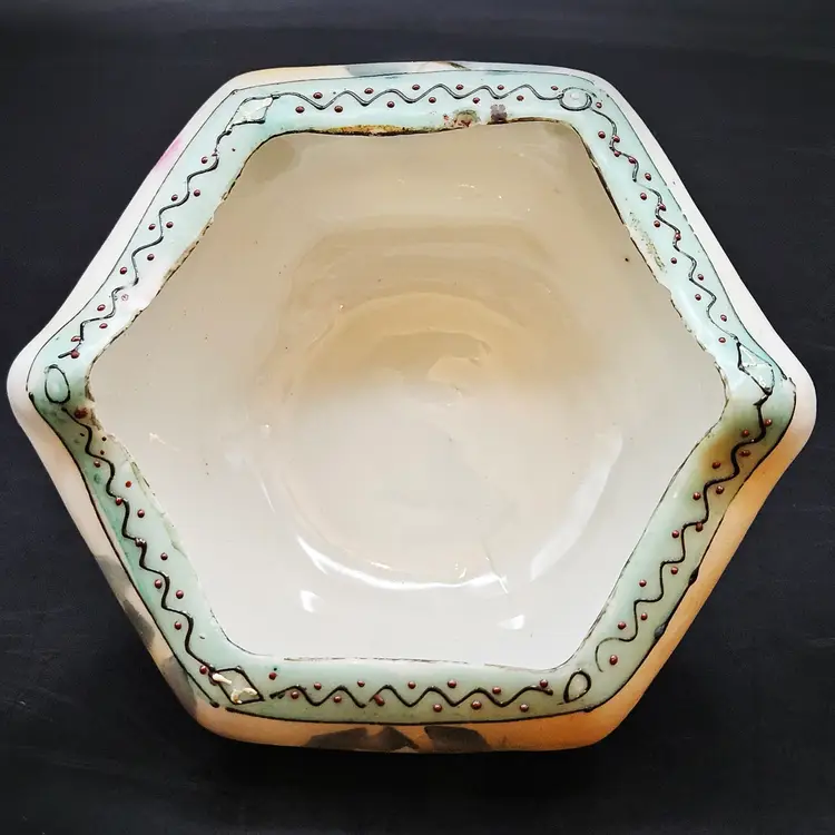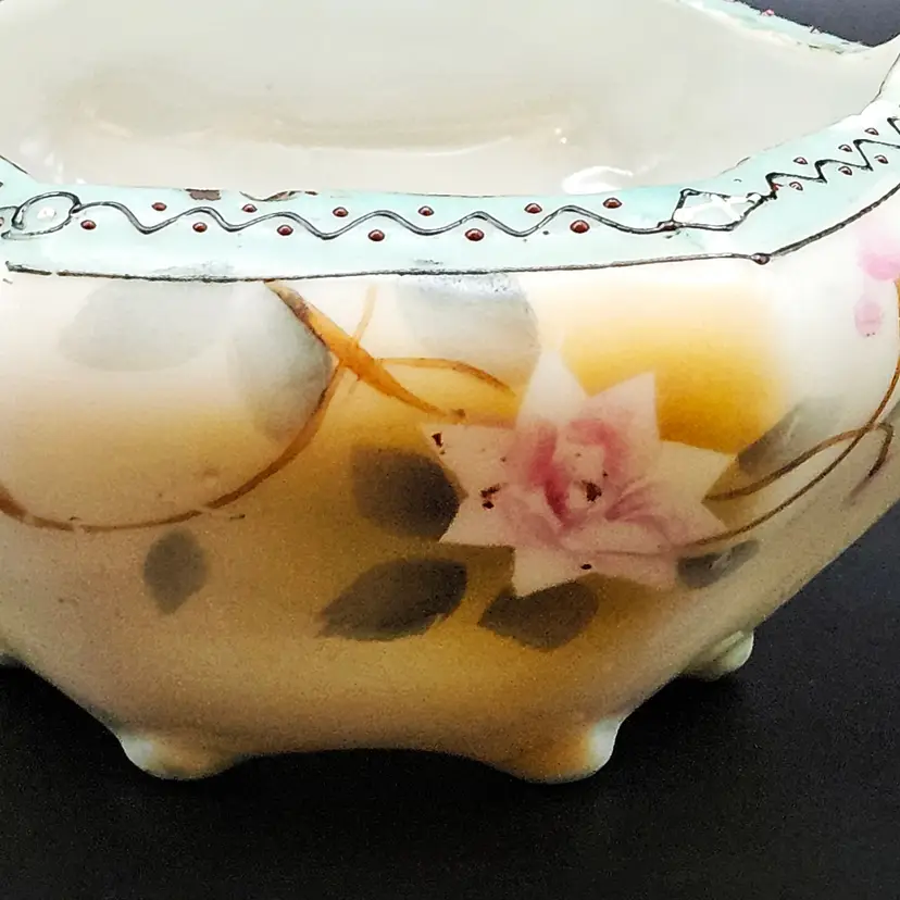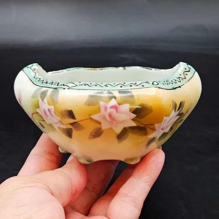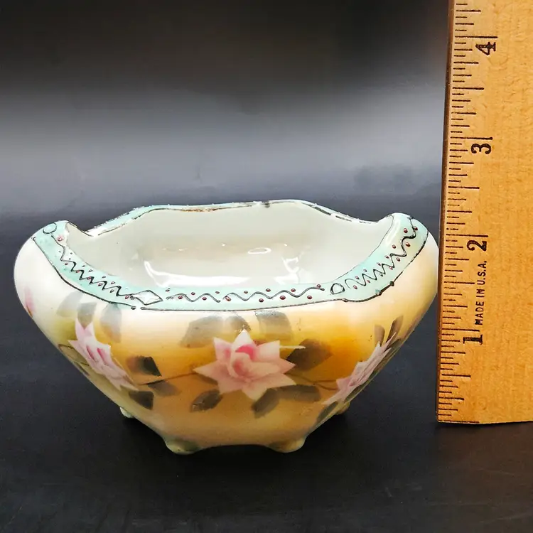 Beautiful vintage hand-painted porcelain bowl, likely Nippon (Japan), dating c.1891–1921. Features delicate pink roses on a soft yellow/cream lusterware ground with a scalloped, hexagonal form. The rim is accented in pale blue with raised moriage beading and fine detailing. Stands on four small feet, ideal as a nut dish, candy bowl, or trinket holder. Classic Art Nouveau/early Art Deco export style.