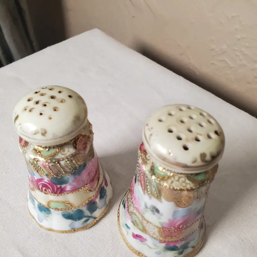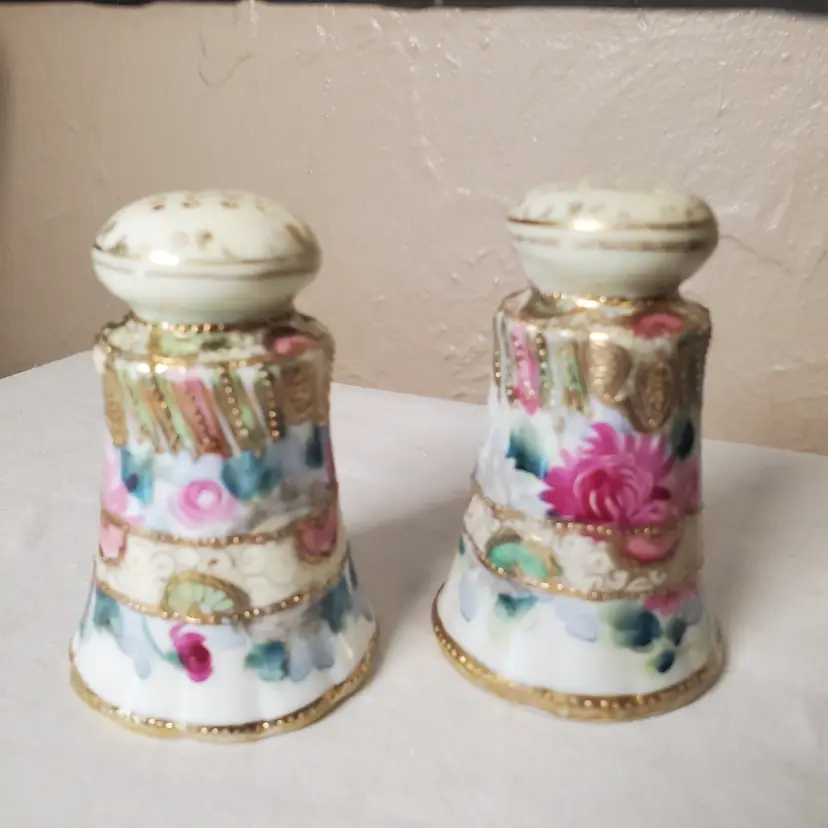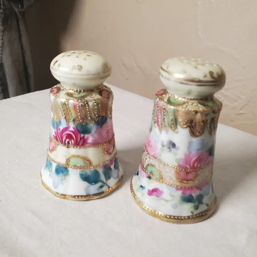 A gorgeous pair of antique Nippon hand painted salt and pepper shakers. They have some wear of the paint on the top edges, but otherwise in nice condition. 3 1/2" tall. 2 1/4" diameter at base. Will need cork replacement on bottom to use functionally. Unmarked, but very similar to multiple other sets that date these before 1921.