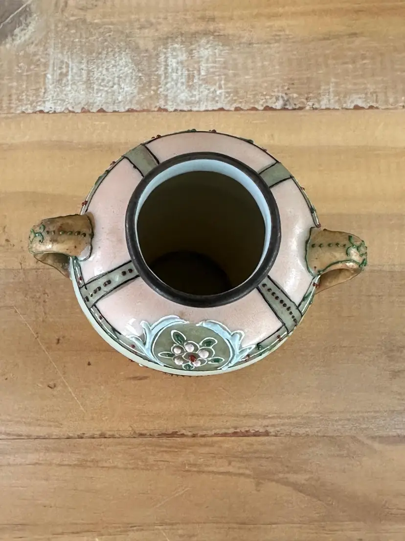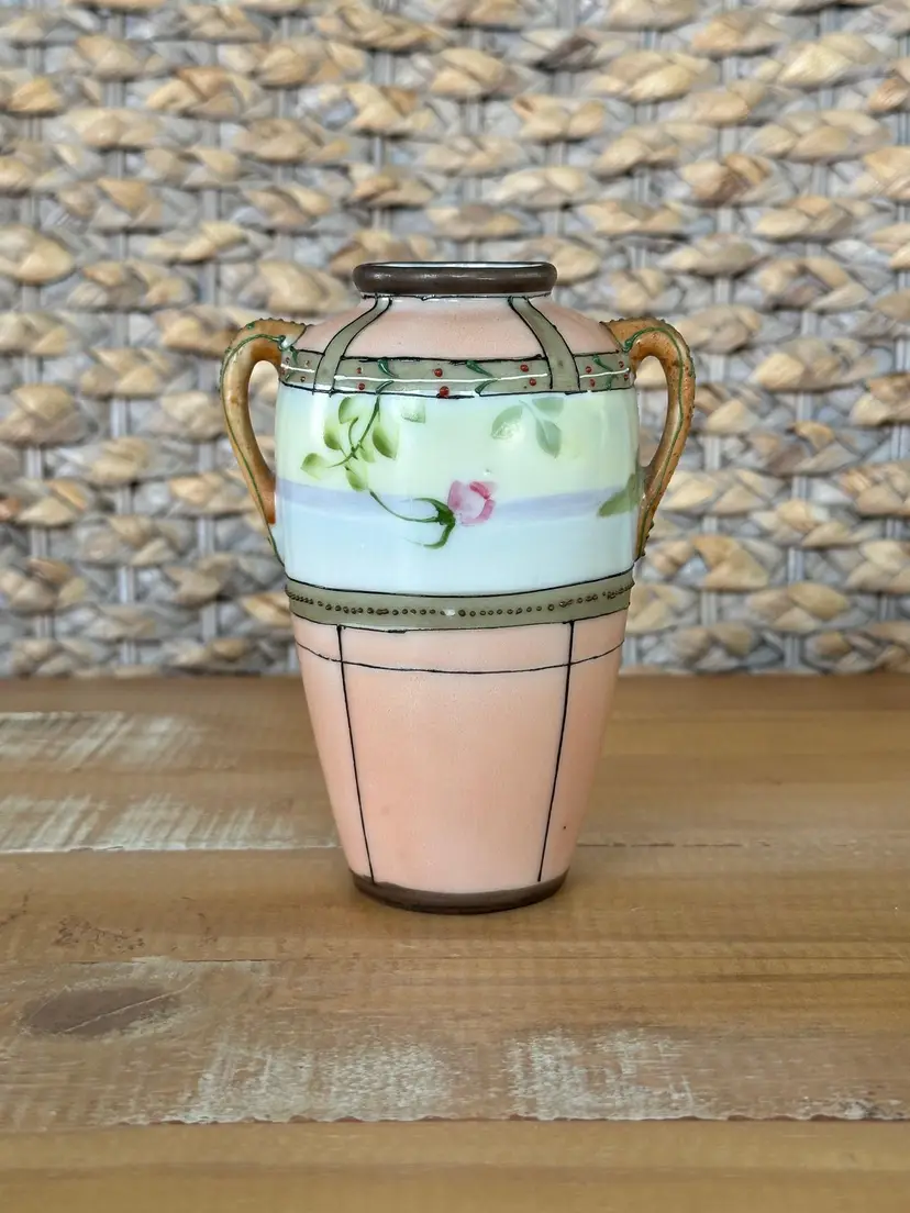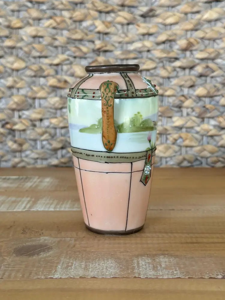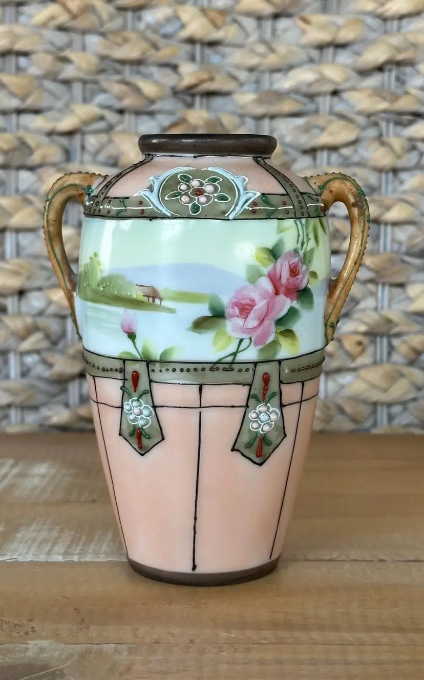 This exquisite antique porcelain vase features intricate hand-painted floral and scenic designs. The delicate pink roses and serene landscape add a touch of elegance, while the ornate handles and detailed accents make it a standout piece. Perfect for displaying flowers or as a decorative item in your home. W: 4" L: 3" H: 5"