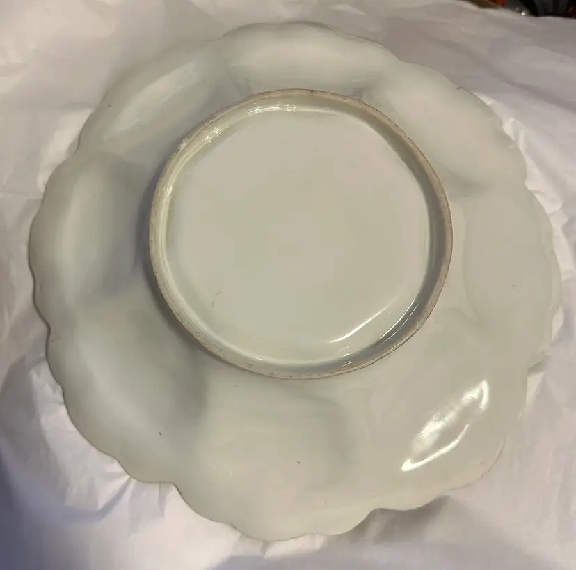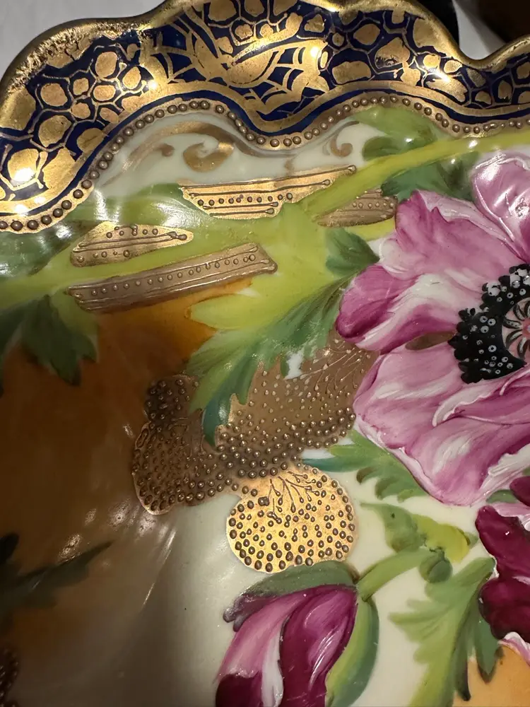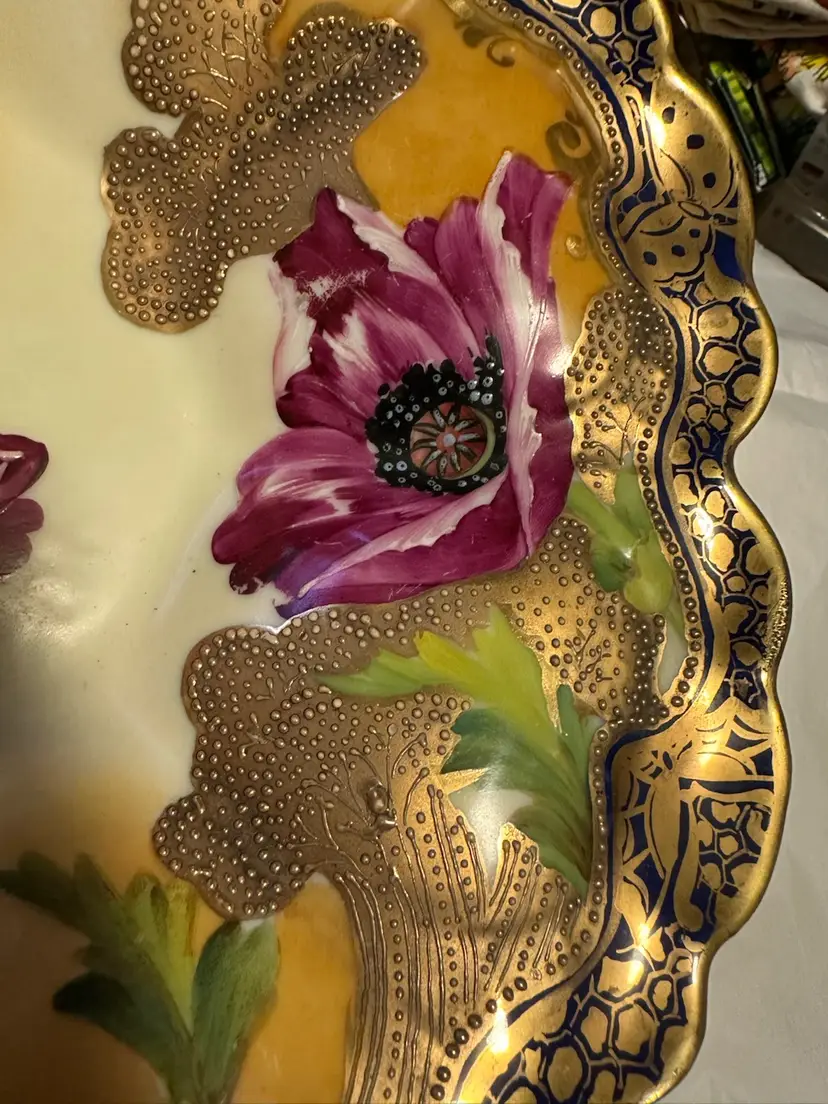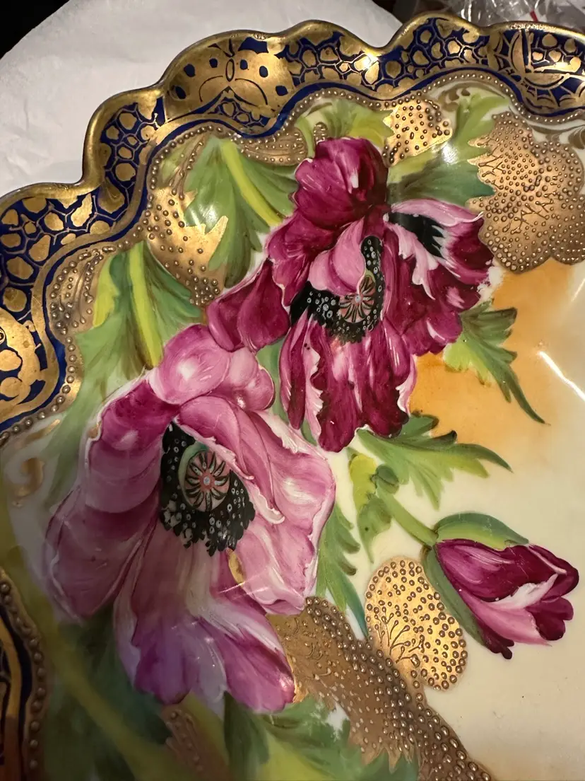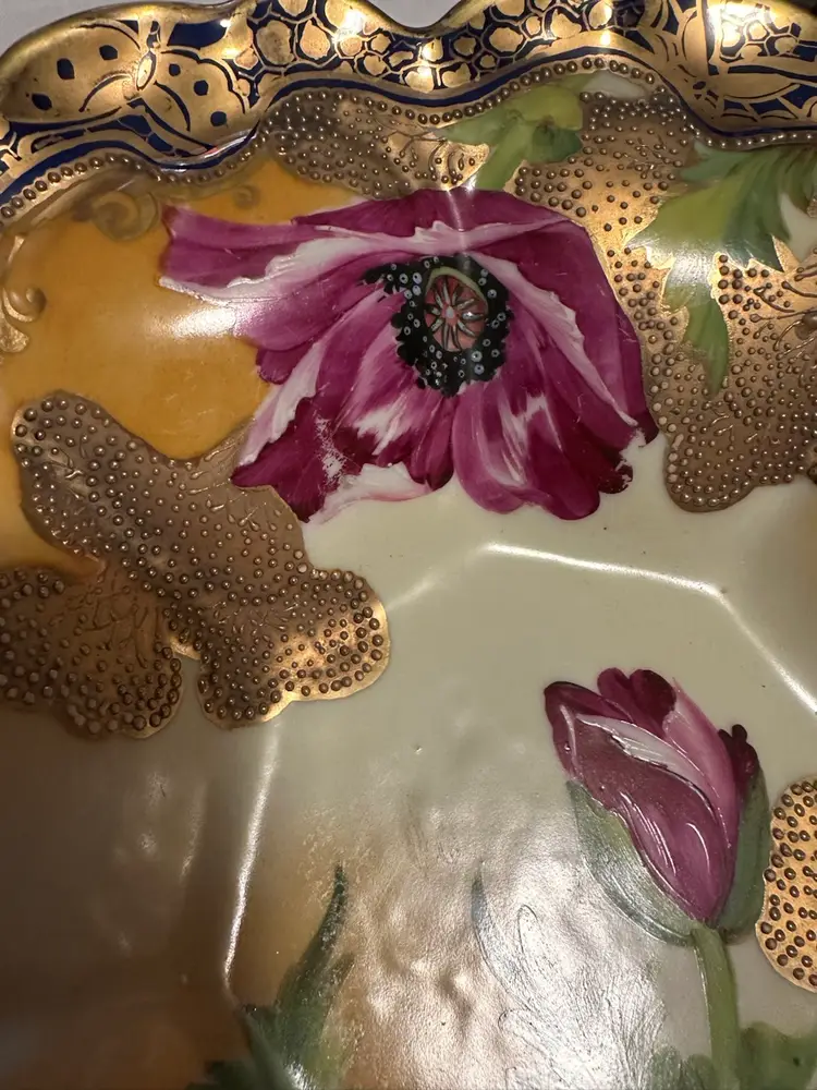 Lovely antique hand painted Nippon porcelain bowl. It is painted with poppy flowers and has gold beading throughout. It has a scalloped edge painted cobalt blue and gold. It measures 11” in diameter. Very good condition, no chips, cracks or repairs.