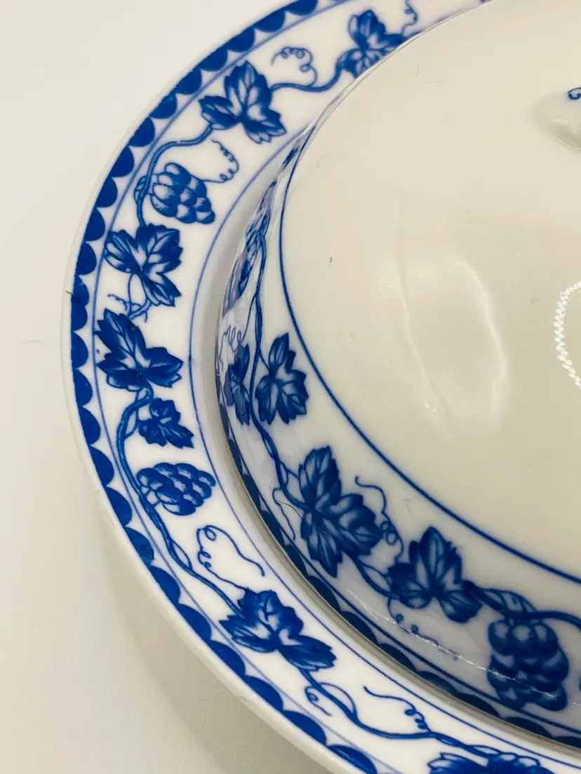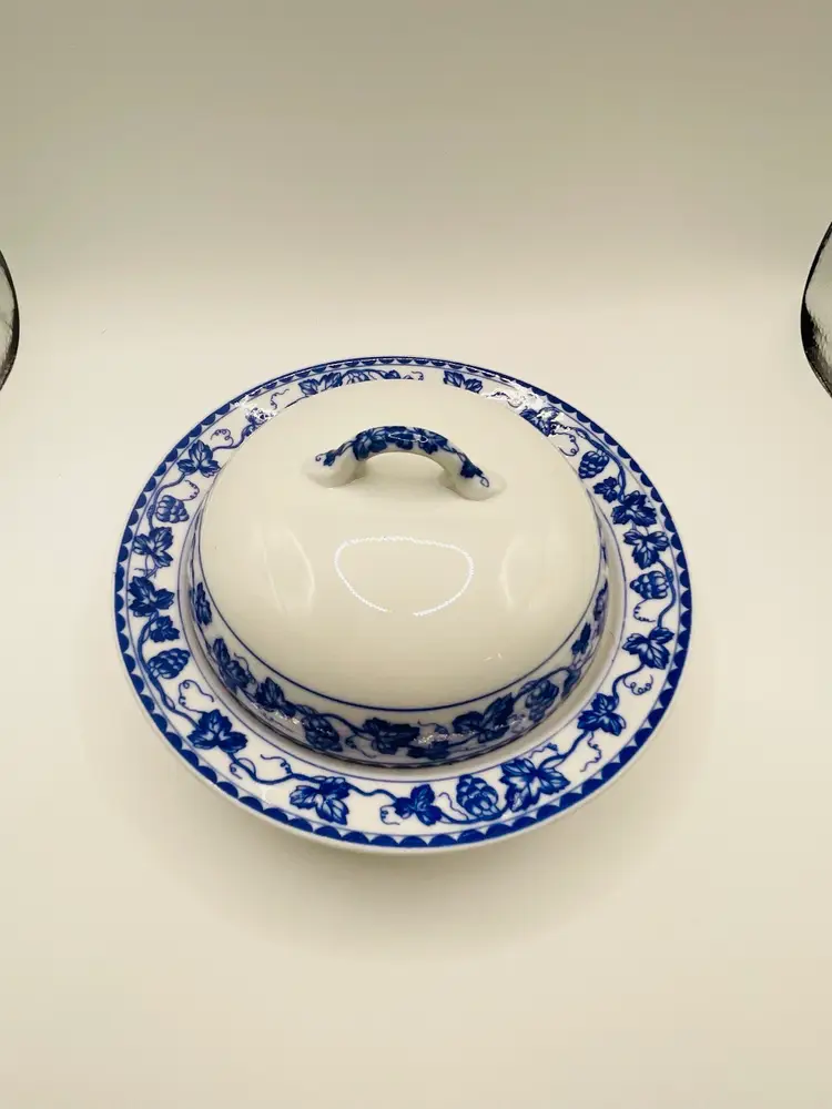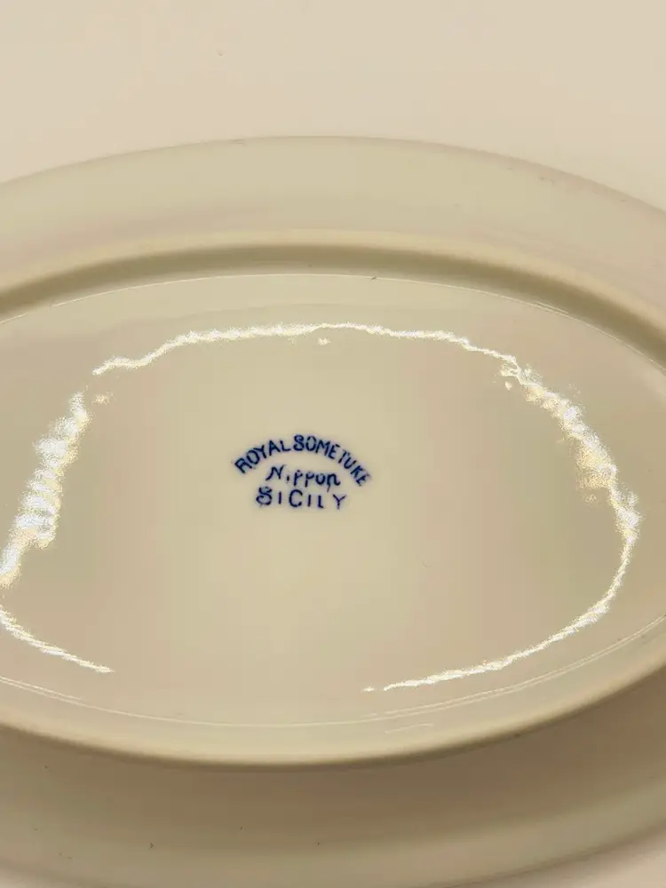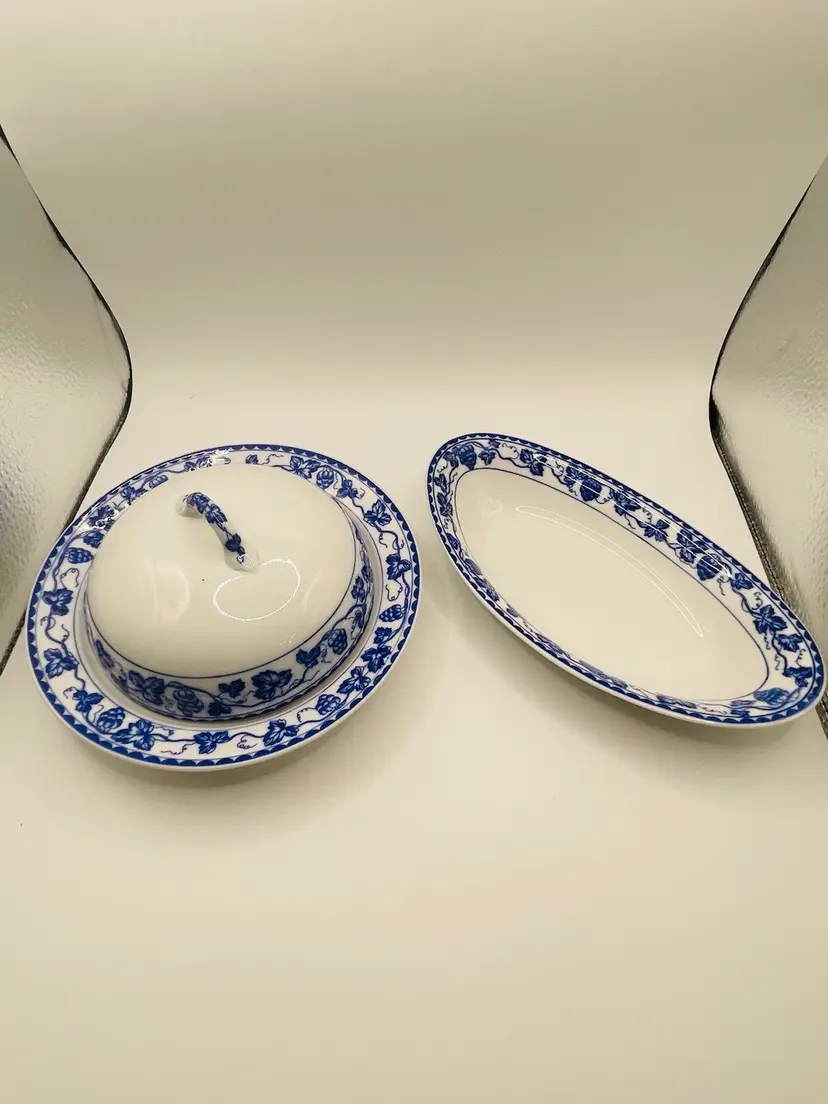 Antique Nippon Porcelain Dishes. This set includes a Royal Sometuke covered butter/cheese dish and a small serving dish. These are the Sicily Pattern (picture it!) that features blue and white grapevines. This pattern was produced between 1906 and 1921! There are no chips or cracks. The covered dish stands approximately 4 inches tall and the serving dish is approximately 7 inches long. Pricing includes both pieces.