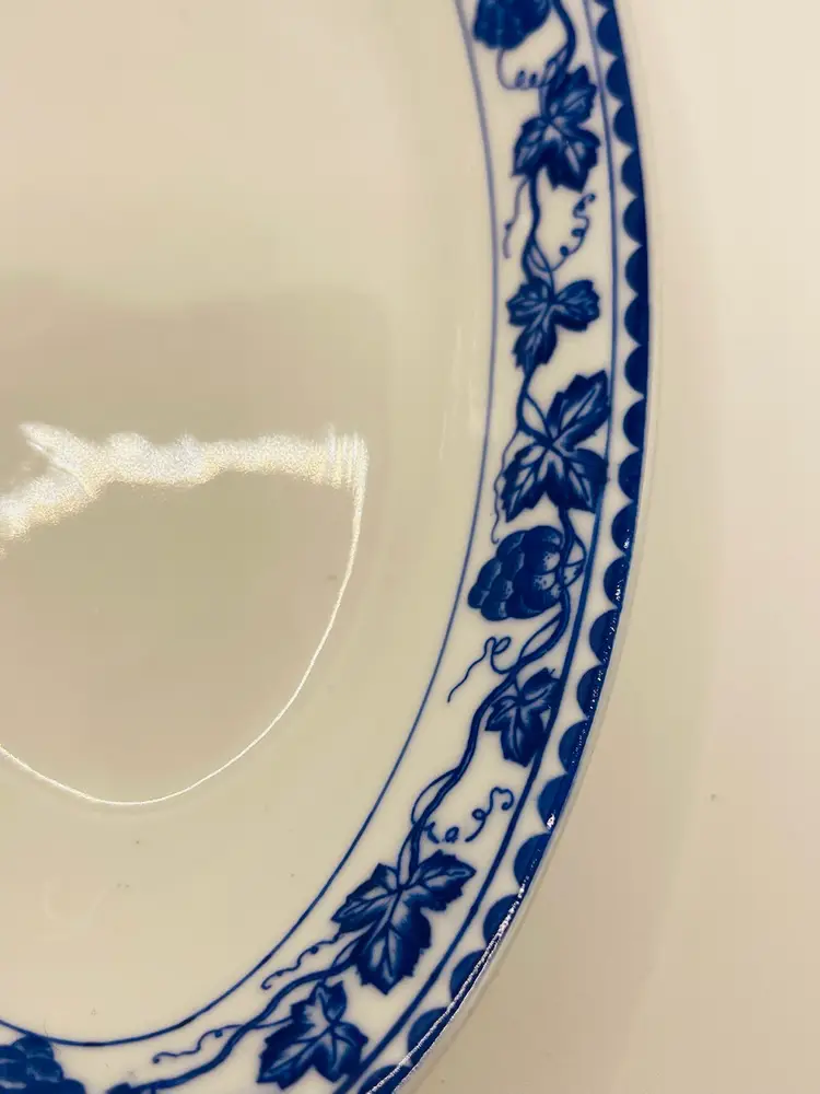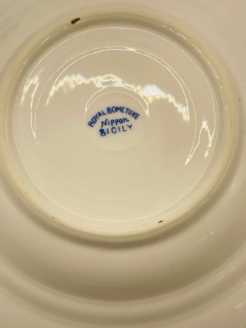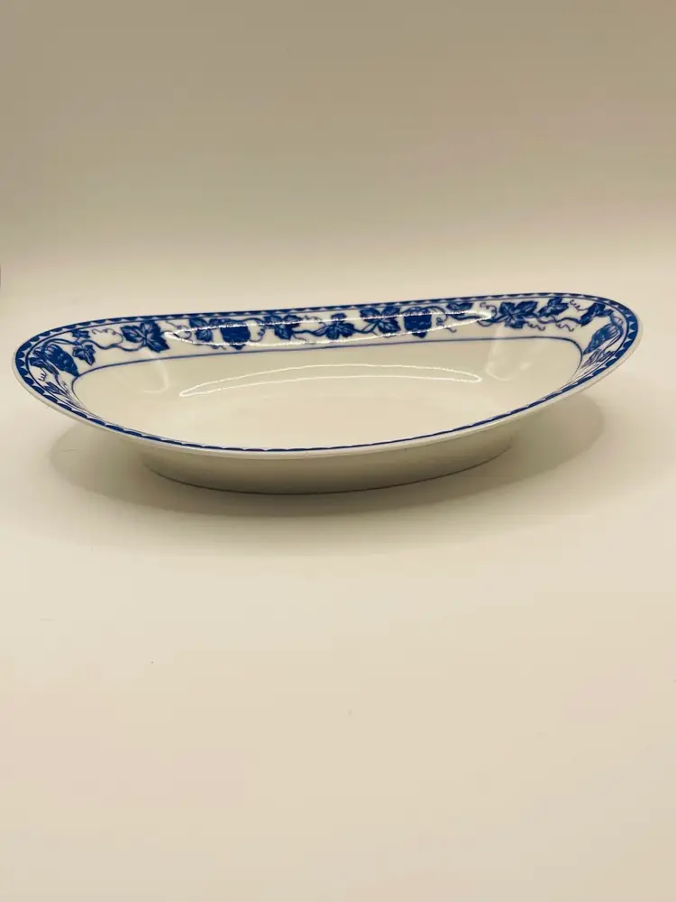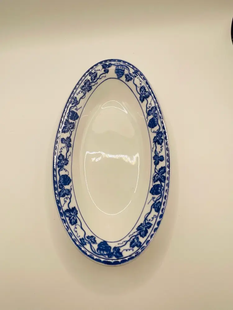 Antique Nippon Porcelain Dishes. This set includes a Royal Sometuke covered butter/cheese dish and a small serving dish. These are the Sicily Pattern (picture it!) that features blue and white grapevines. This pattern was produced between 1906 and 1921! There are no chips or cracks. The covered dish stands approximately 4 inches tall and the serving dish is approximately 7 inches long. Pricing includes both pieces.