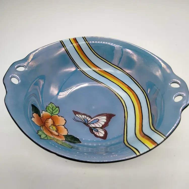 Antique Noritake Morimura Art Deco Lusterware 7" Handled Bowl Flower & Butterfly. Circa 1921-1929. This is 7 inches in diameter and 1.75 inches tall at rim. This is a preowned antique. No chips cracks or fleabites, Unique uncommon Butterfly design. No damage to design. Excellent condition. Ships USPS domestically and international Shipping globally