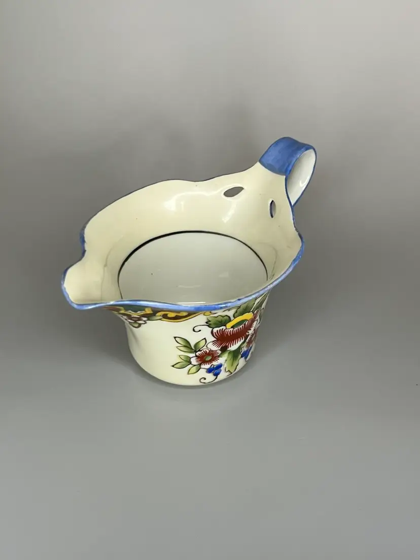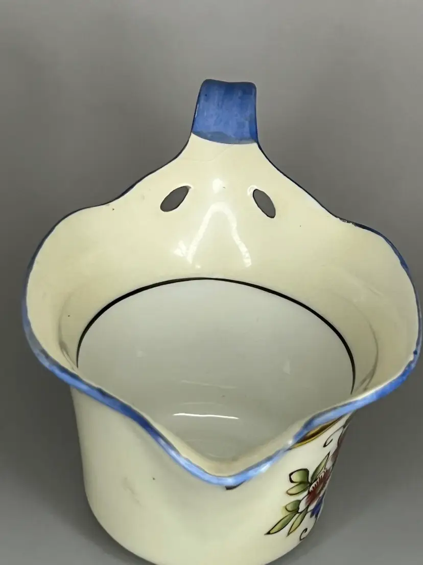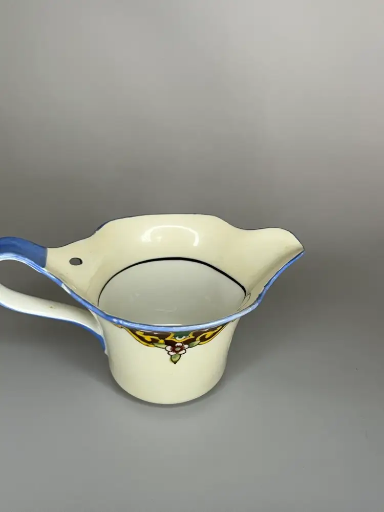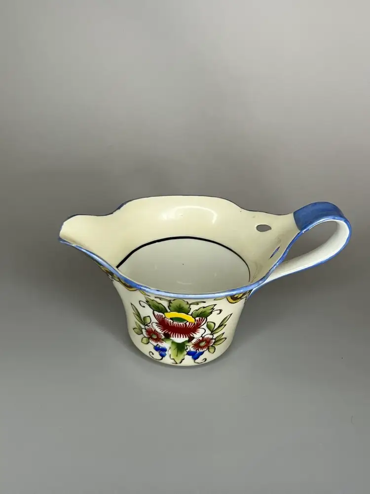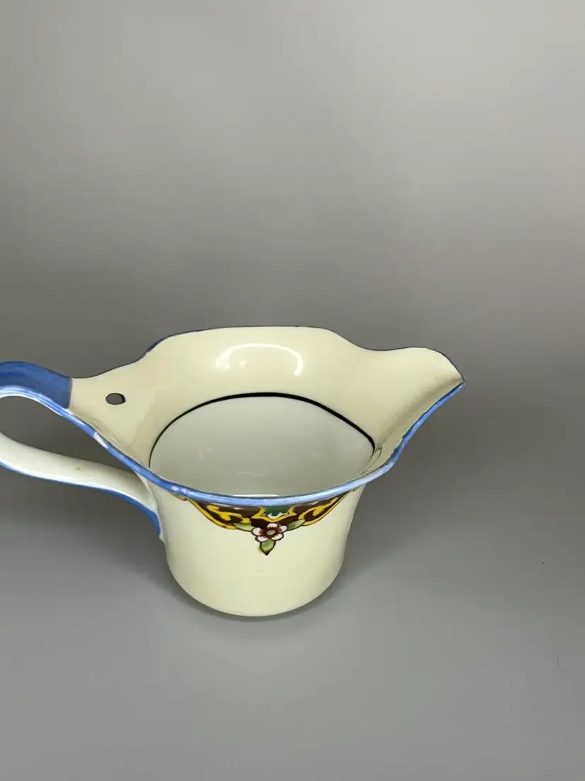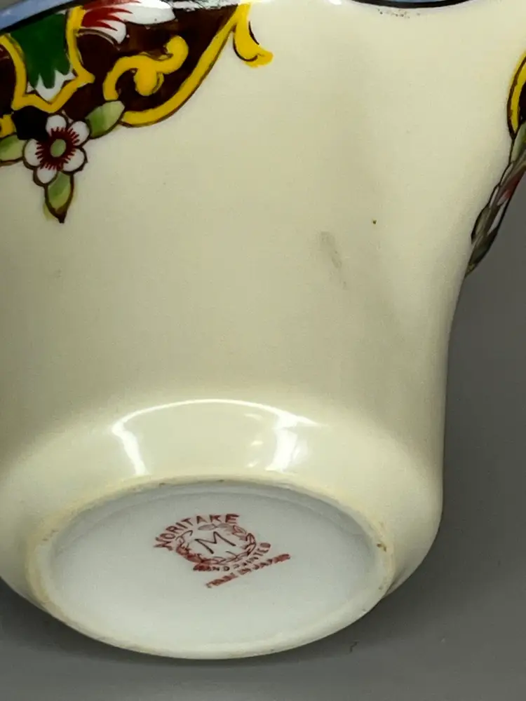 This petite Noritake lusterware creamer has been beautifully maintained. This piece is over 100 years old as indicated by the “M” marking in the center of the wreath, dating the piece between 1911 and 1921. The pitcher measures 5.25" long (includes handle) x 3" wide x 2.25" tall. It is has vibrant colors that with a hand painted design. This is a very collectible piece.