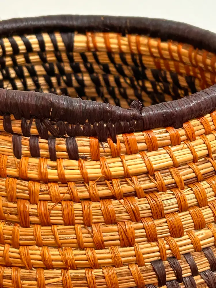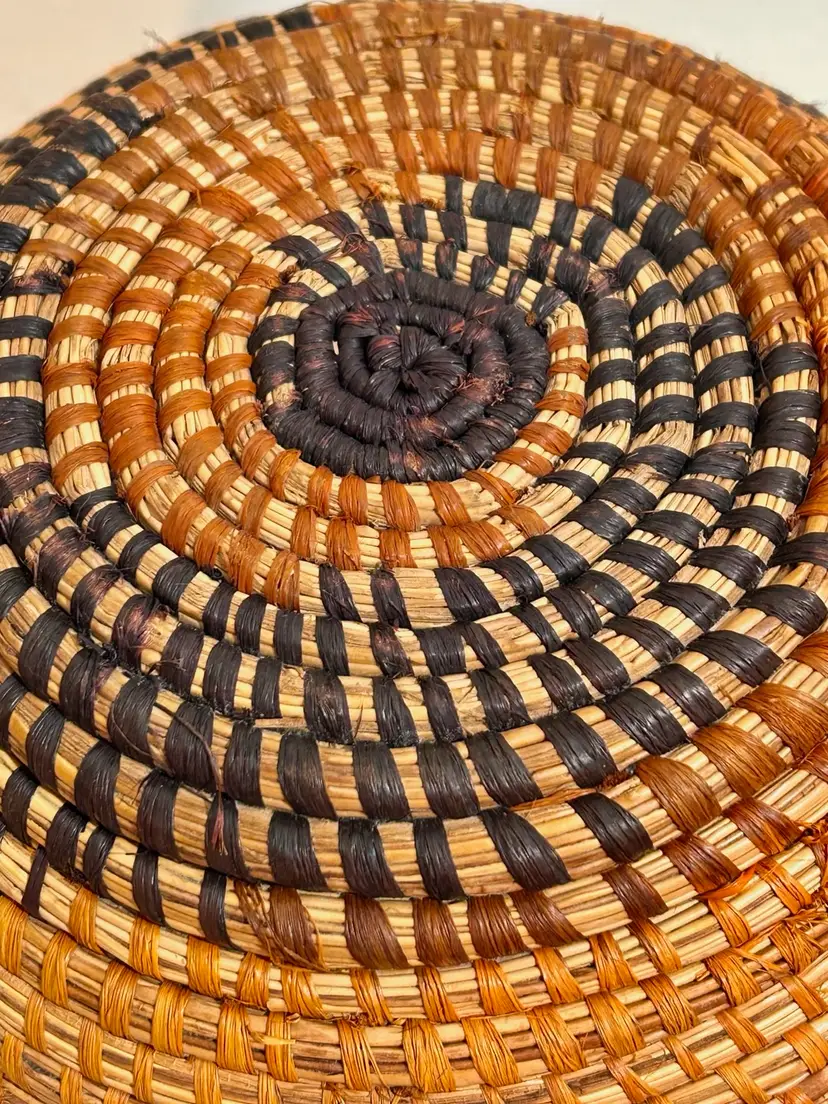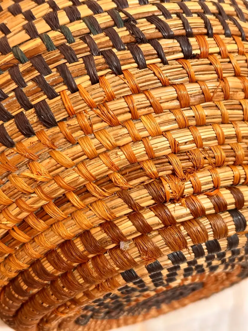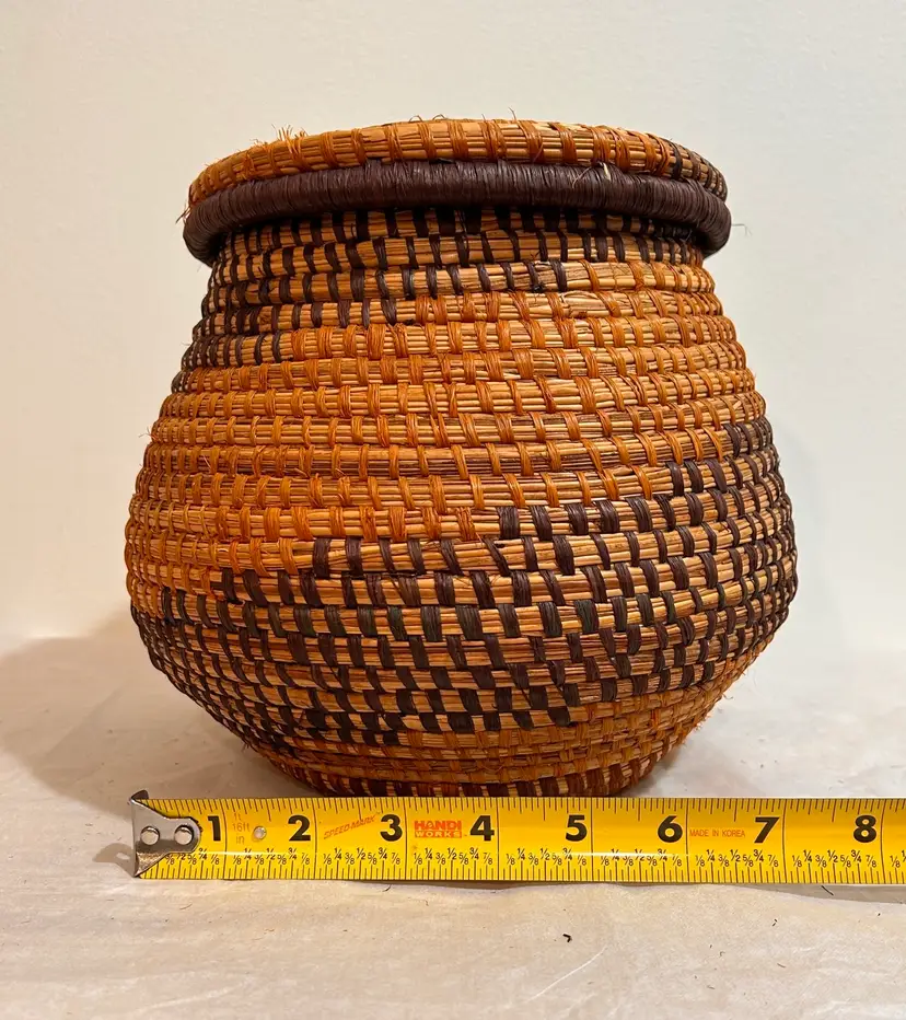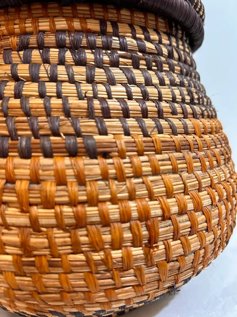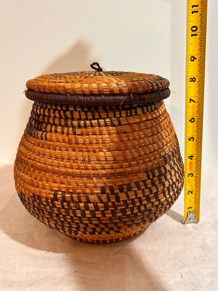 This intricately crafted basket is of Native Northeast American Indian Culture. Materials used are from pliable, strong splints (thin layers) carefully separated from the wood of the Black and Brown Ash trees. Key Characteristics: The material itself has an inherent "ash" characteristic to its natural woody scent. The basket colors creates a beautiful contrast of light and dark ash wood. The ash splint basket is made from thin, pliable strips of each wood creating delicate yet strong baskets, sometimes so fine they resemble threads. The culture traditionally pounded ash logs to separate these thin, flexible threads achieving very fine strands for weaving. Its provenance from a Northeast State flea market adds a unique and authentic touch to this collectible item, making it a valuable piece for collectors interested in Native American art and craftsmanship. This basket has been well kept overtime. Please see all pictures for an additional description of this fine basket including measurements. **my listings consist of other Cultural Collections that may possibly interest you.