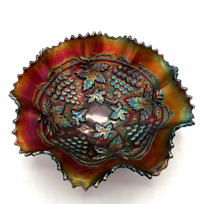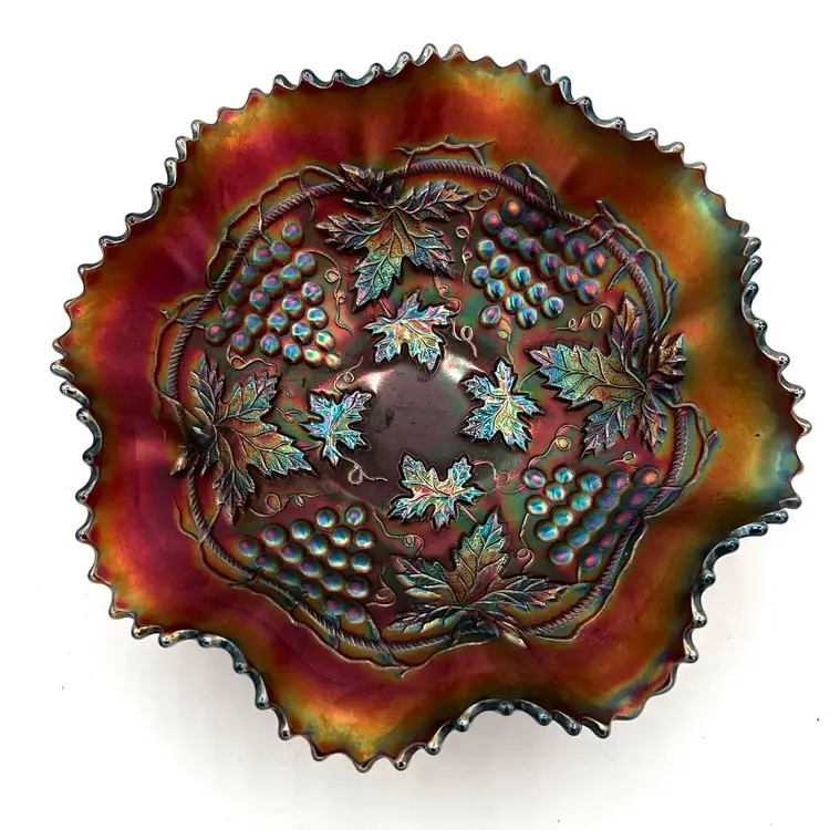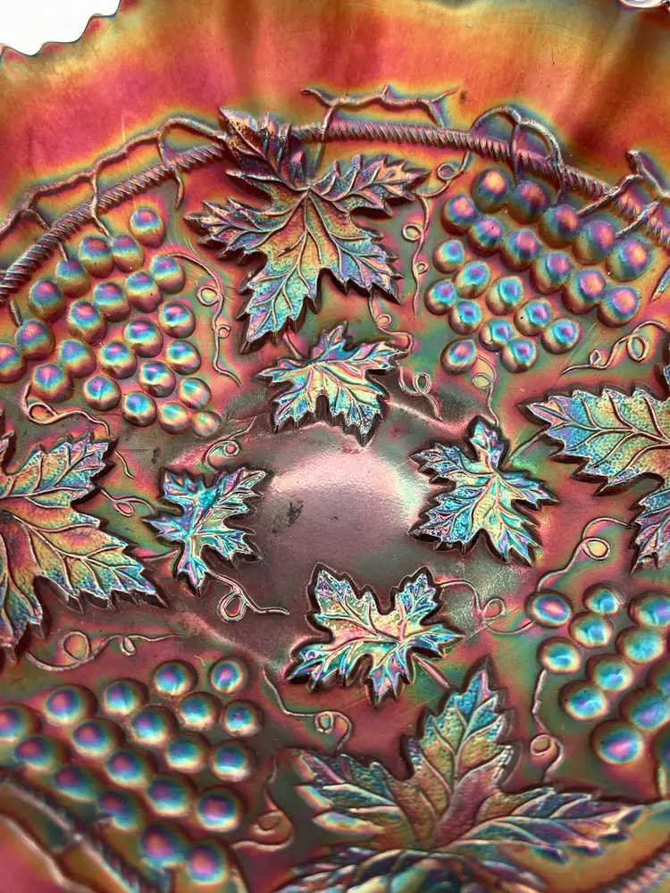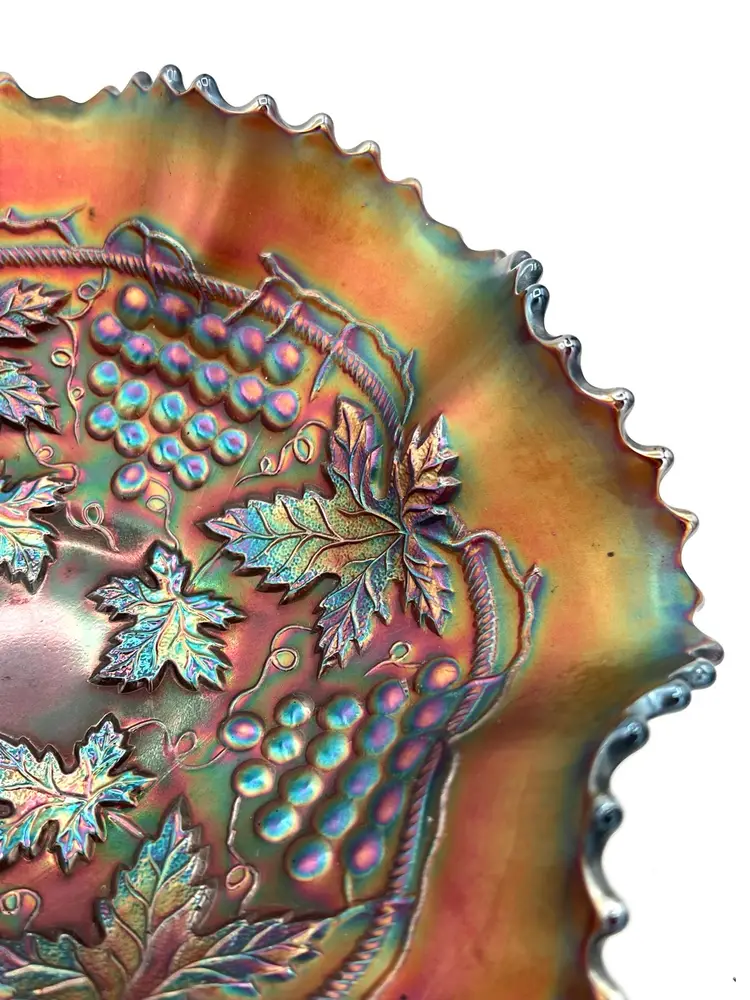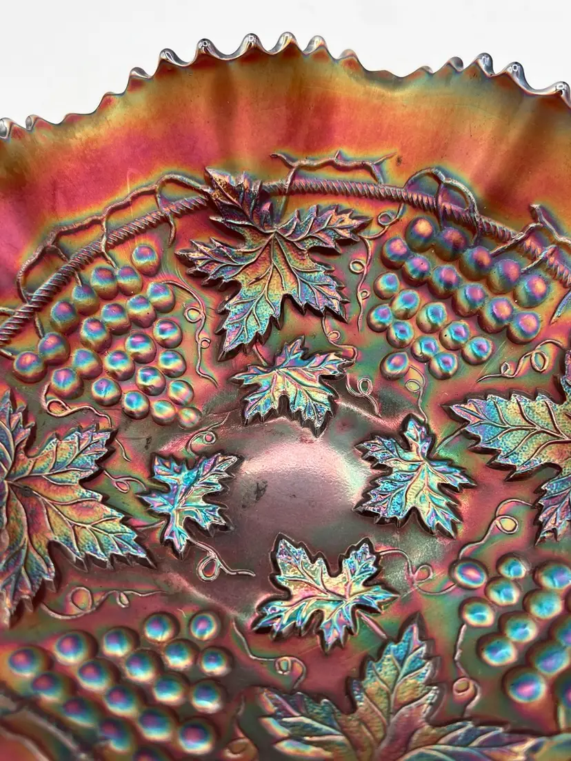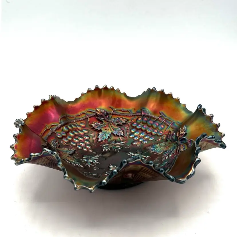 Antique Northwood Carnival Glass Grapes & Cable Basketweave Ruffled Bowl Amethyst