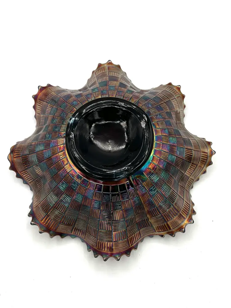 An absolutely stunning carnival glass bowl by Northwood Company. The bowl measures 9" across. The bowl has the basket weave exterior and eight ruffle points with extraordinary colors and iridescence, referred to as Electric Purple or Electric Amethyst, the bowl has fabulous bright purples and blues with mixed in golds and pinks, turning it around you can see the brighter almost red/purple from the underneath, just gorgeous!! Executed in the Grape and Cable Pattern • Excellent pre-owned antique condition. • Circa 1900s.