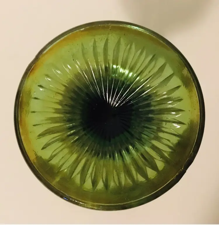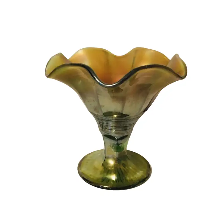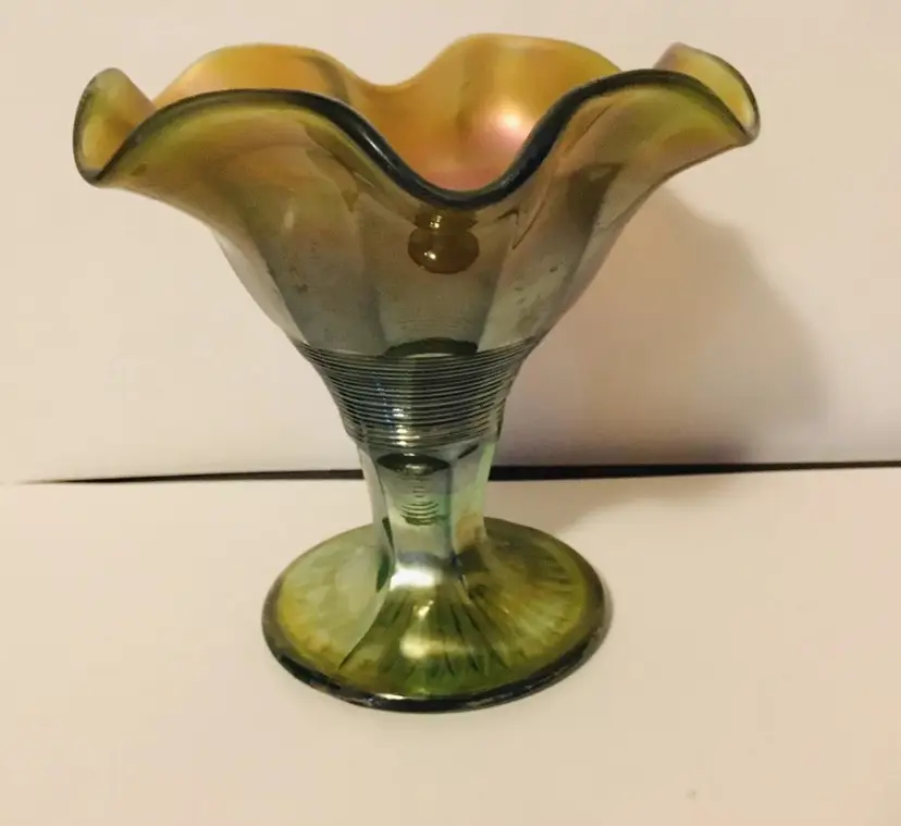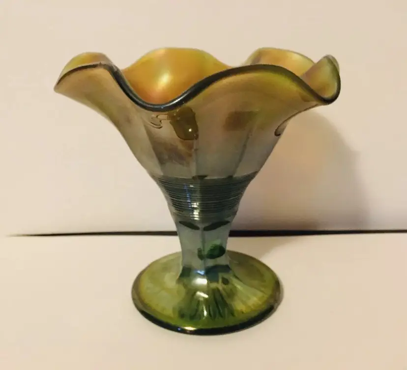 Green glass with marigold iridescence. Bottom of compote is ribbed.