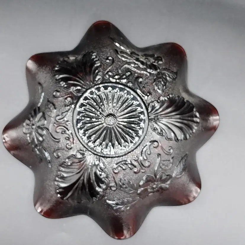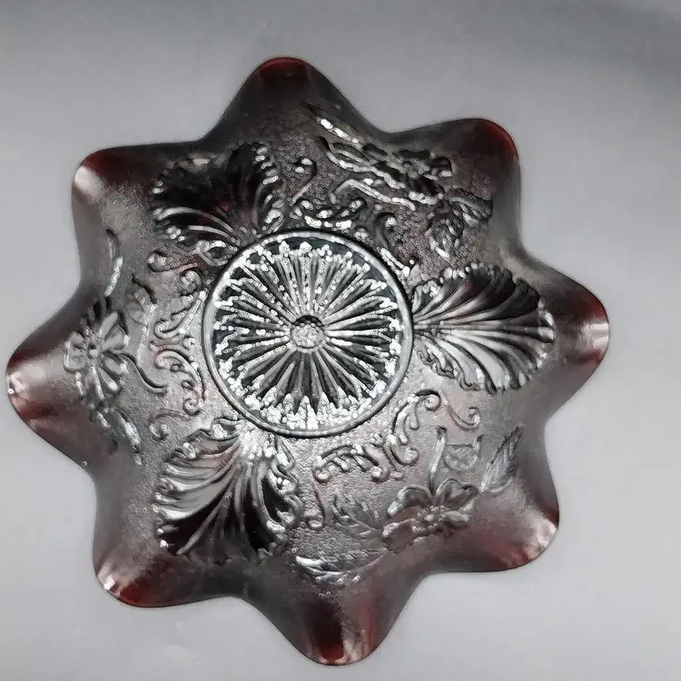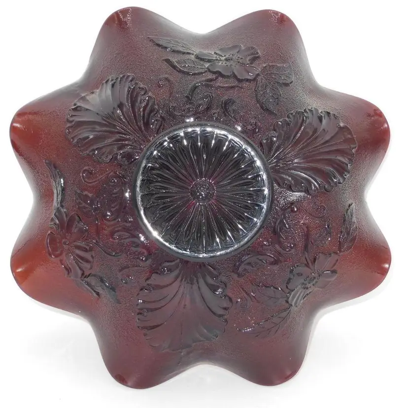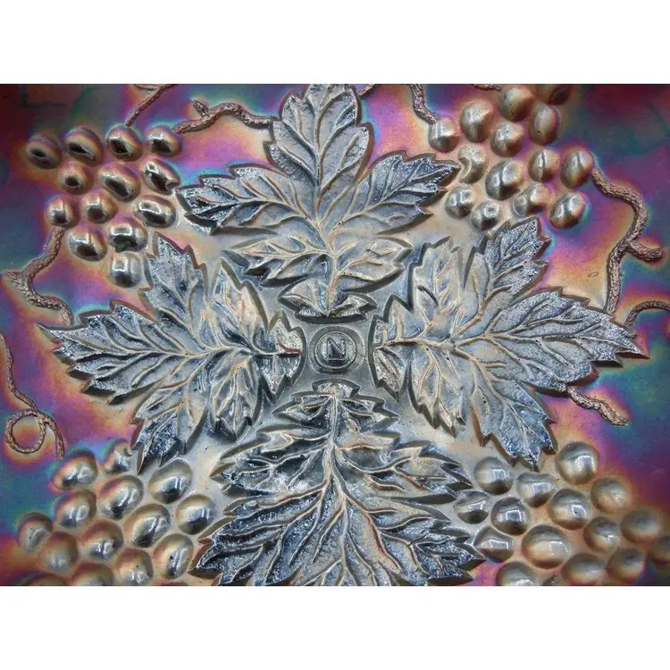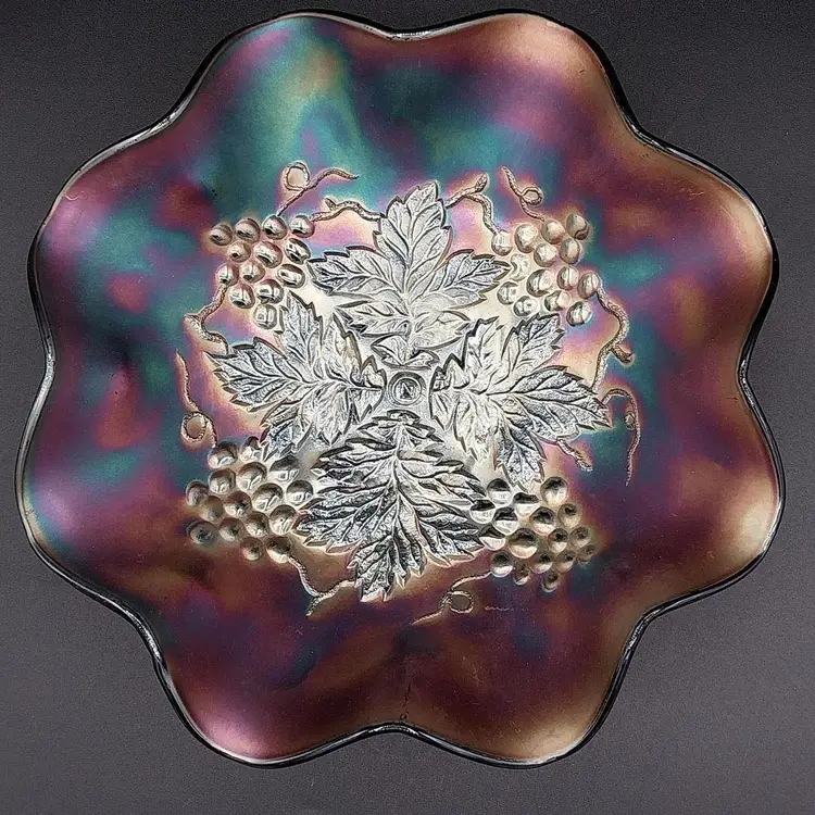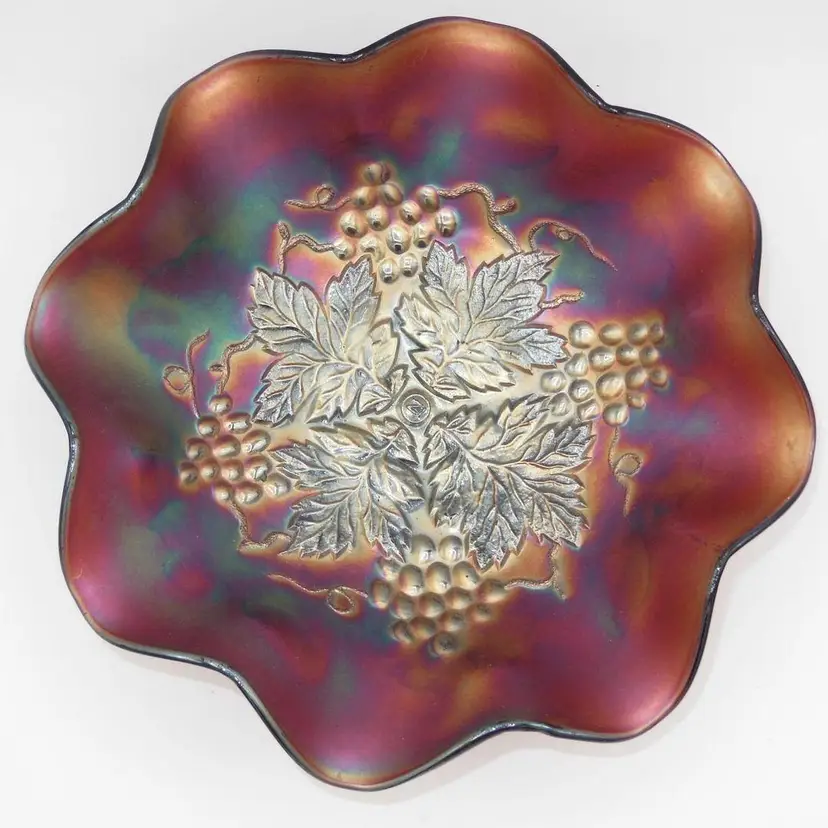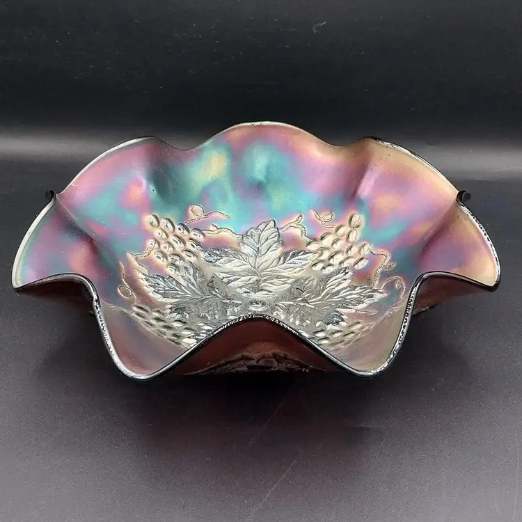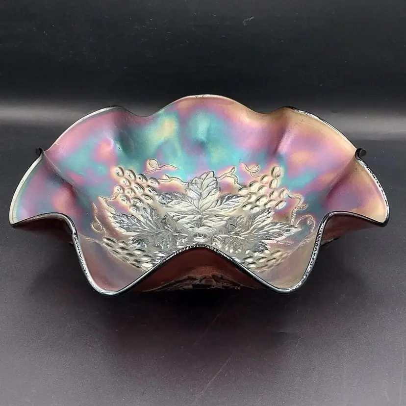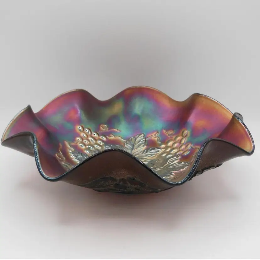This is a gorgeous, Antique Northwood, 'Grape Leaves'/ 'Blossom & Palms', Purple Amethyst Carnival, Ruffled Glass Bowl. Circa 1910-1912. The Grape Leaves pattern is inside the bowl and the Blossom & Palms pattern is on the reverse side. It measures: 9.0" diameter 2.75" high. It is in great condition. Please see all pics, as they are part of the description.