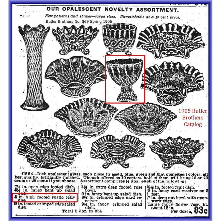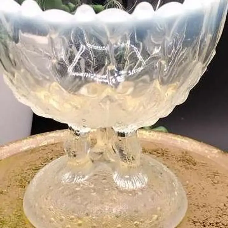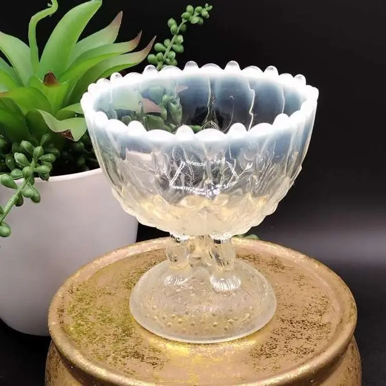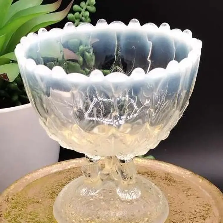 This antique Northwood compote is a beautiful addition to any collection. The opalescent glass, with its delicate hill vines pattern, is sure to catch the eye. The footed design adds an elegant touch, making it perfect for displaying or using as a jelly dish. The Northwoods brand is known for their high-quality glassware, and this piece is no exception. The white Opalescent color is versatile and can suit any decor style. Whether you're a collector or simply looking for a unique decorative piece, this compote is a must-have. This item was made in approx, circa 1905-1906 and has some scratches which some appear to be from the molding process.