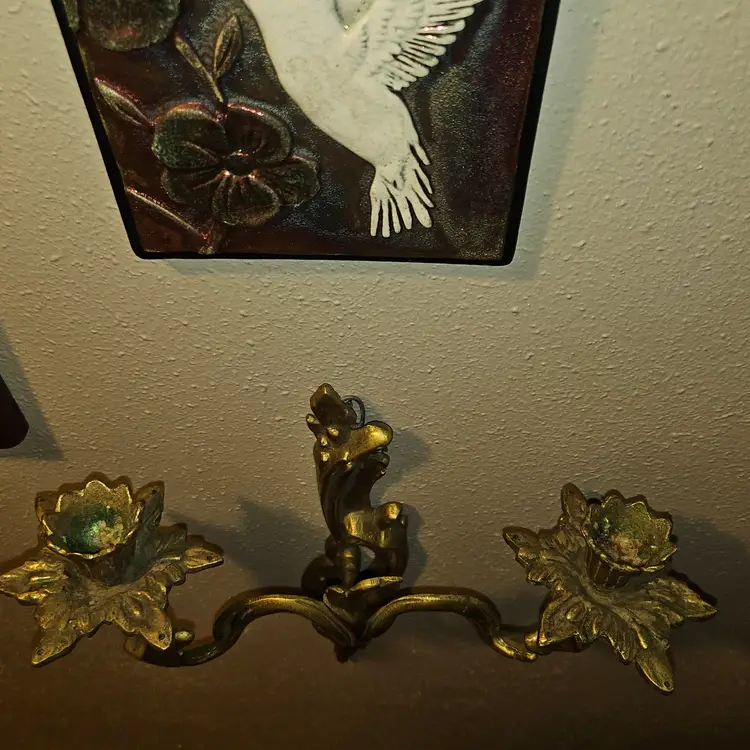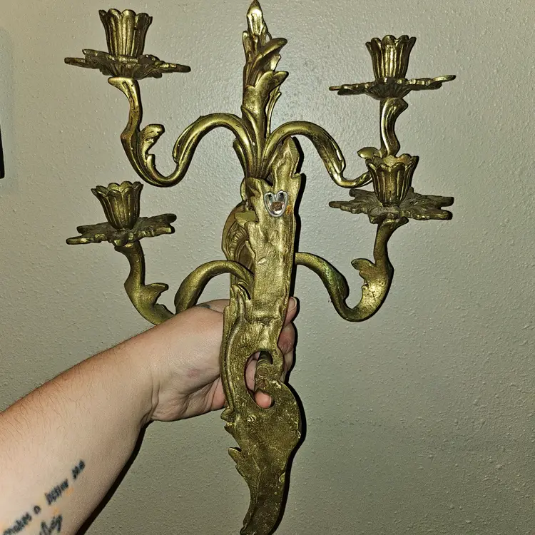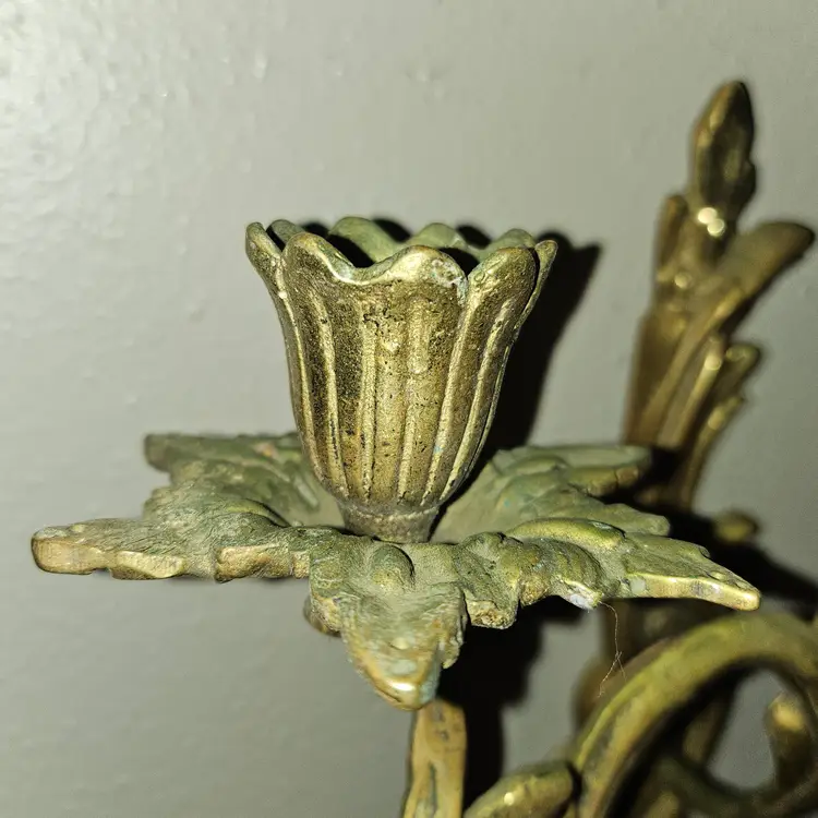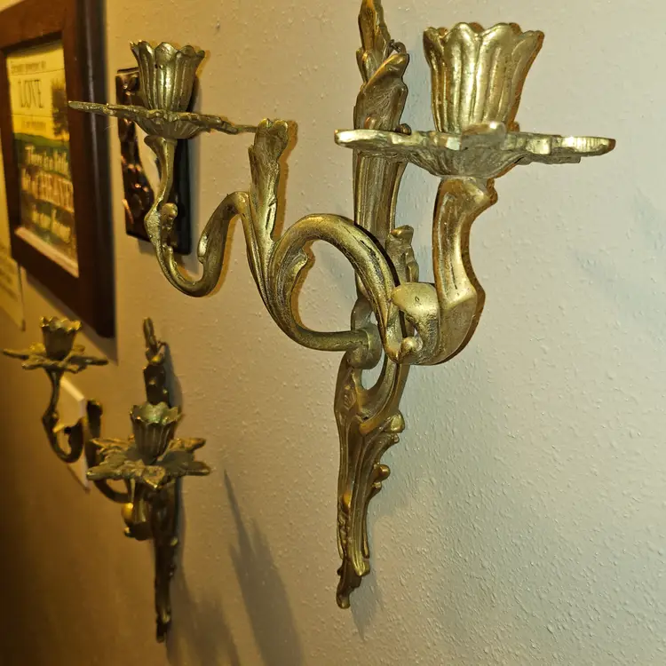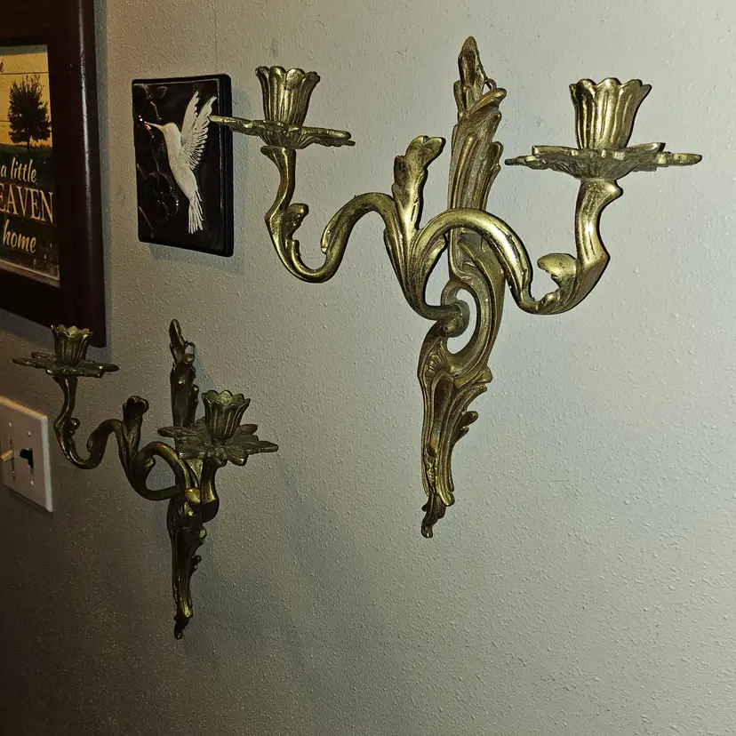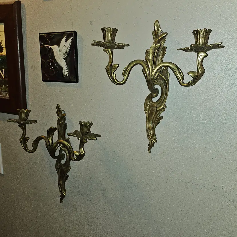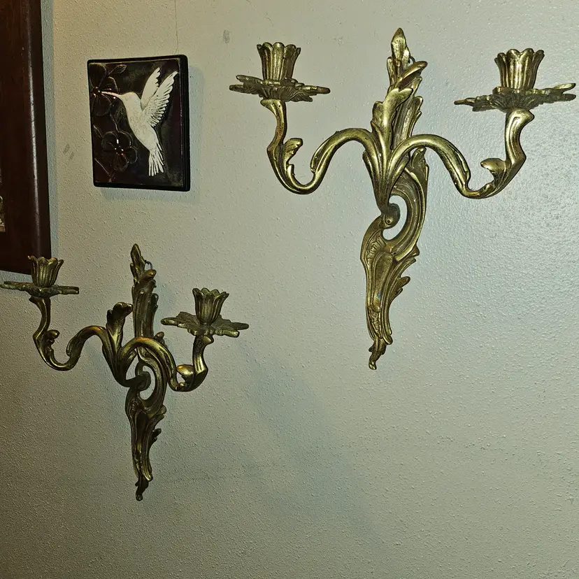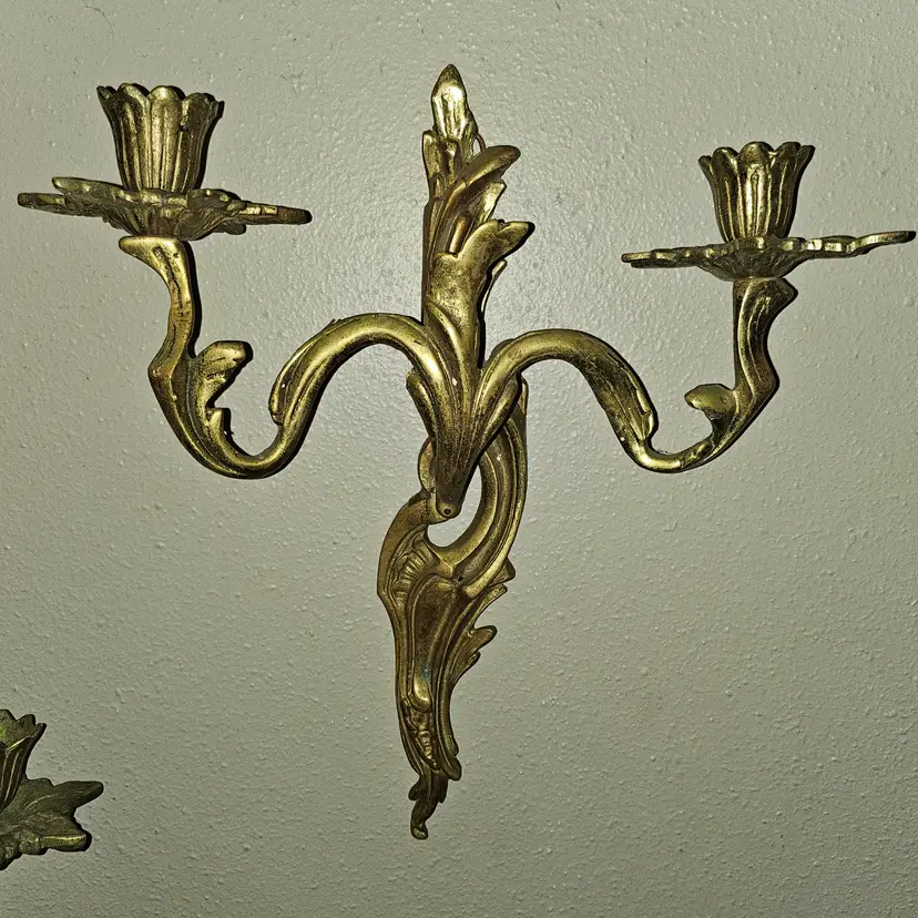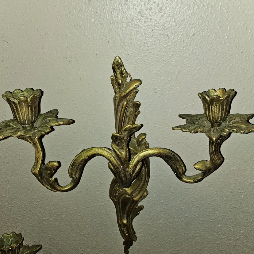 Antique 19th Century Solid brass double candle holder in a set of 2 wall sconces. Detailed and full of patina! Must see item! Total weight of 4lbs 8oz - Each one weighs 2lbs 2oz. Measure 12" Tall × 11" Wide × 4" Depth. Each has a small hook to hang them with. Absolutely STUNNING PIECES! As shown and described in the photos and listing description.
