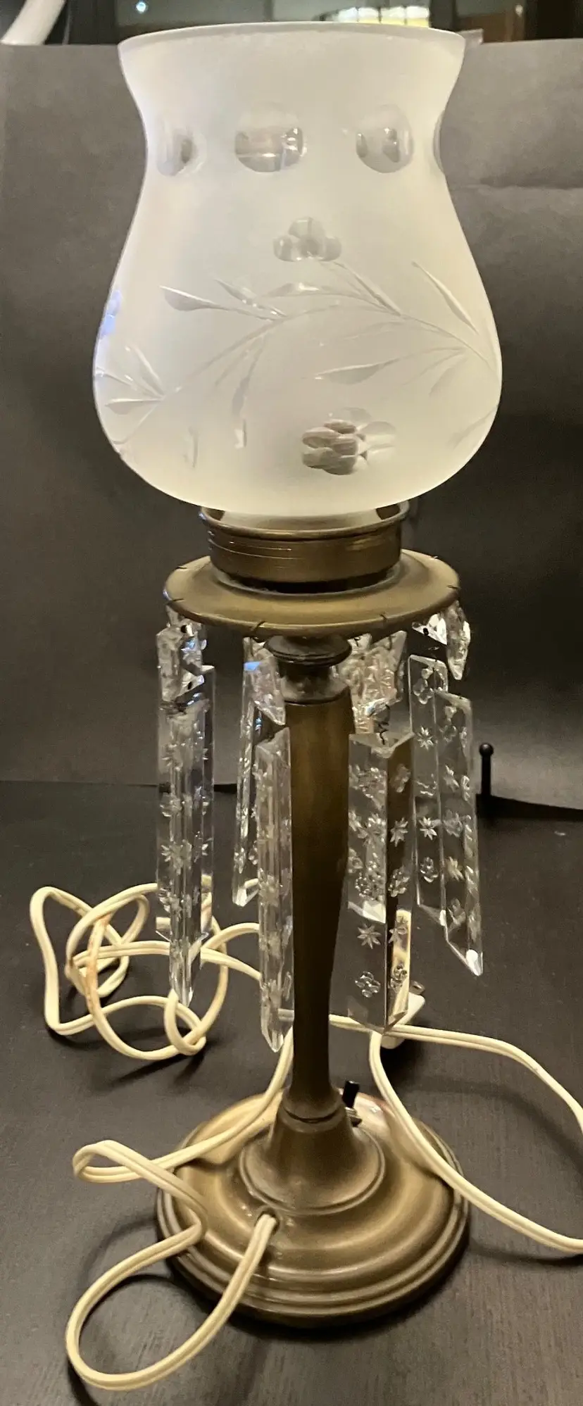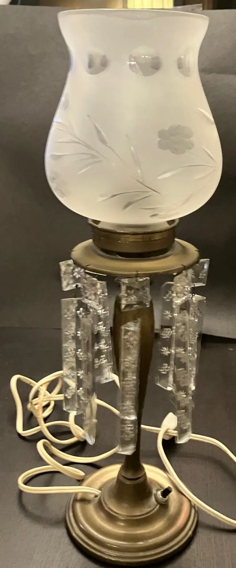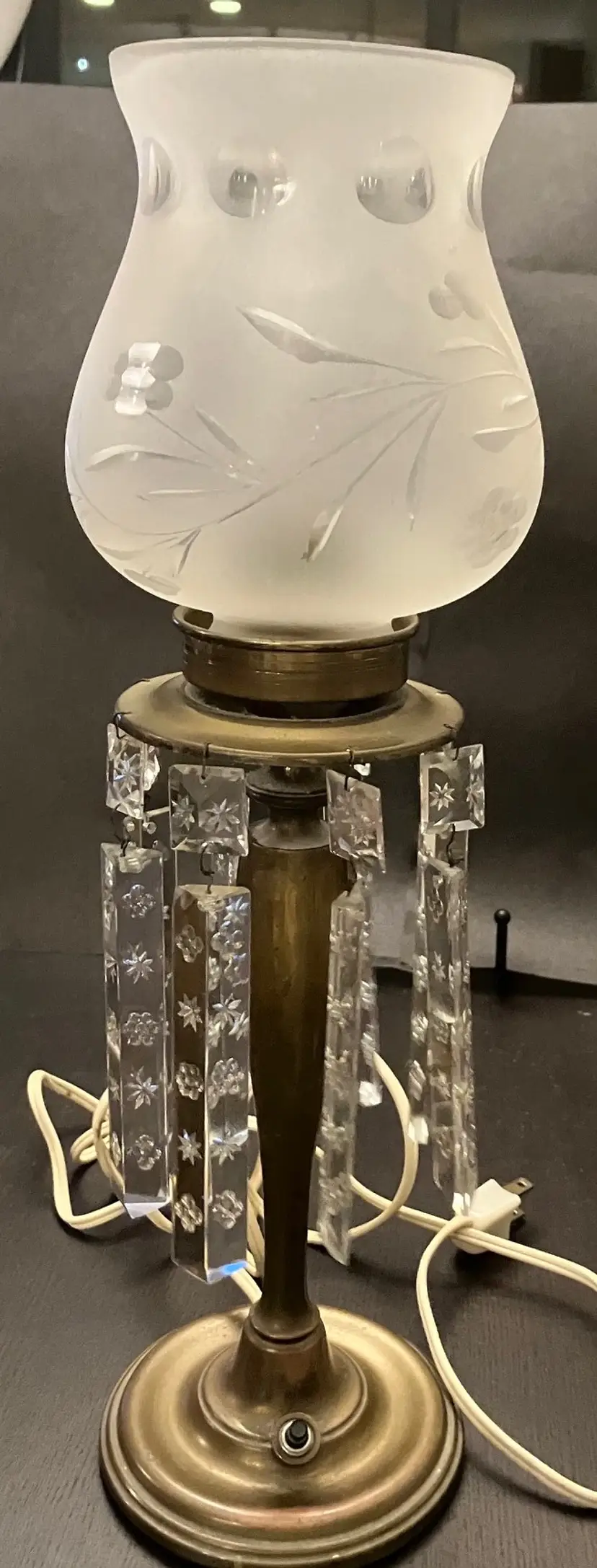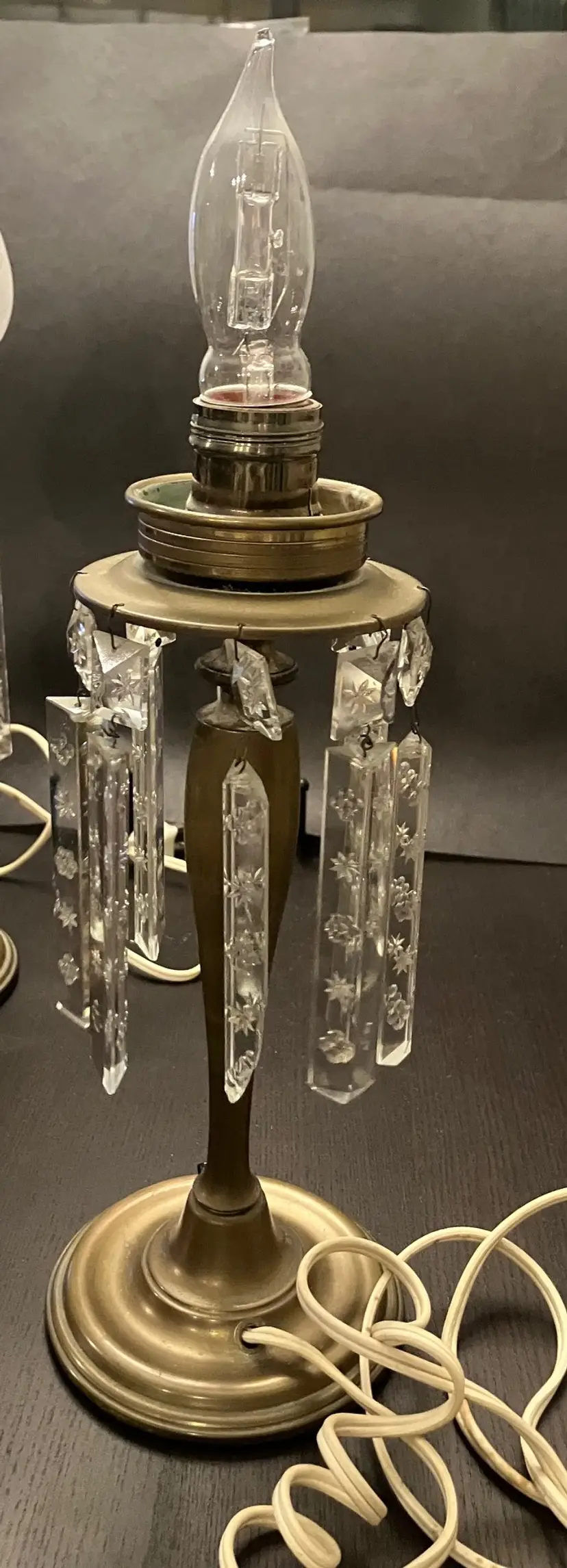 Antique brass, possibly attributed to Cornelius & Co. They feature a brass base and stem, with a round bobeche from which cut glass prisms are suspended. One glass shade - the other one broke and was discarded. Thought to originally be used with oil and converted with electricity. I have not tested the lights because the cords are old and not grounded so they are unsafe to use until the cords are replaced. One prism is cracked and a piece is missing (see images). 15" tall with shade, 11" without the shade and light bulb, 14" tall with light bulb. Weighs 8 lbs before packaging.