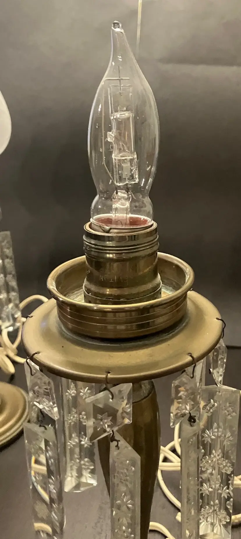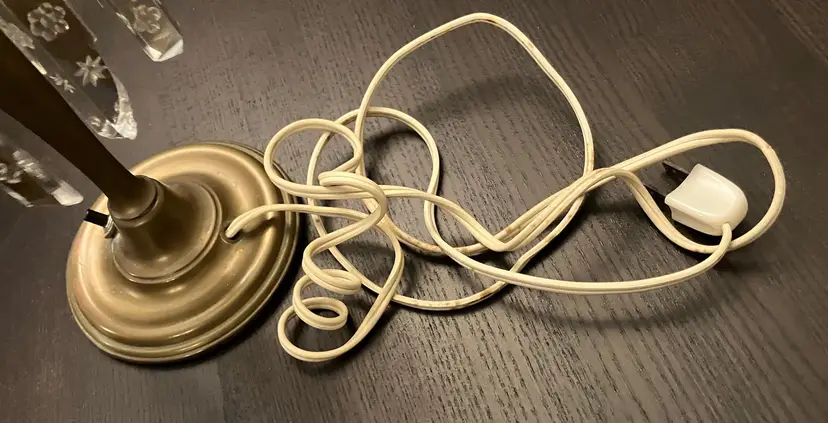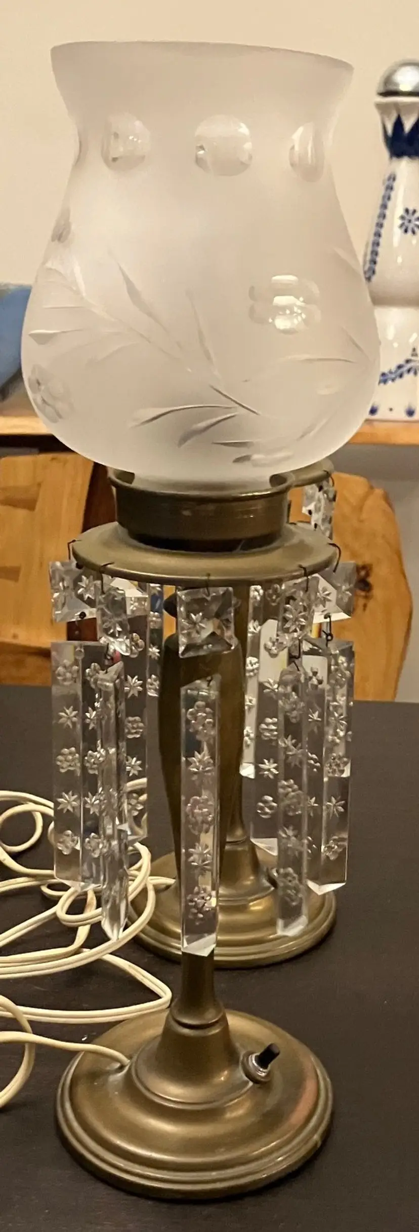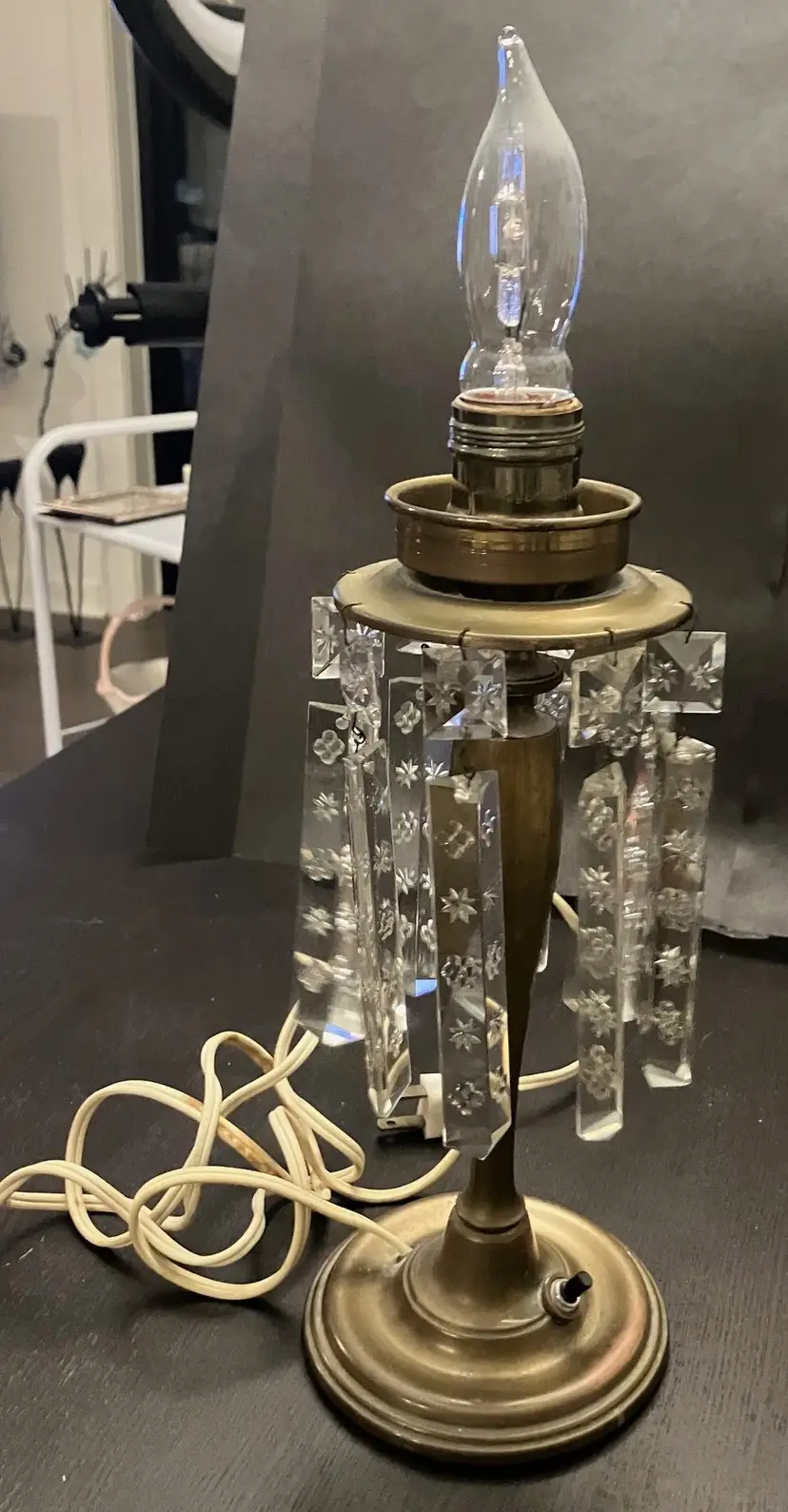 Antique brass, possibly attributed to Cornelius & Co. They feature a brass base and stem, with a round bobeche from which cut glass prisms are suspended. One glass shade - the other one broke and was discarded. Thought to originally be used with oil and converted with electricity. I have not tested the lights because the cords are old and not grounded so they are unsafe to use until the cords are replaced. One prism is cracked and a piece is missing (see images). 15" tall with shade, 11" without the shade and light bulb, 14" tall with light bulb. Weighs 8 lbs before packaging.
