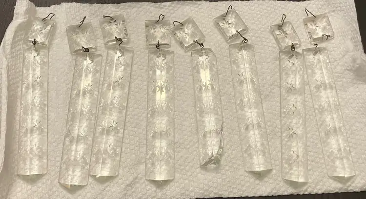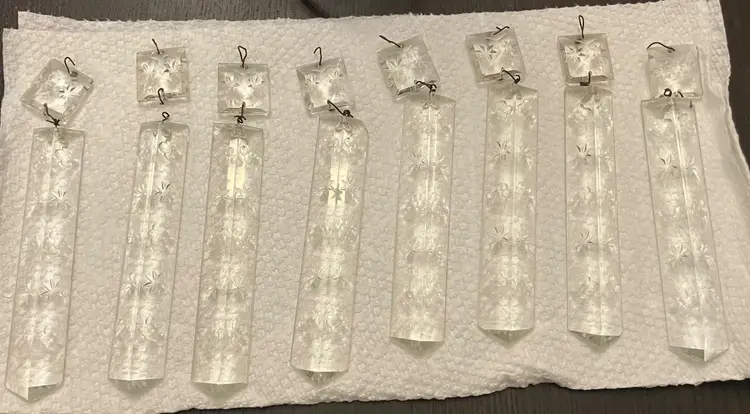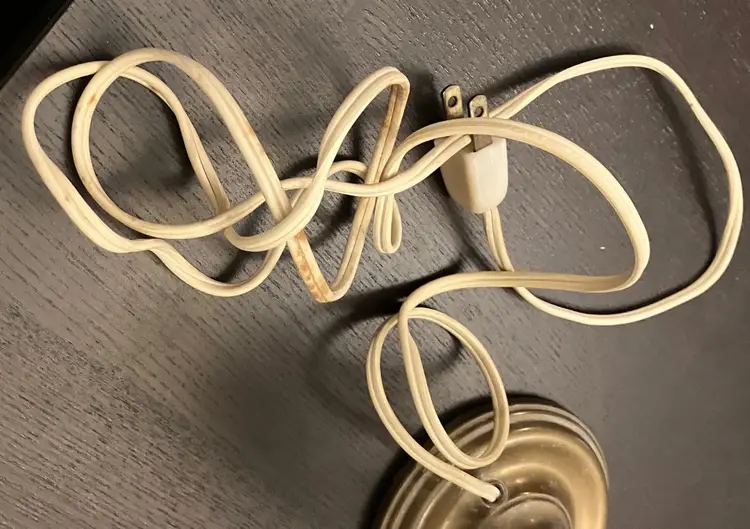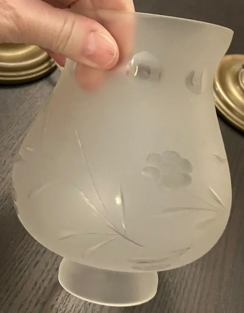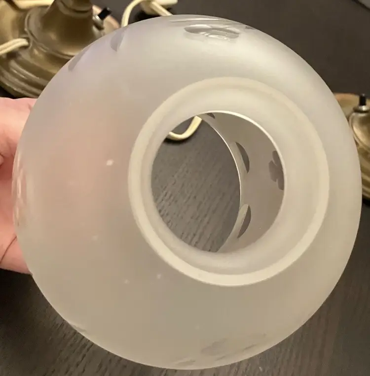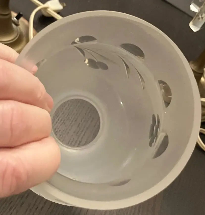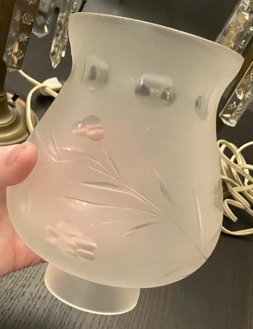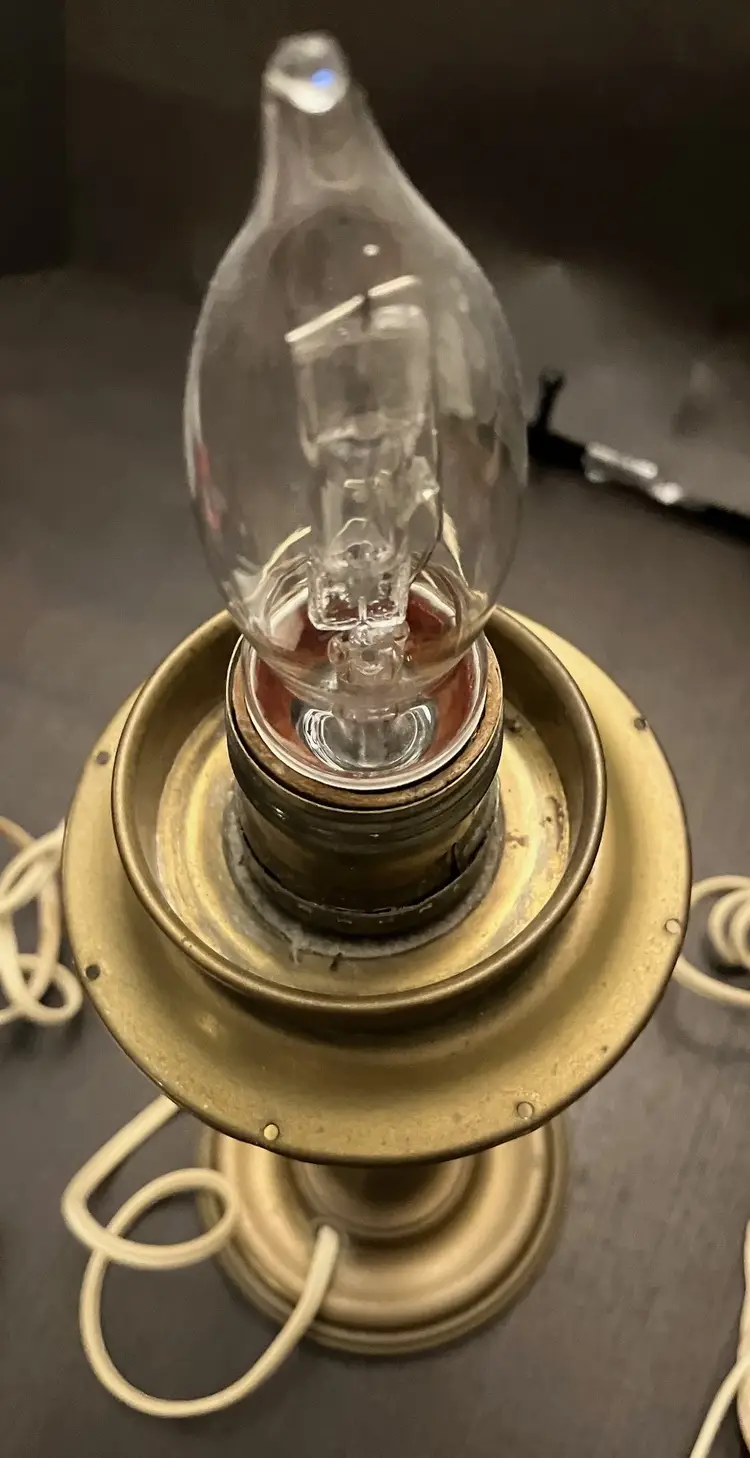 Antique brass, possibly attributed to Cornelius & Co. They feature a brass base and stem, with a round bobeche from which cut glass prisms are suspended. One glass shade - the other one broke and was discarded. Thought to originally be used with oil and converted with electricity. I have not tested the lights because the cords are old and not grounded so they are unsafe to use until the cords are replaced. One prism is cracked and a piece is missing (see images). 15" tall with shade, 11" without the shade and light bulb, 14" tall with light bulb. Weighs 8 lbs before packaging.
