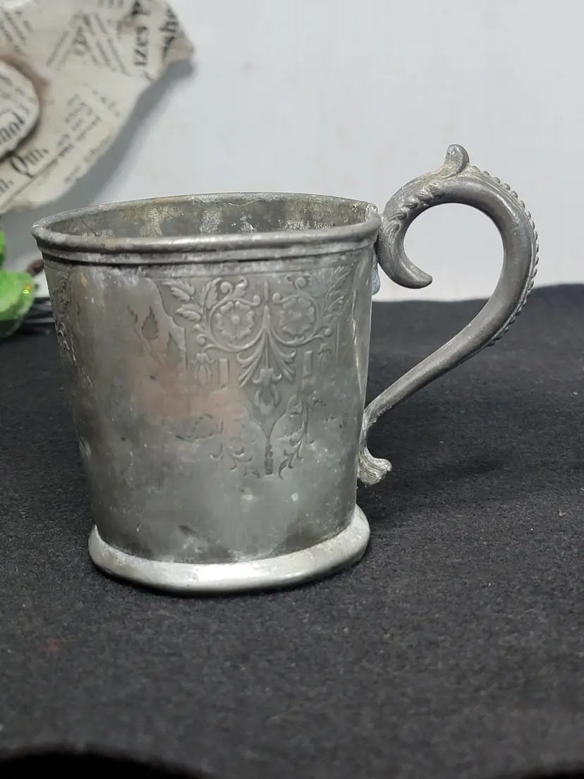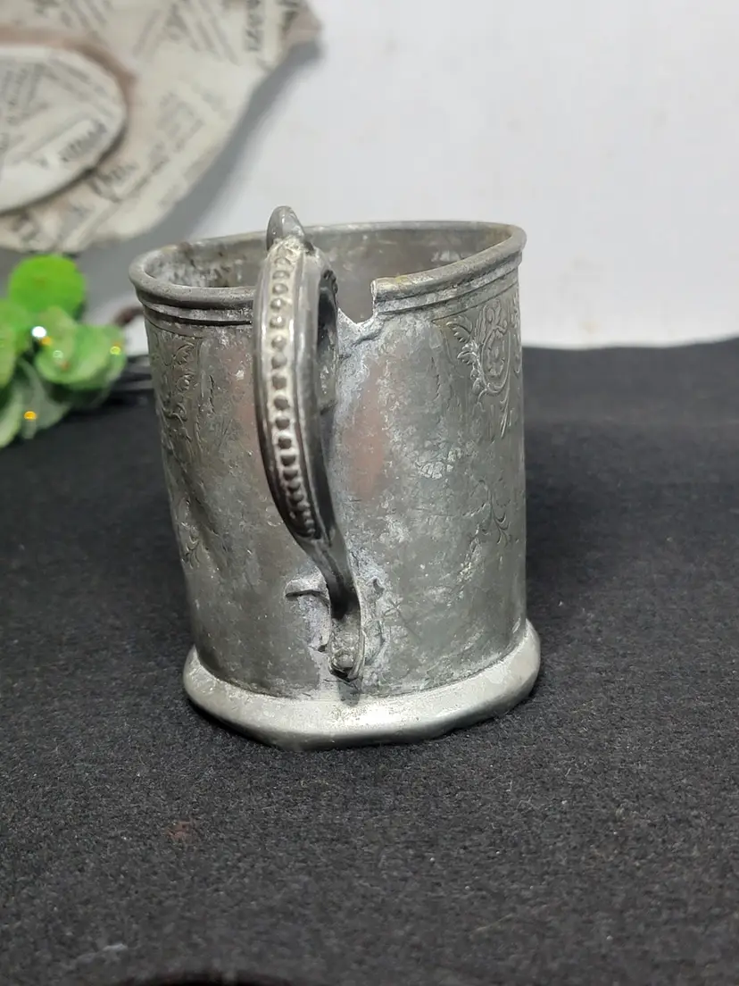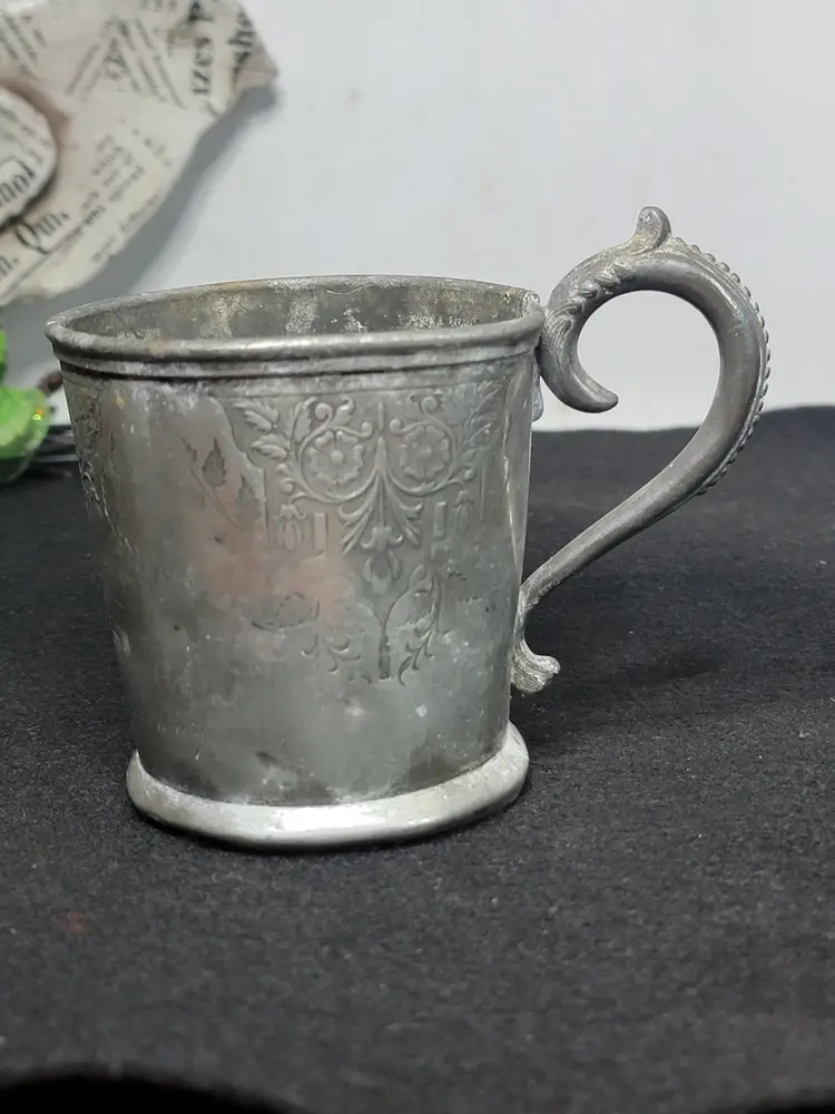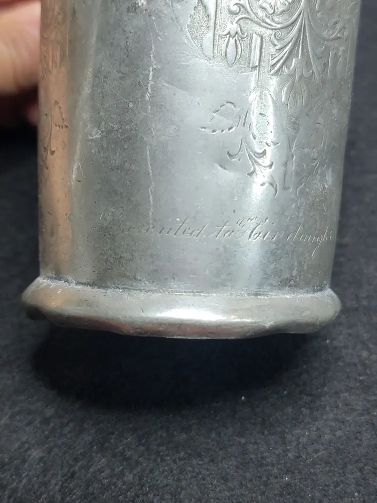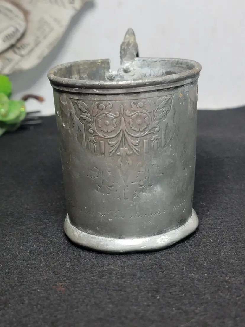 Antique pewter child's mug, likely made in the U.S. or England. Likely Victorian era. Engraved possibly saying "Presented To His Daughter Mary". 1332 marked on bottom, likely a pattern number.