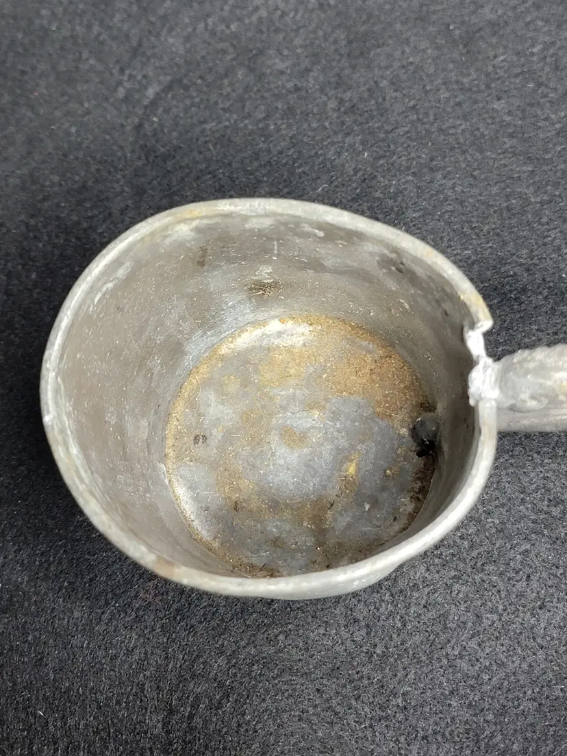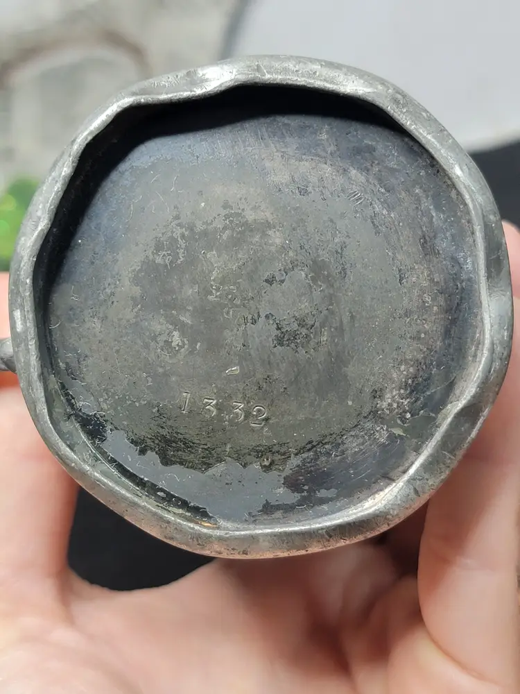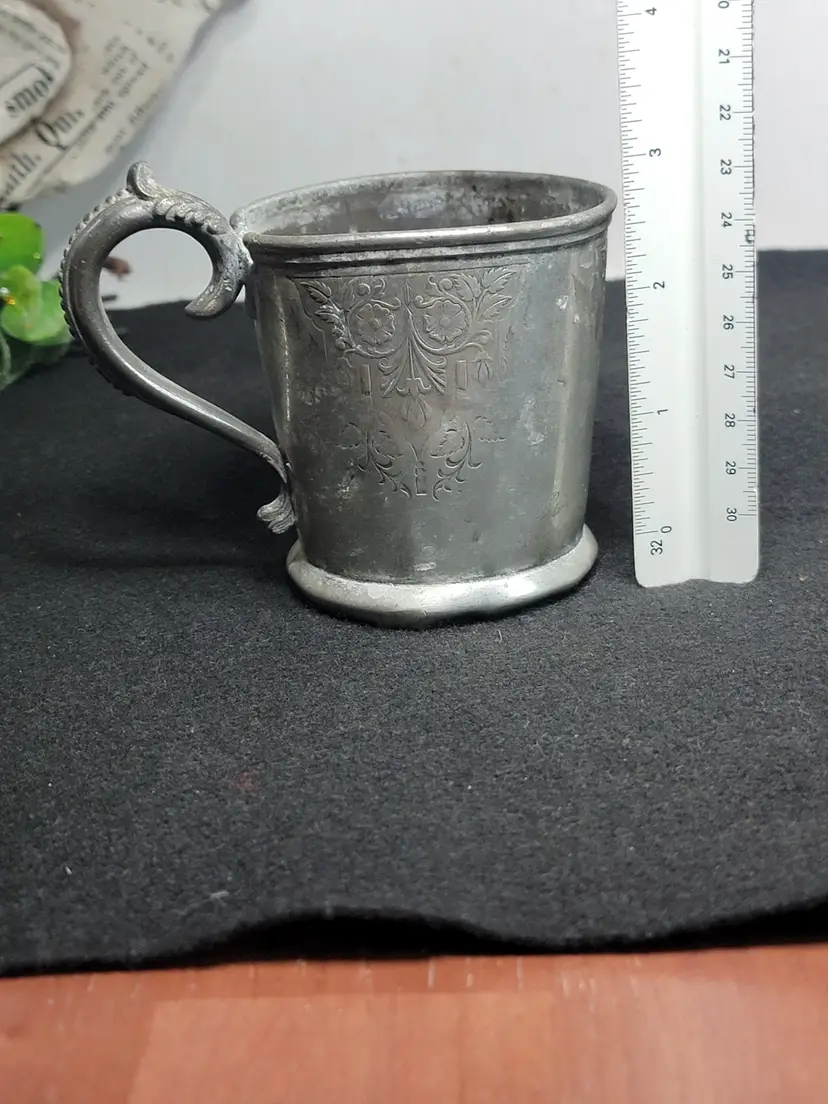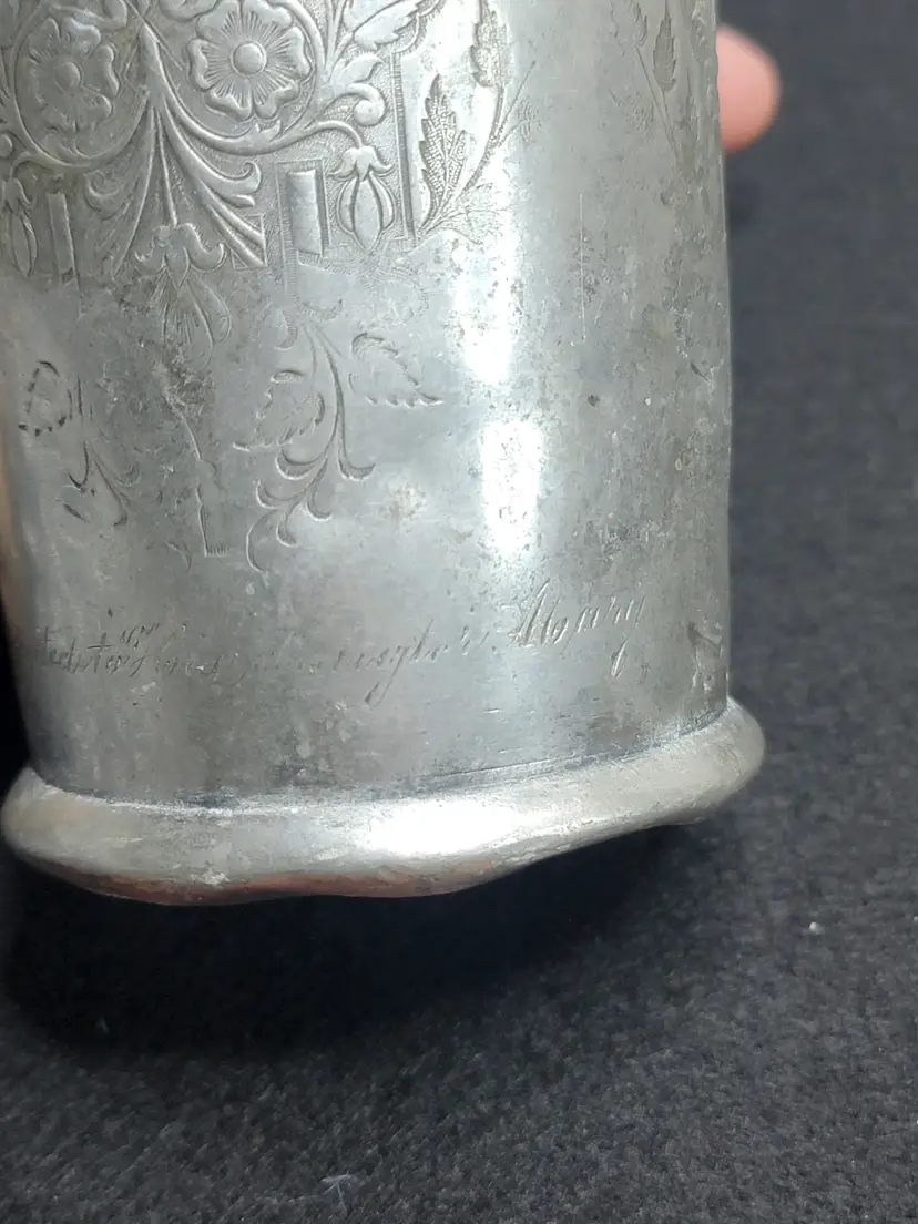 Antique pewter child's mug, likely made in the U.S. or England. Likely Victorian era. Engraved possibly saying "Presented To His Daughter Mary". 1332 marked on bottom, likely a pattern number.