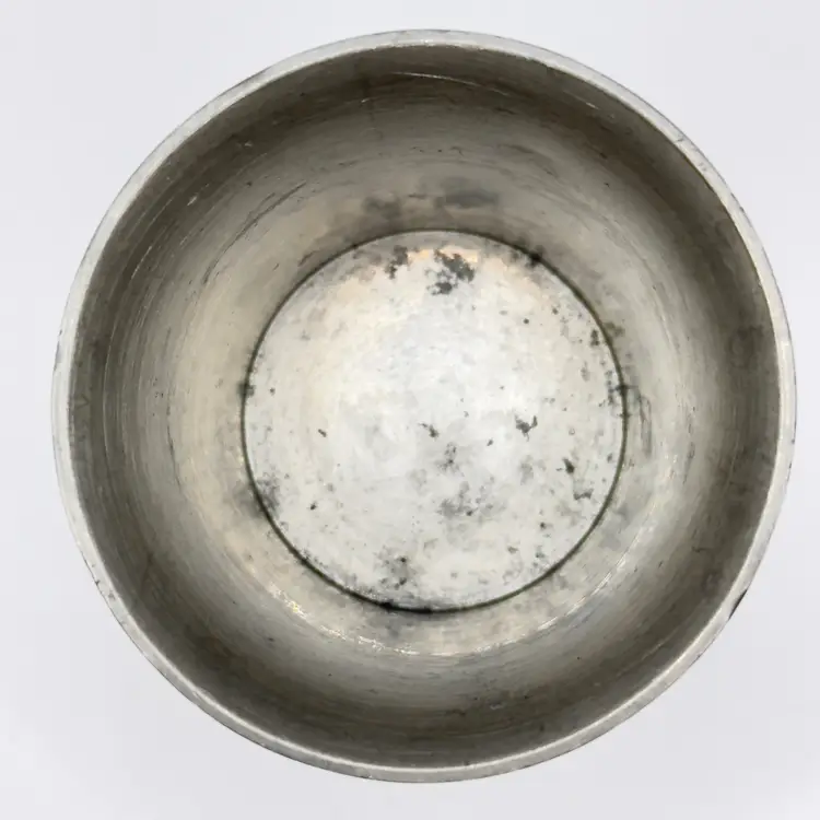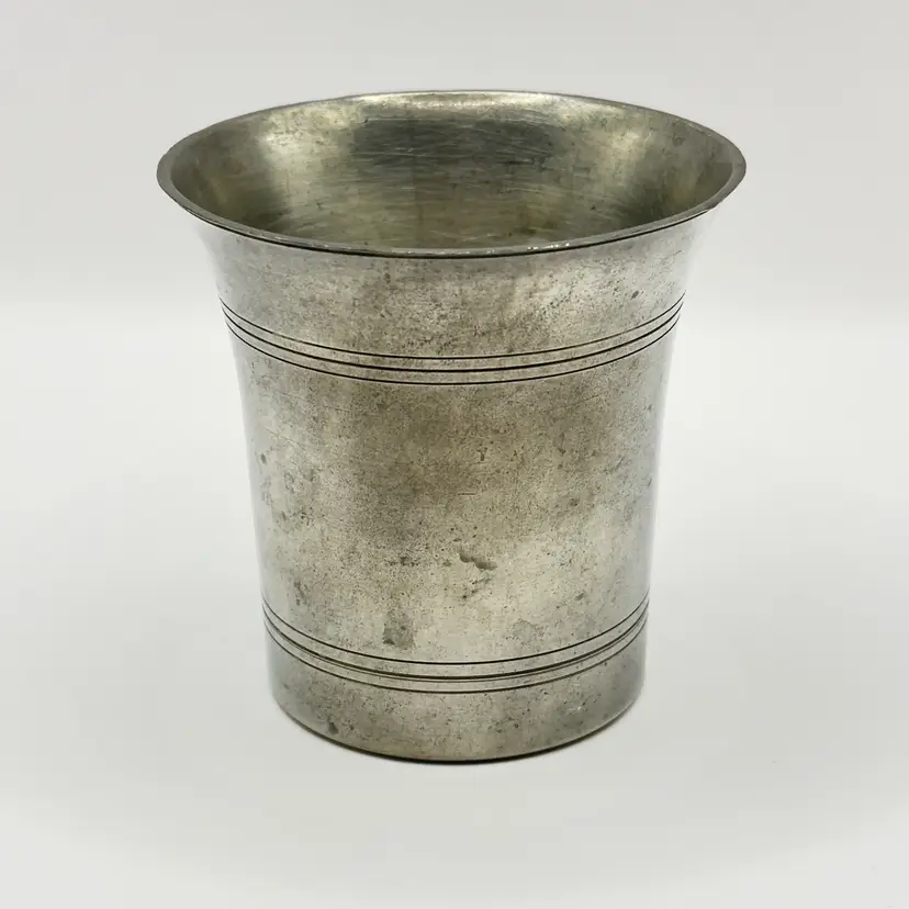 Add a touch of rustic charm to your home with this antique pewter tumbler. Featuring a classic striped design, it's perfect for display or as a unique addition to your collection. In good vintage condition with a lovely patina that adds character. Measures 3x3 inches. Weighs 8oz.