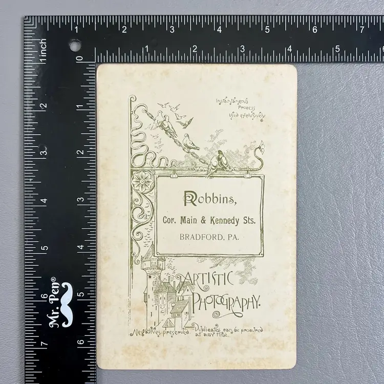 Antique Photo Portrait Cabinet Card Artistic Photography Bradford PA Woman Victorian Era Robbins Studio Young lady with short hair wearing a high-collared dress. Geometric Prop 19th Century Photography Dark