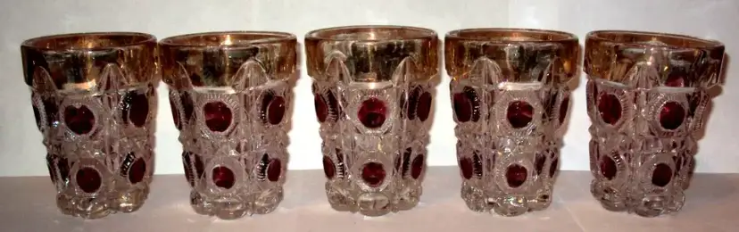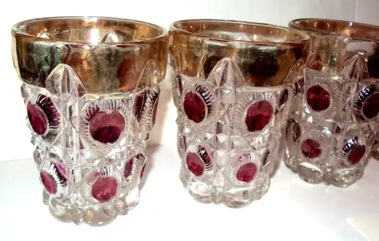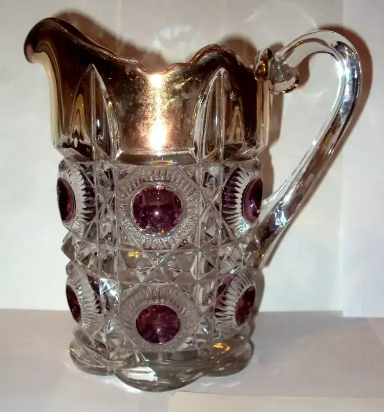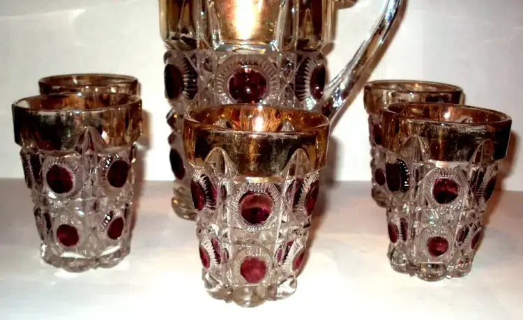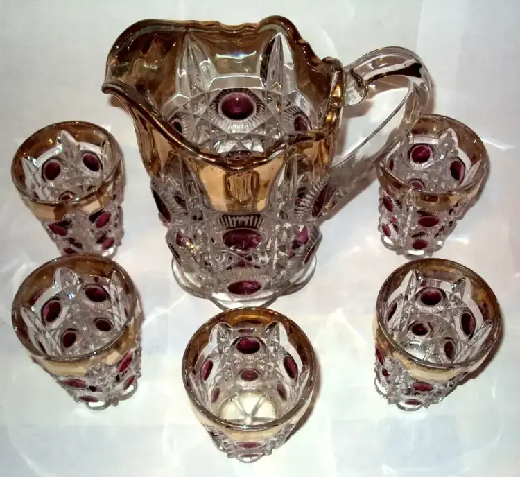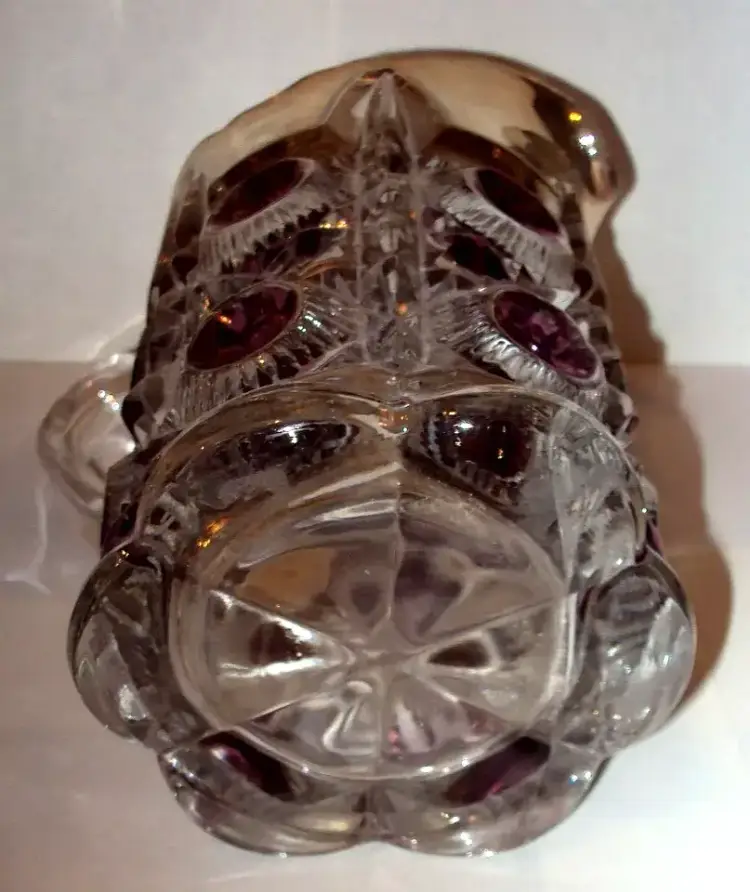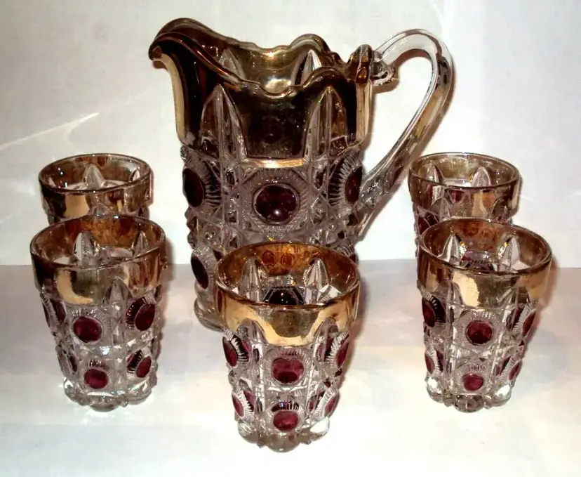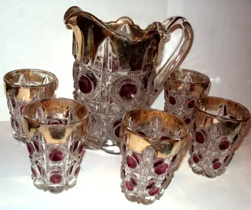 In excellent condition considering age. No chips or cracks. very minimal wear to the gold and purple coloring. Pitcher measures 8" tall x 7 7/8" from handle to spout and the glasses are 4".