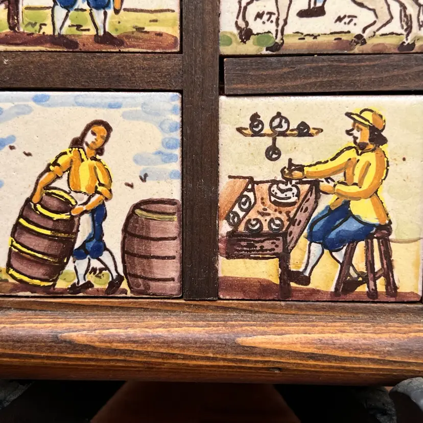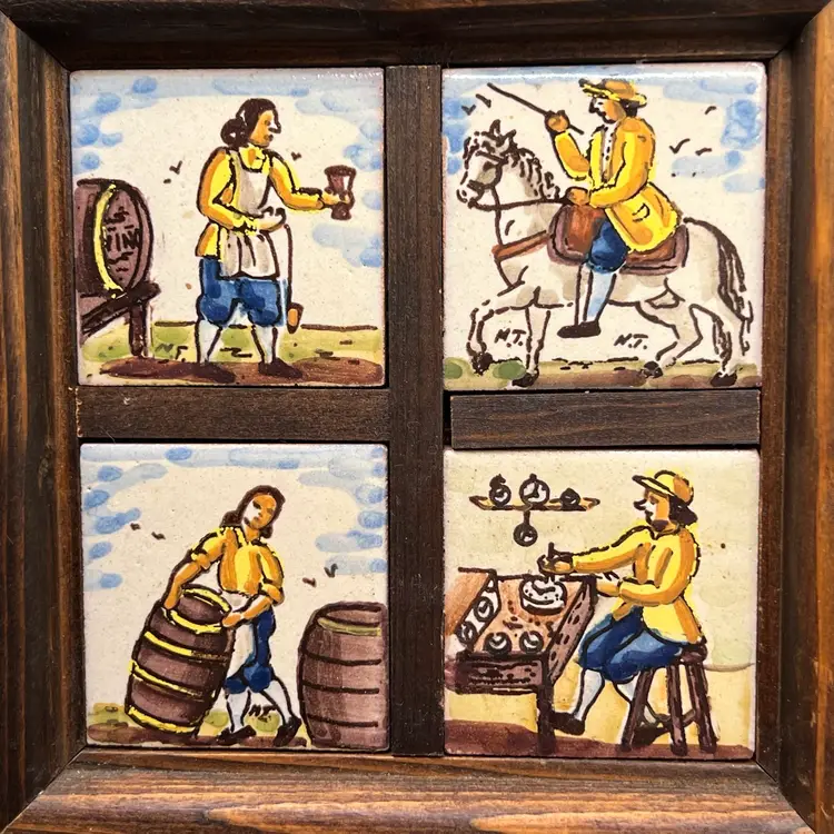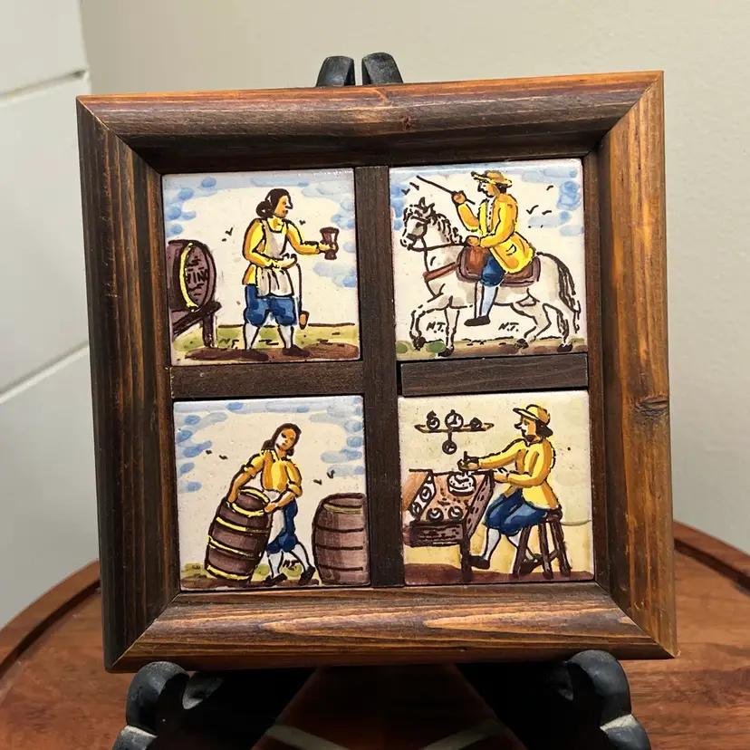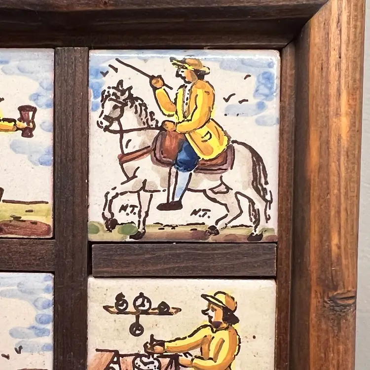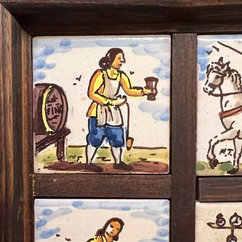 Beautiful Antique Polychrome ceramic tiles framed in wood.