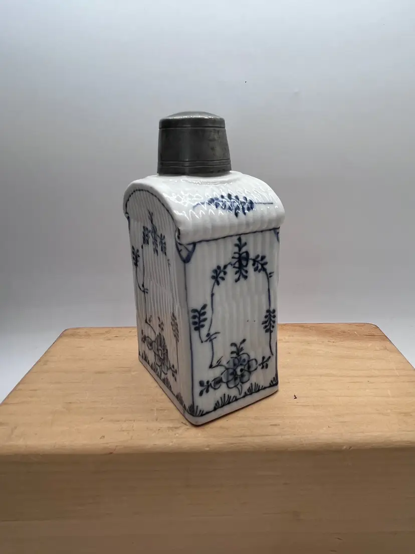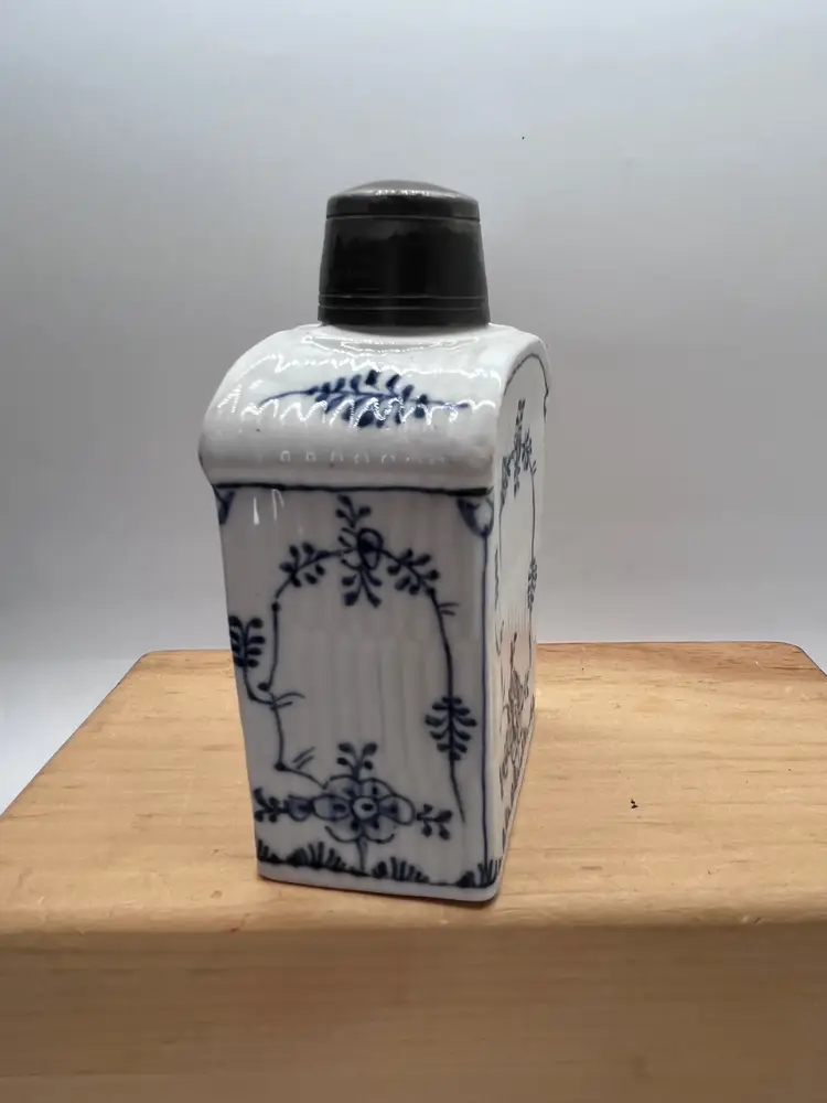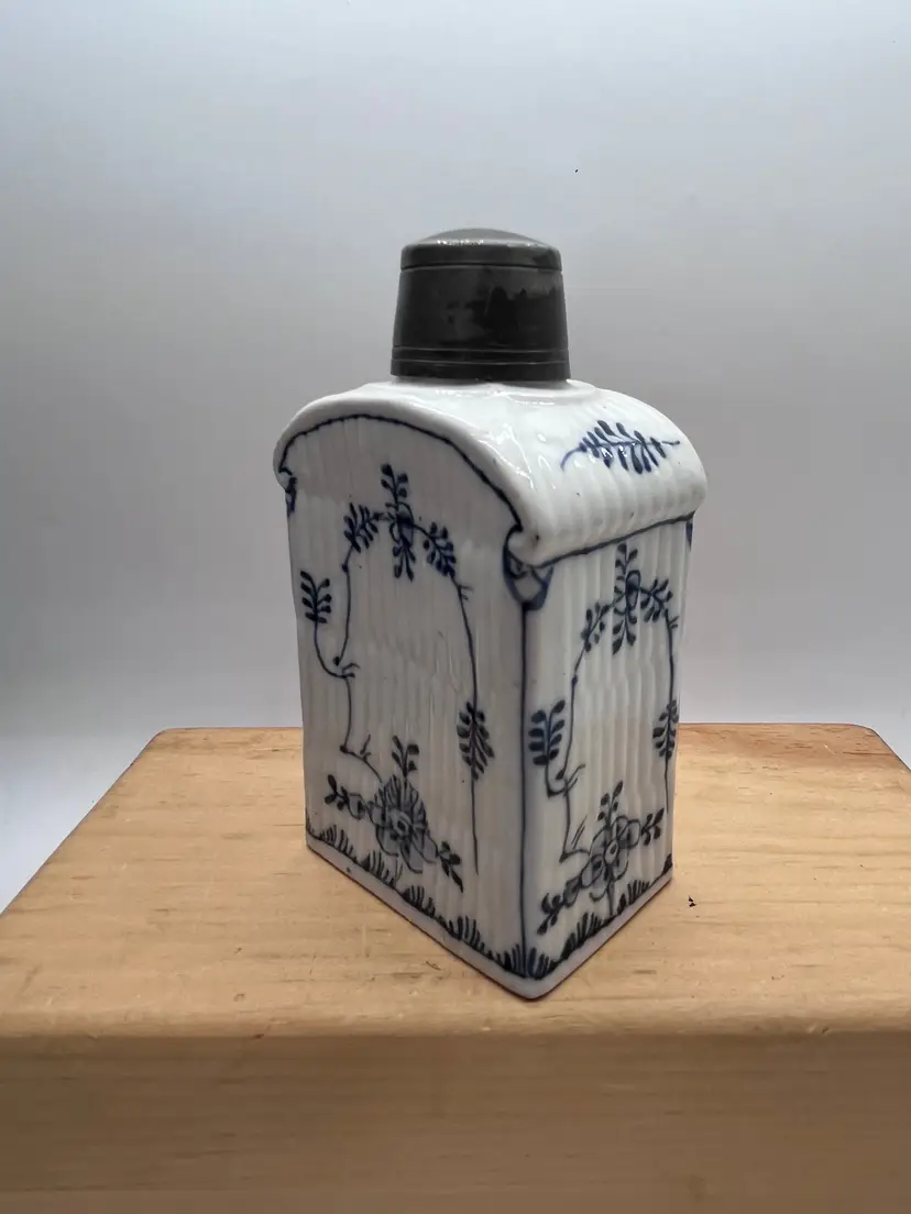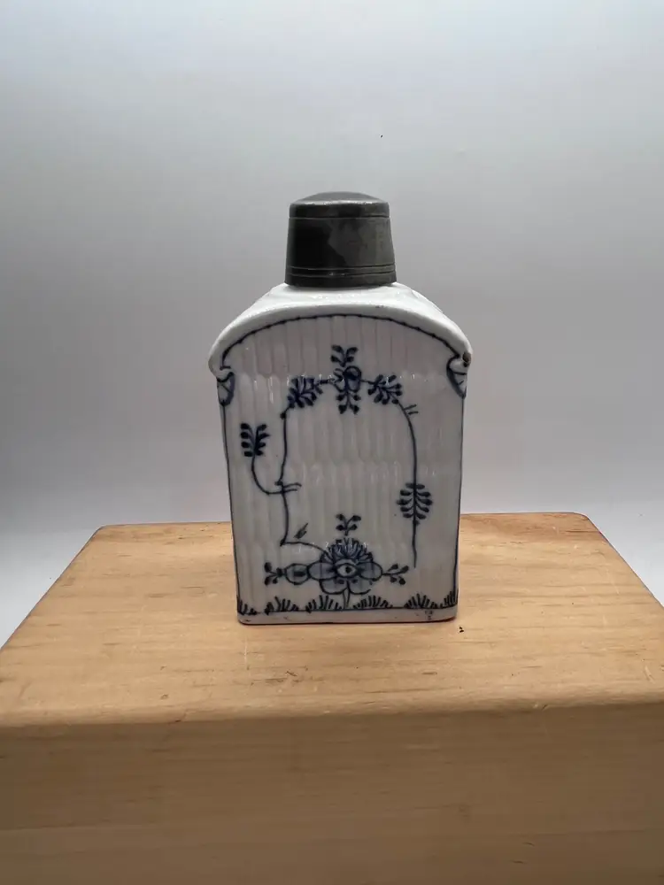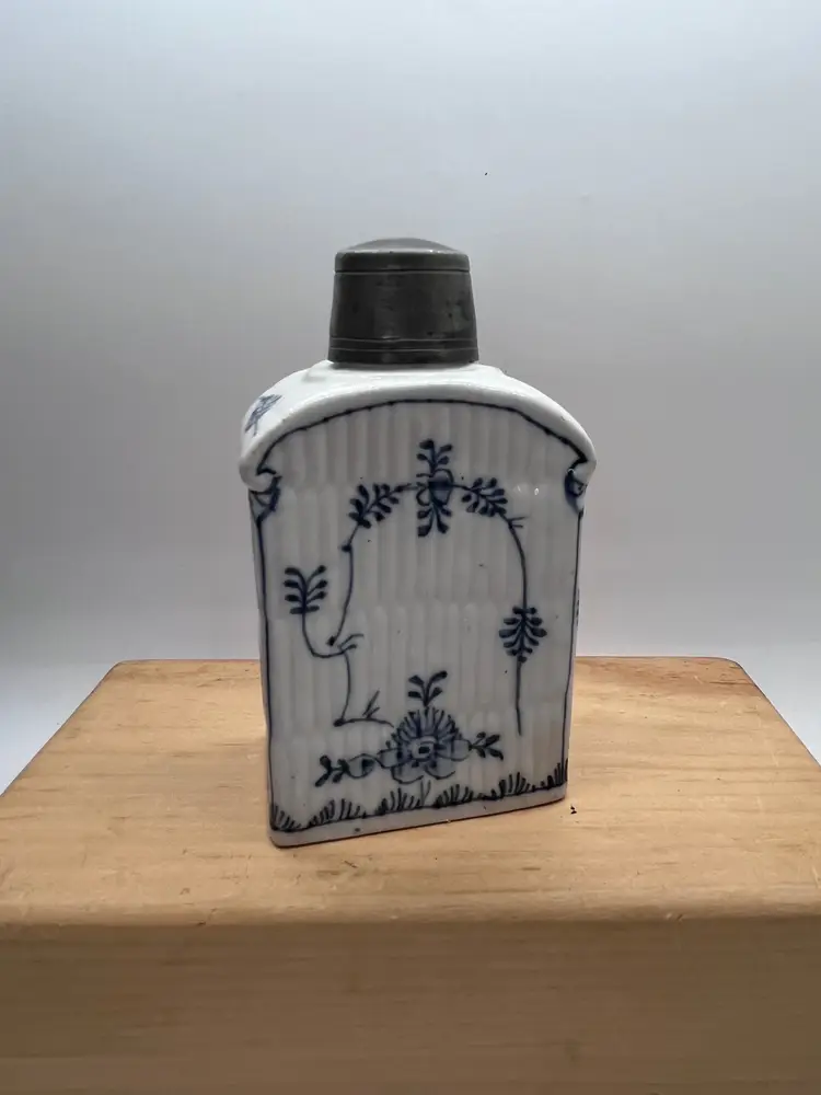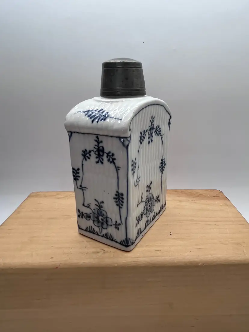 Beautiful piece of historically important porcelain. Tea bottles were used within large wooden boxes called caddies to import tea leaves to the European market starting in the 17th century. This piece has been variously identified online as being Royal Copenhagen, Meissen or Delft, but it is unmarked, and origin is not precise. The delicate hand painting is in blue on white bisque glazed porcelain, and the stopper cap is tin, or a base metal. Measures 5.75” high, 3.25” wide and 2” deep, with no cracks and light signs of wear and crazing only. Ships from a smoke free pet free home.