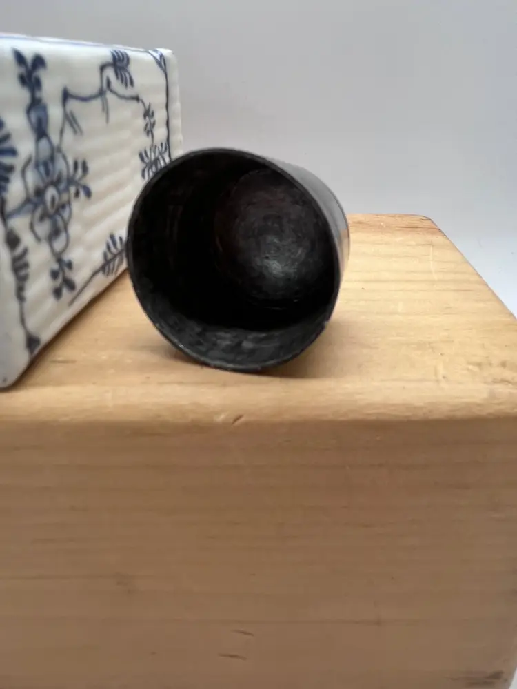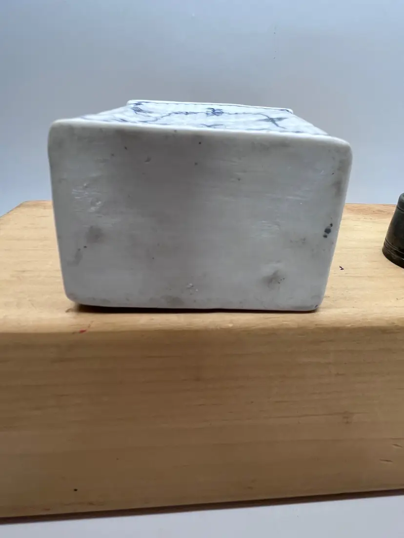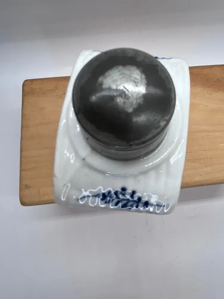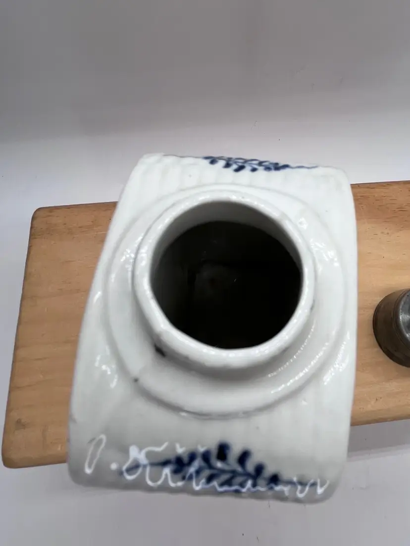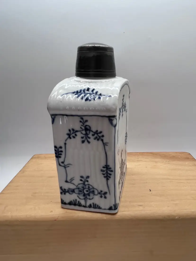 Beautiful piece of historically important porcelain. Tea bottles were used within large wooden boxes called caddies to import tea leaves to the European market starting in the 17th century. This piece has been variously identified online as being Royal Copenhagen, Meissen or Delft, but it is unmarked, and origin is not precise. The delicate hand painting is in blue on white bisque glazed porcelain, and the stopper cap is tin, or a base metal. Measures 5.75” high, 3.25” wide and 2” deep, with no cracks and light signs of wear and crazing only. Ships from a smoke free pet free home.