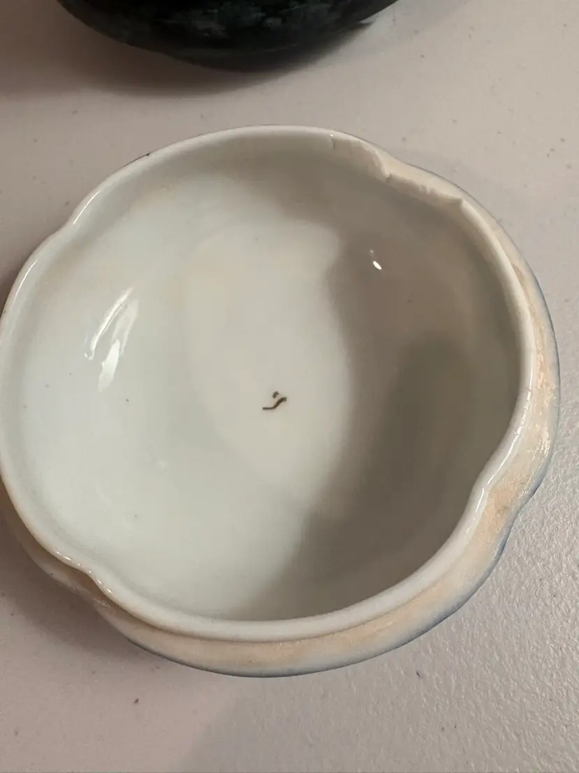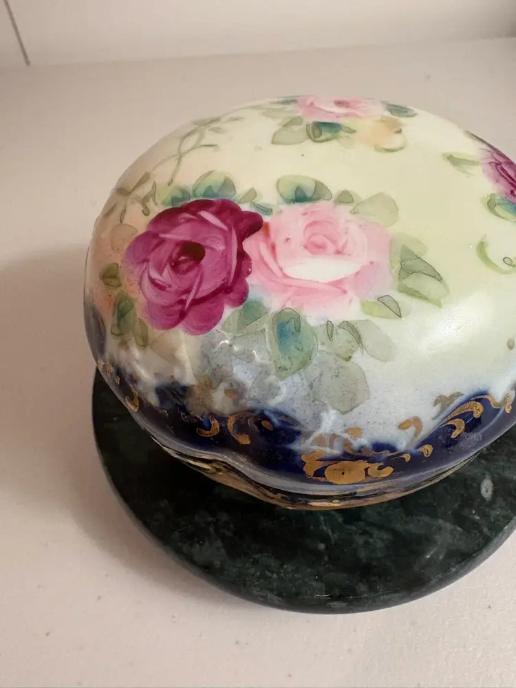 Antique porcelain dresser box, also known as a hair receiver or powder jar, likely from the Nippon era (late 1800s to early 1900s). It is a hand-painted porcelain box with a lid, featuring pink roses, a deep blue border, and gilded accents. These boxes were commonly used on dressers to hold hair or powder, as part of a vanity set. The style suggests it could be from the Nippon era of Japanese porcelain. This specific piece is described as being in excellent condition except for one small chip in the bowl as shown in the picture. 4” across and 3” tall.