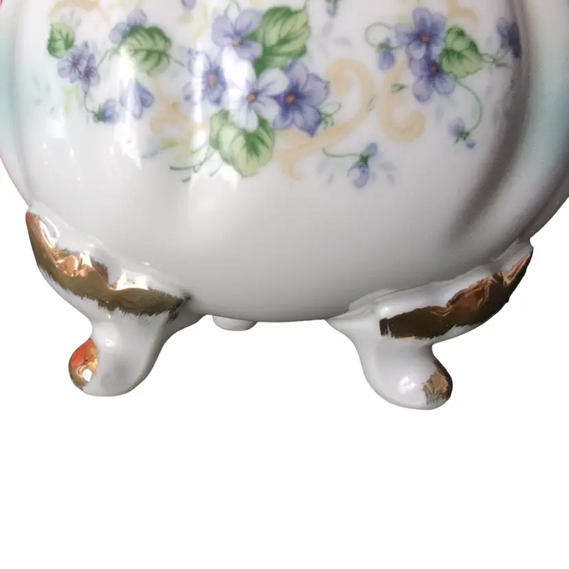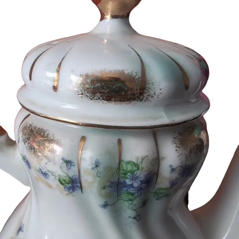 Graceful porcelain teapot adorned with delicate blue floral patterns and elegant gold trimmings. A timeless piece for any vintage tea collection.