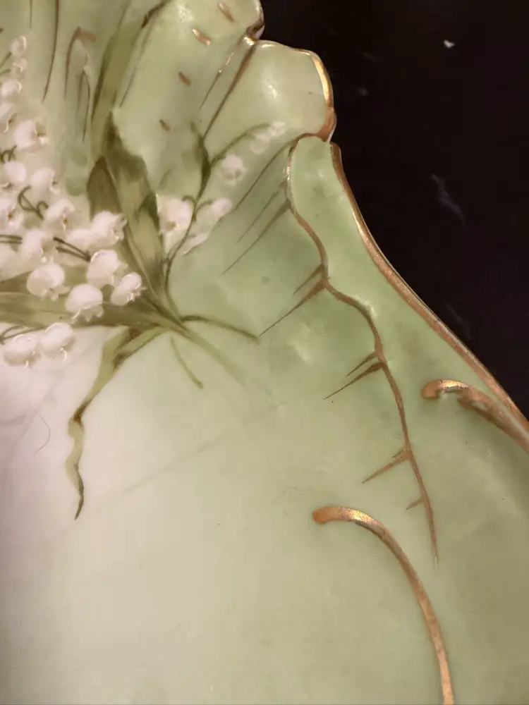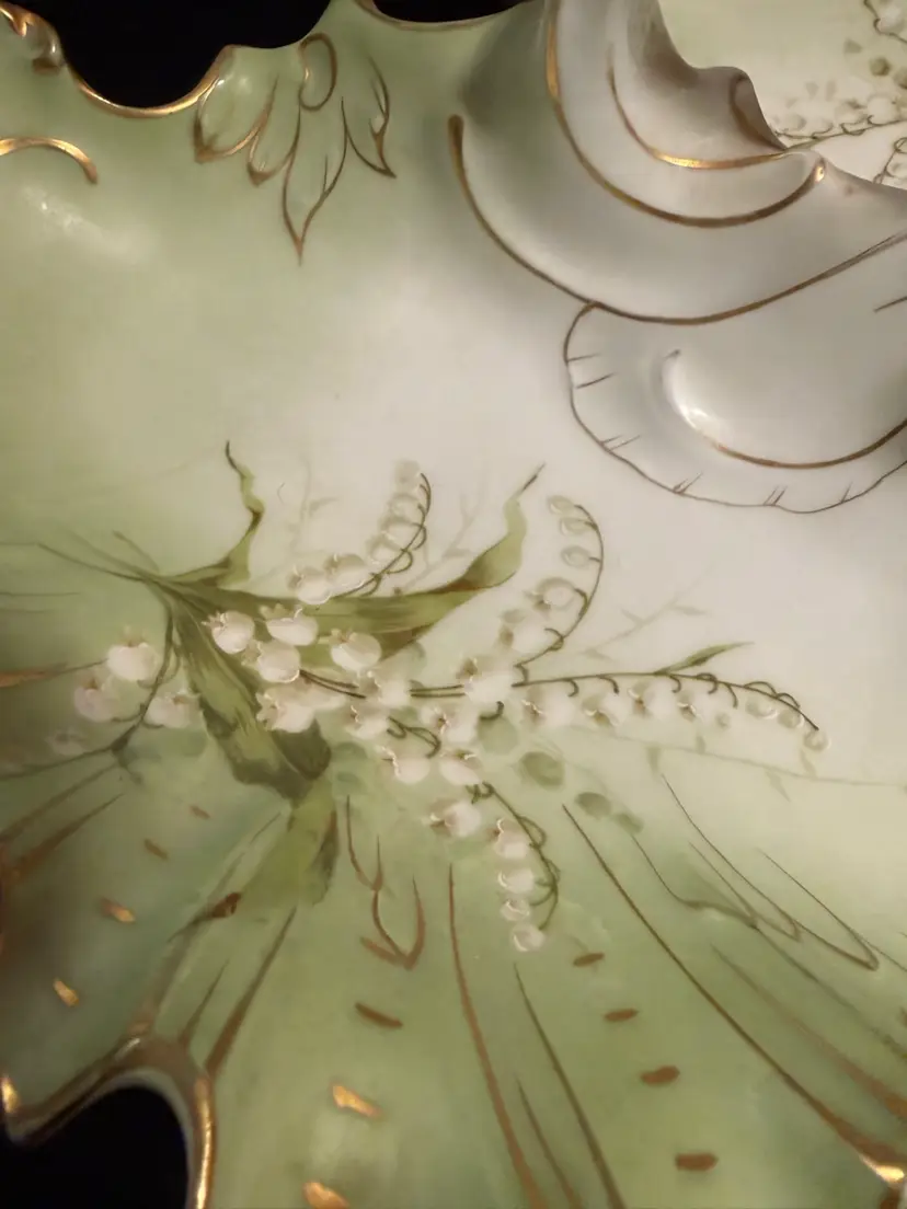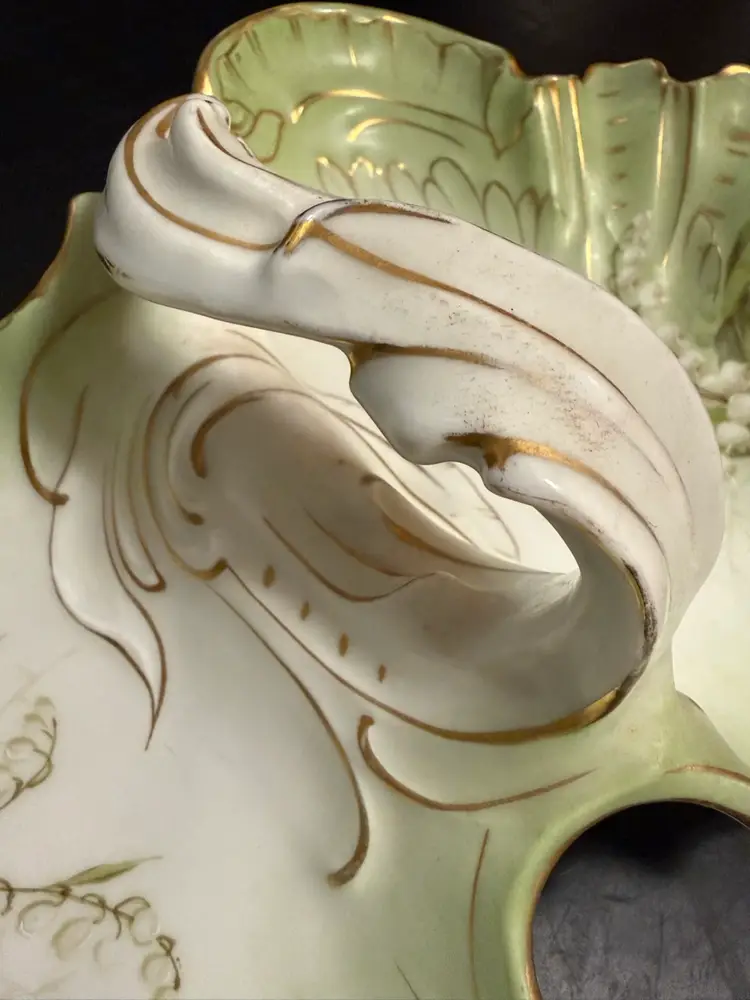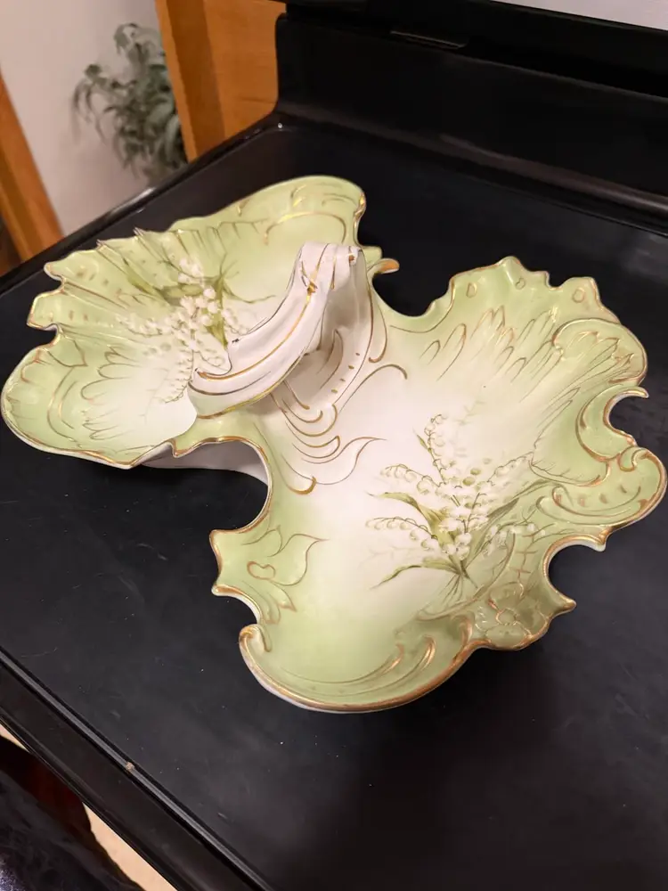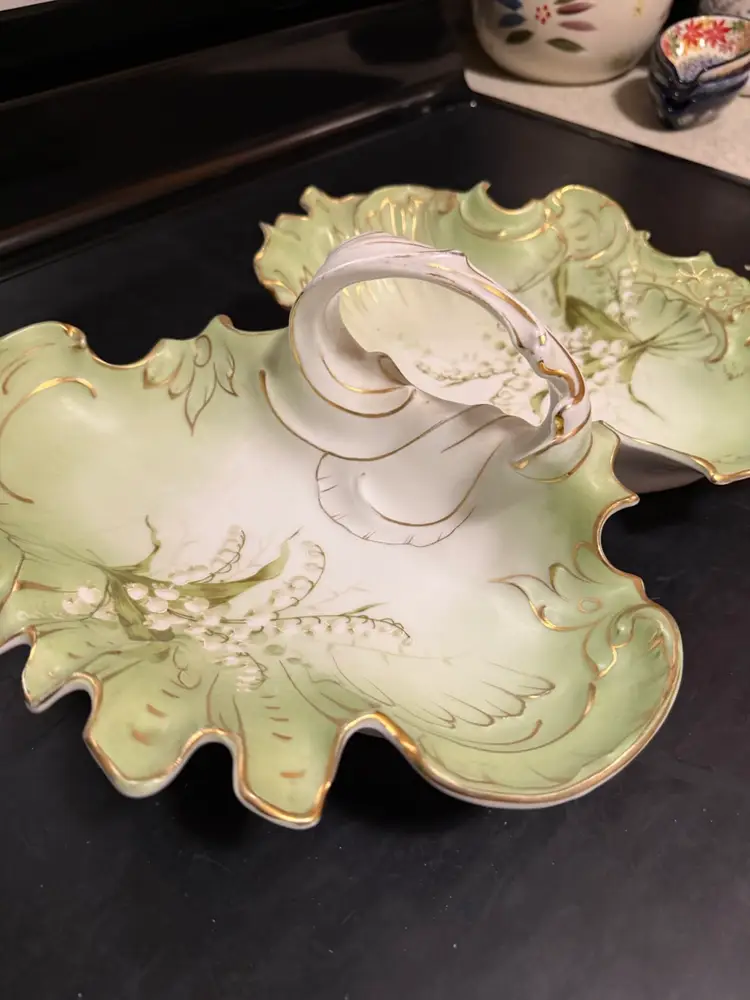 It features a two-compartment divided design with scalloped edges, pale green and white coloring, floral motifs, and a central handle.