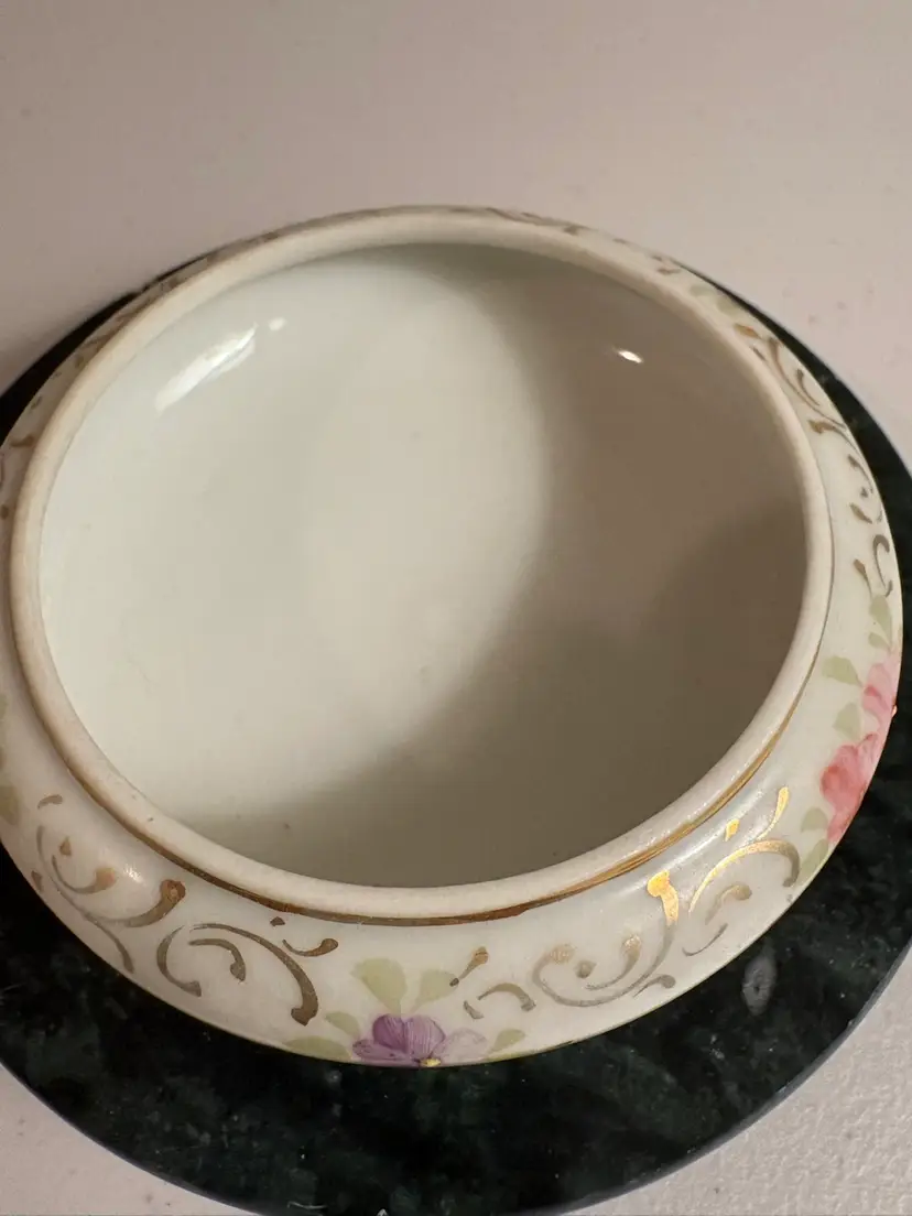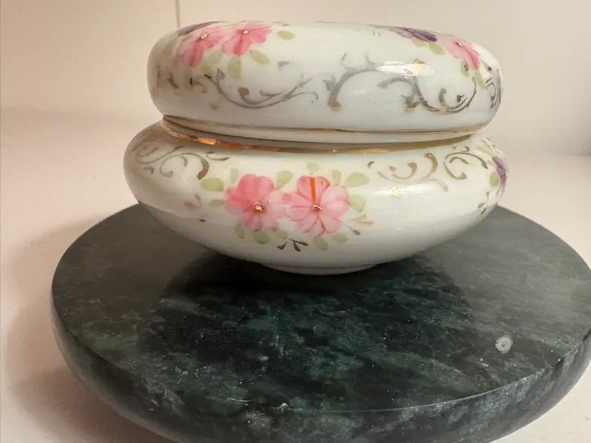 Very delicate floral design on this lovely trinket box. 2 1/2” across and 2” tall.