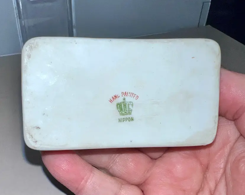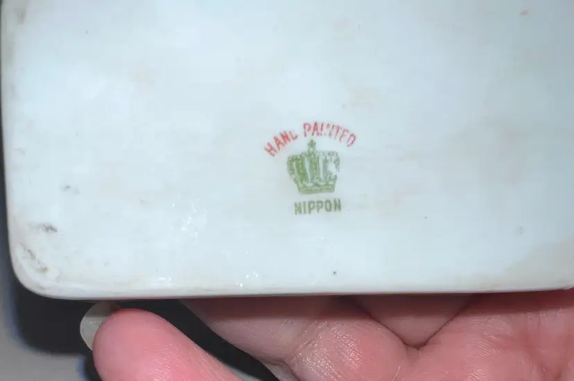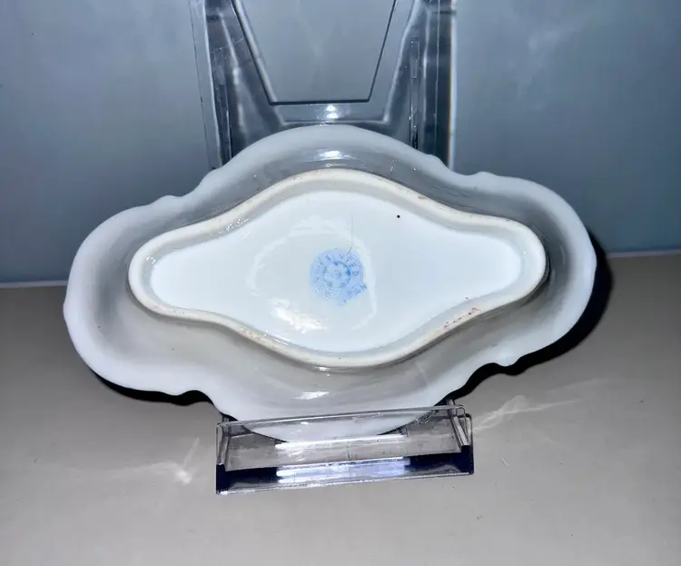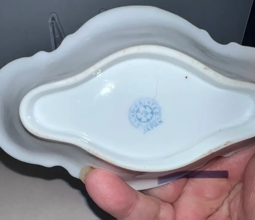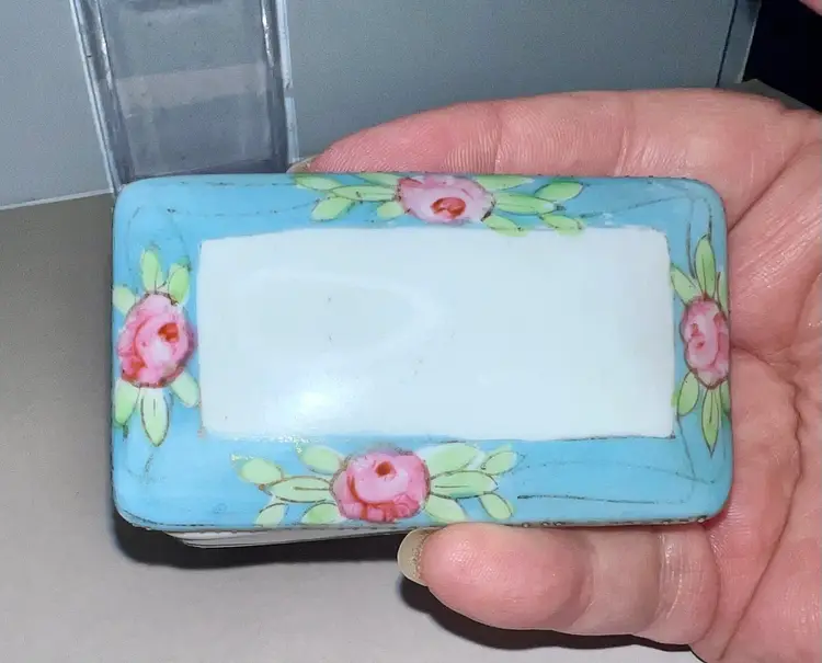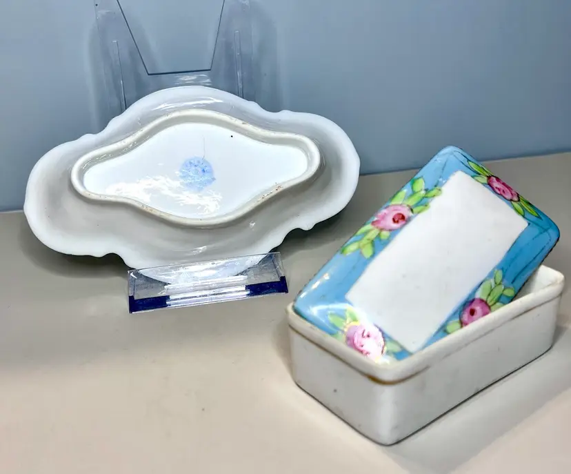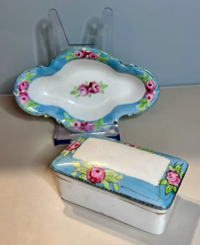 Beautiful cottage core porcelain vanity tray and trinket box. Hand painted. Blue with pink roses.