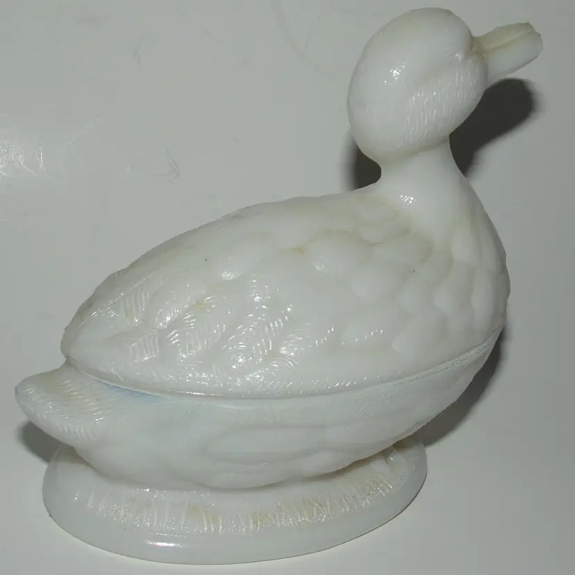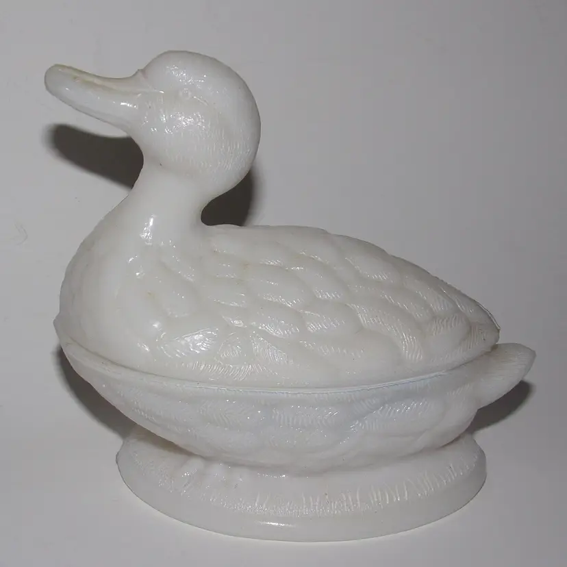Scarce Antique Portieux Vallerysthal Opaline Swimming Duck, Butter Pot Dish. Made in France in 1908. 4.7" high 5.2" wide It is in great condition. Please see all pics, as they are part of the description.