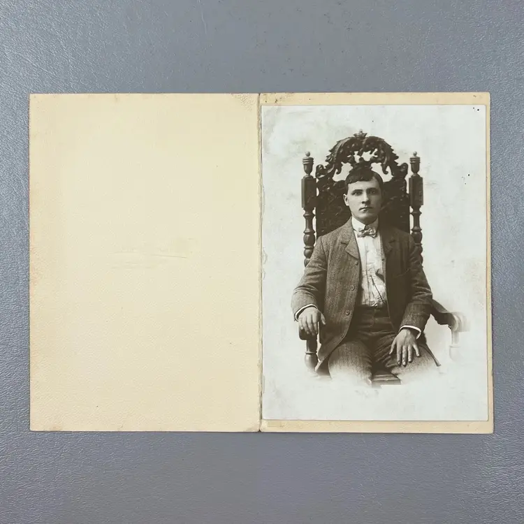 Antique Portrait Photo Man In Suit Sitting Ornate Wooden Chair Denver Colorado 4x5.5"