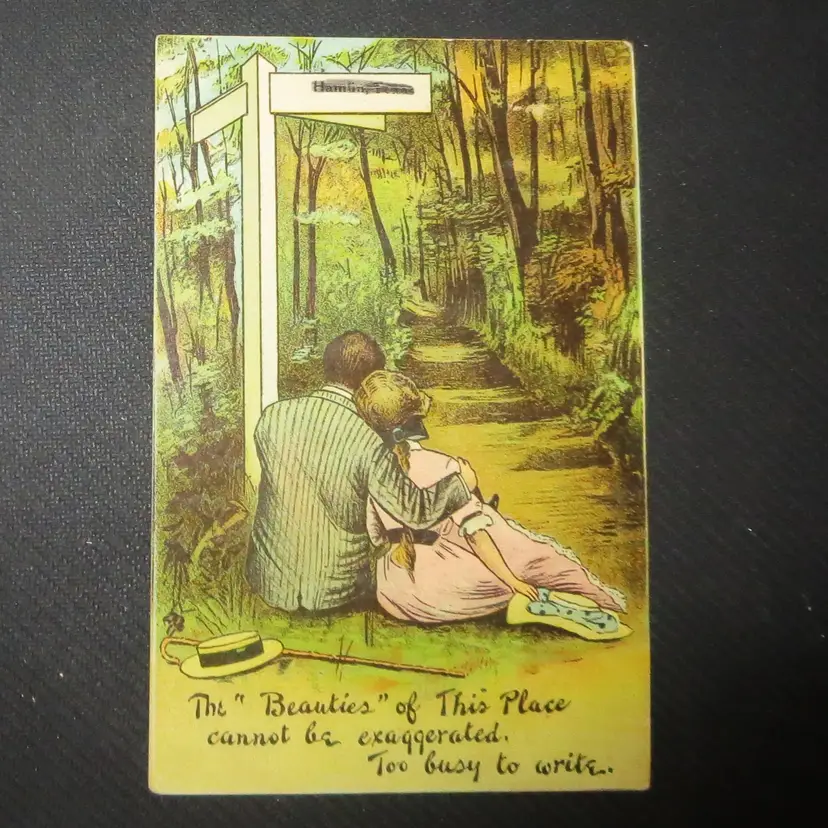 Shows a romantic couple on front with verse The Beauties Of This Place Cannot Exaggerated. Too Busy To Write.