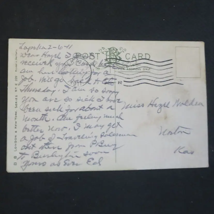 This postcard is dated Feb 6 1911. Handwritten message to a Miss Hazel Walden in Norton KS talks about being sick and concerns for others who were also ill. Goes on to say about looking for work as a traveling salesman.
