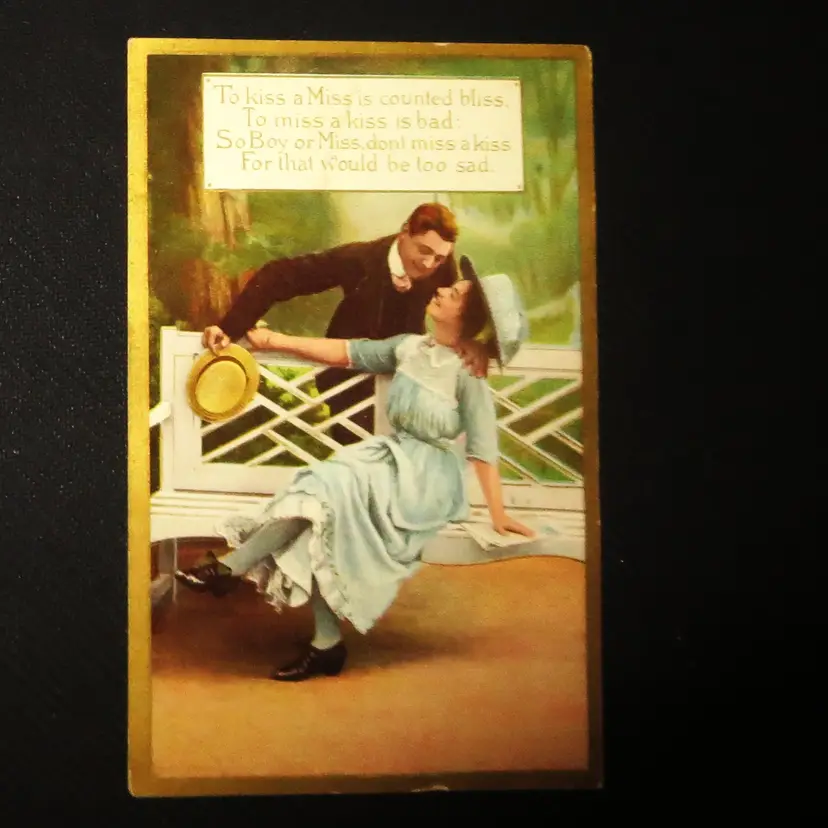 On front is verse To Kiss a miss is counted as bliss To miss a kiss is bad So Boy or Miss don't miss a kiss for that would be too sad. Now this card will fit right into a Valentine's Day display.