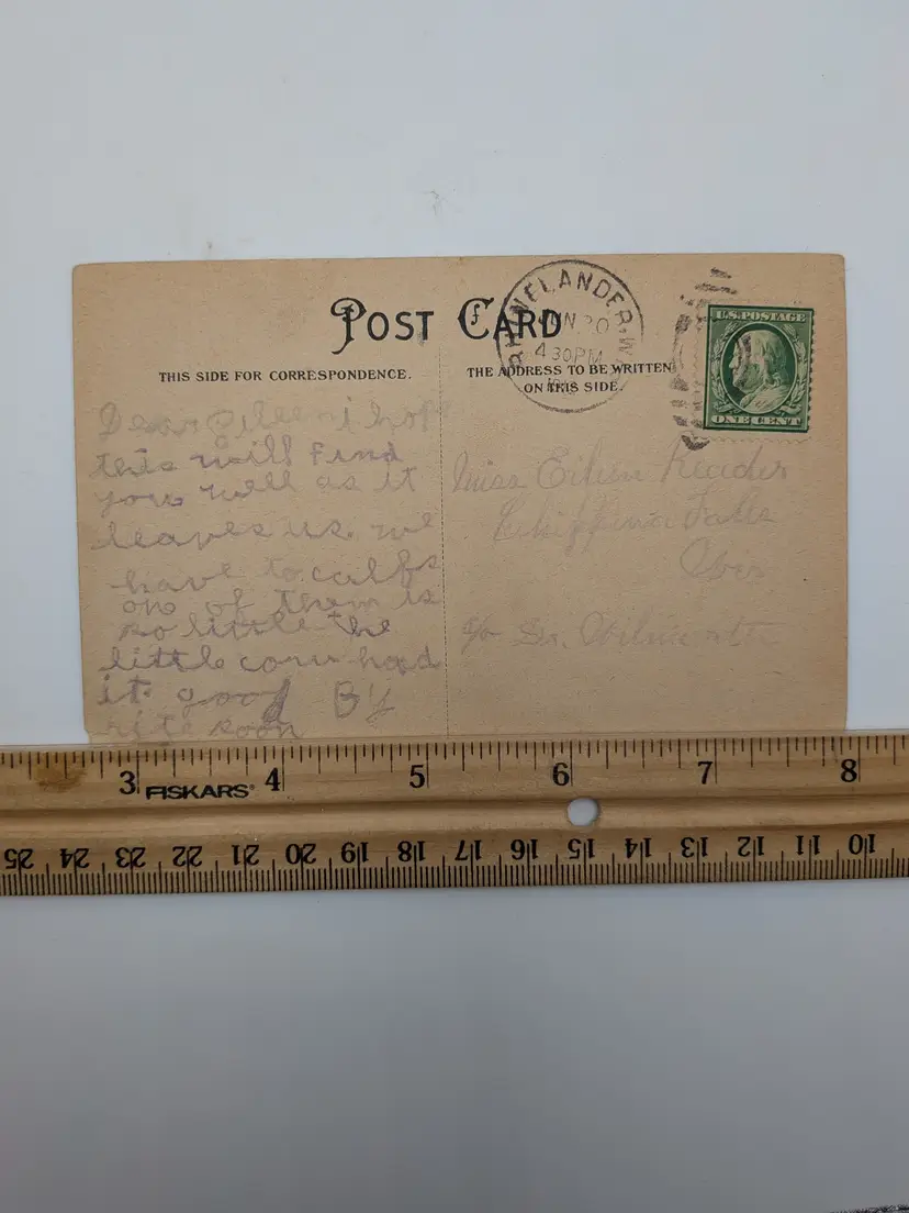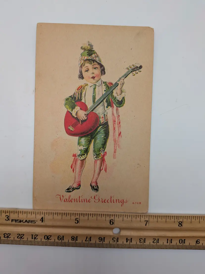 E78. ANTIQUE POSTCARD POSTMARKED 1912 Valentine's Day Postcard Young Boy Playing Heart-Shaped Guitar Valentine GREEN 1¢ STAMP