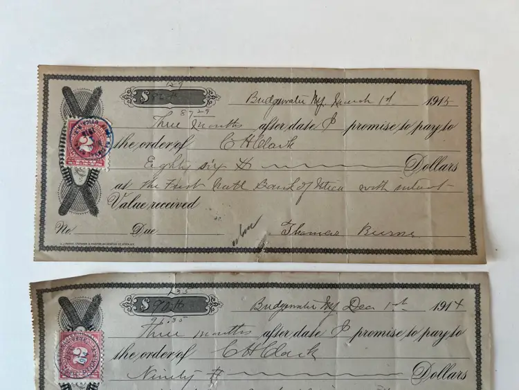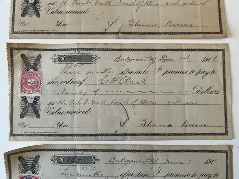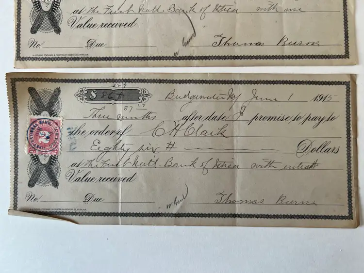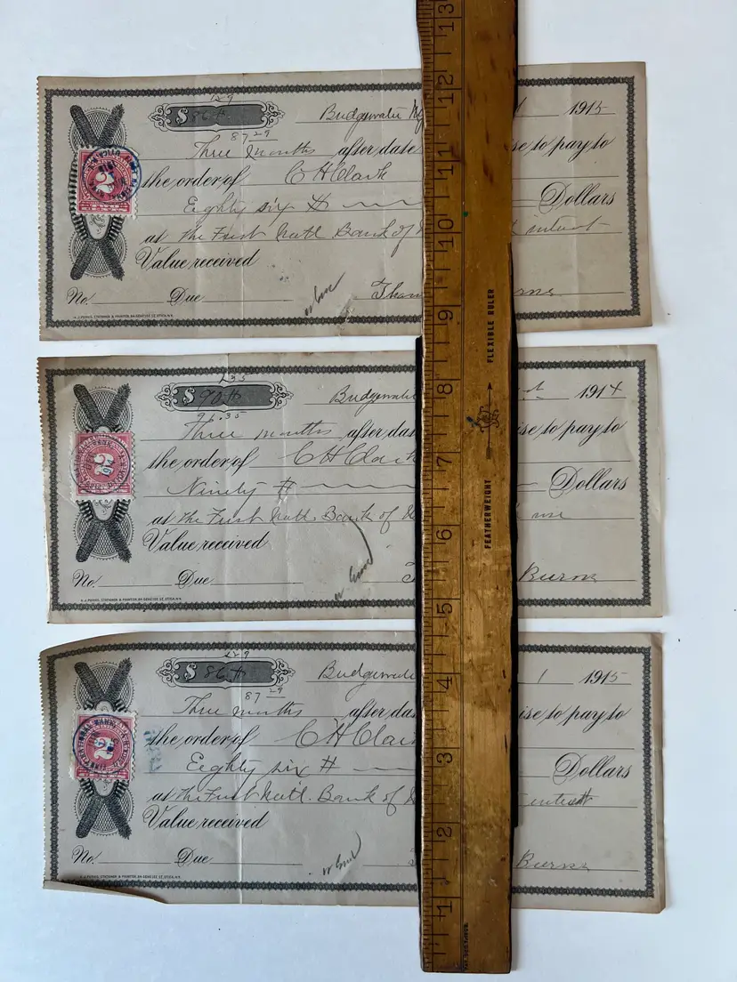 Collection of 3 promissory notes from 1914 -1915 These came from an estate ephemera lot. I believe this are each for 3 months of farm rent. Filled out by hand. See ruler for measurements