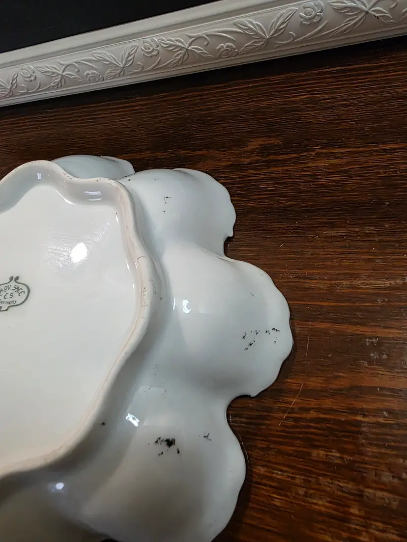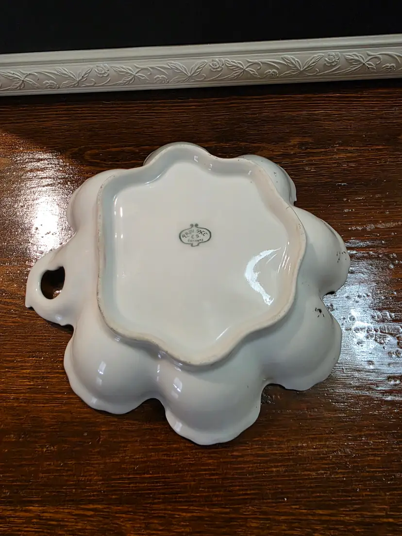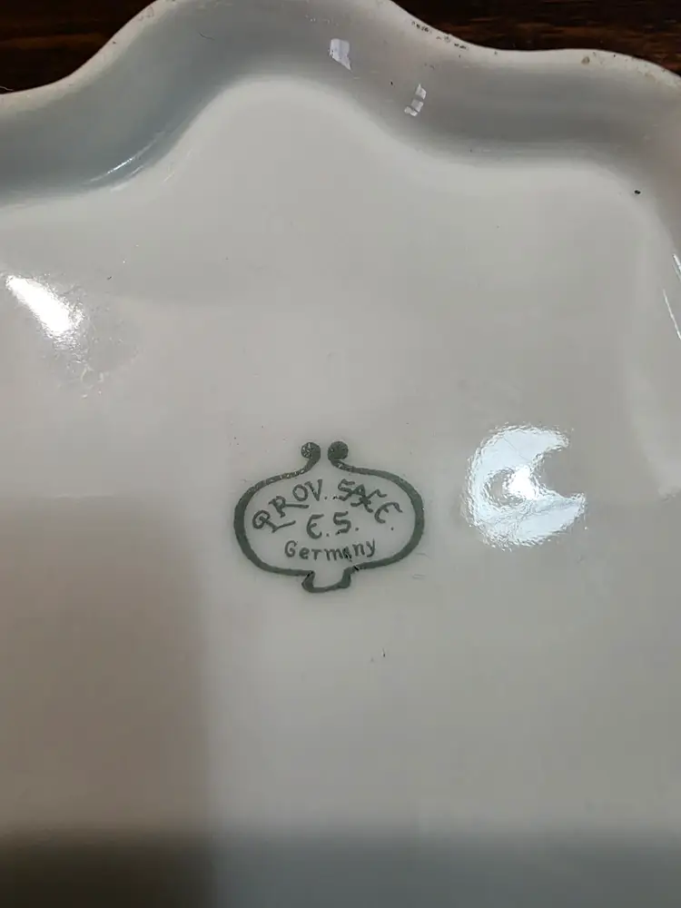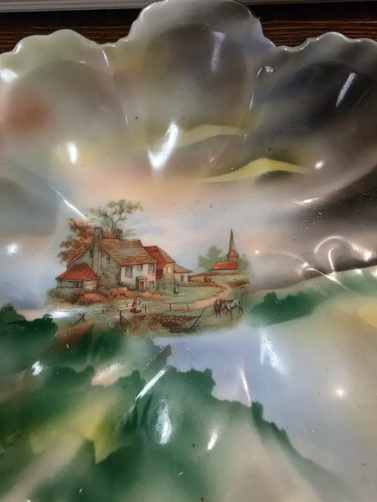Antique Prov Saxe Germany hand painted porcelain ruffled edge bowl. This piece is in Amazing condition with no chips or cracks or fades in paint but does have some glazed over paint spots on bottom. Company made porcelain products from 1861 to 1937. Beautiful looking piece that has a hand painted village scene in a excellent arrangement of colors from the purple skyline to the green foliage around the light blue pond. Piece has a ruffled edge design with black highlights around the rim. Piece is approximately 7 inches round diameter and 2 inches height. Beautiful looking piece.
