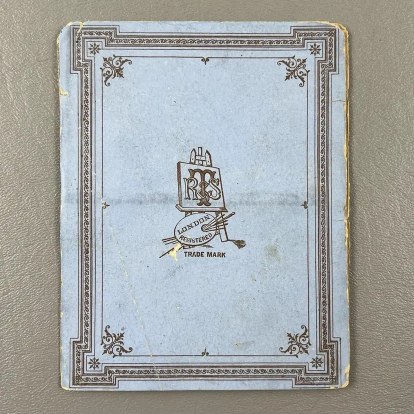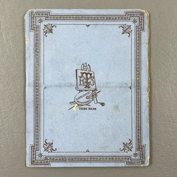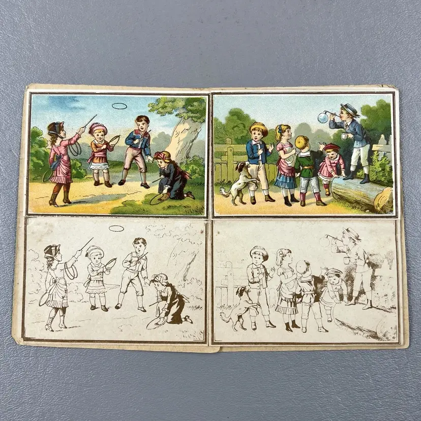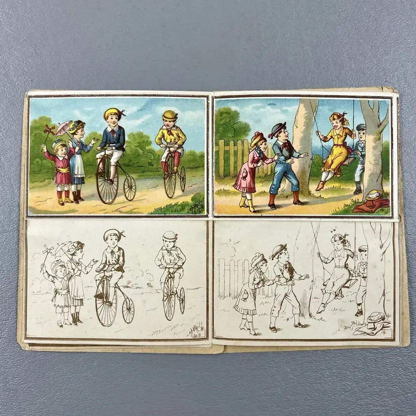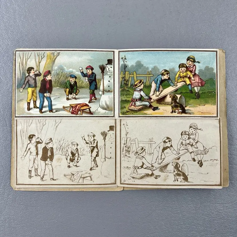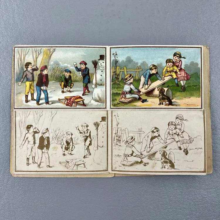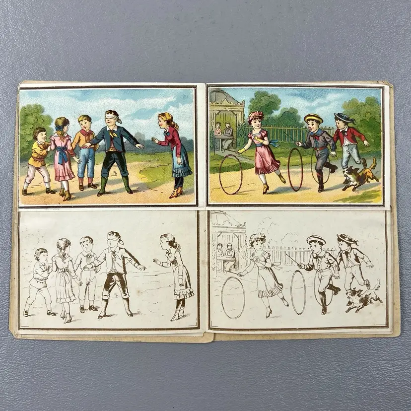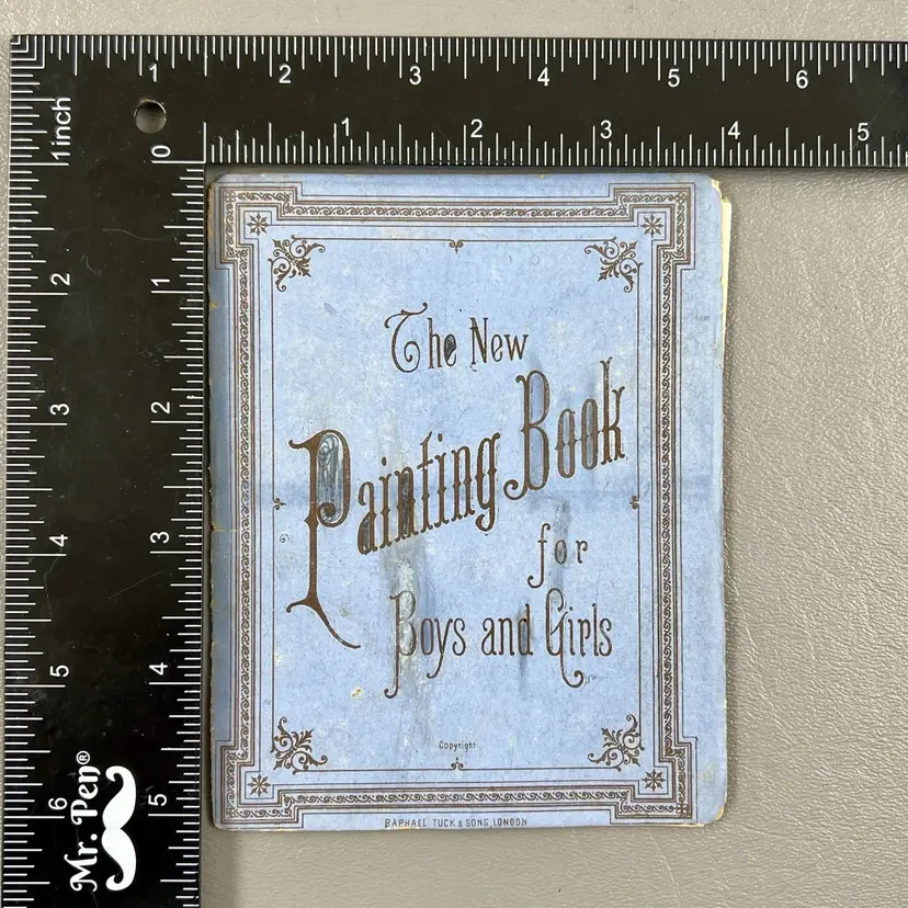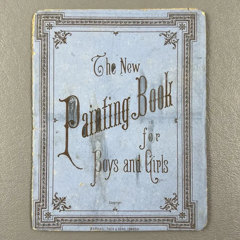 Painting book entitled The New Painting Book for Boys and Girls, published by Raphael Tuck & Sons, London, ca. 1910. The book is bound in blue paper covers.. It comprises a single, long sheet of chromolithograph images and outline images for coloring. The single sheet is mounted to the inside front cover only and is accordion-folded to create 8 pages of images. The chromolithograph sample images are along the top row, and the outline images are beneath them, forming the bottom row. The images are of children playing; none are signed or dated.