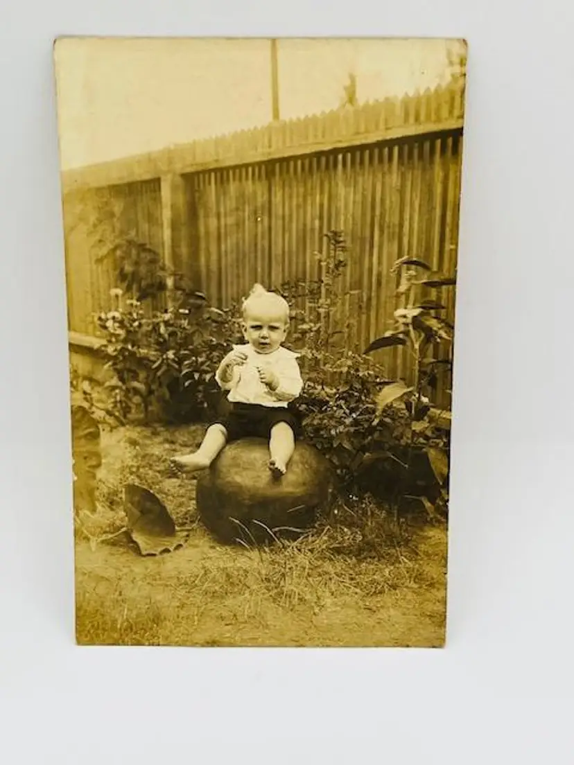 This real photograph postcard is a picture of 9 month old Georgie Frederick Walker sitting on a large ball in a yard. There is a sweet handwritten note to Aunt Allie from Georgie's mother. This postcard is in good condition.