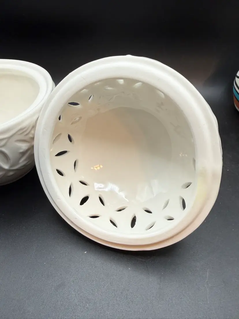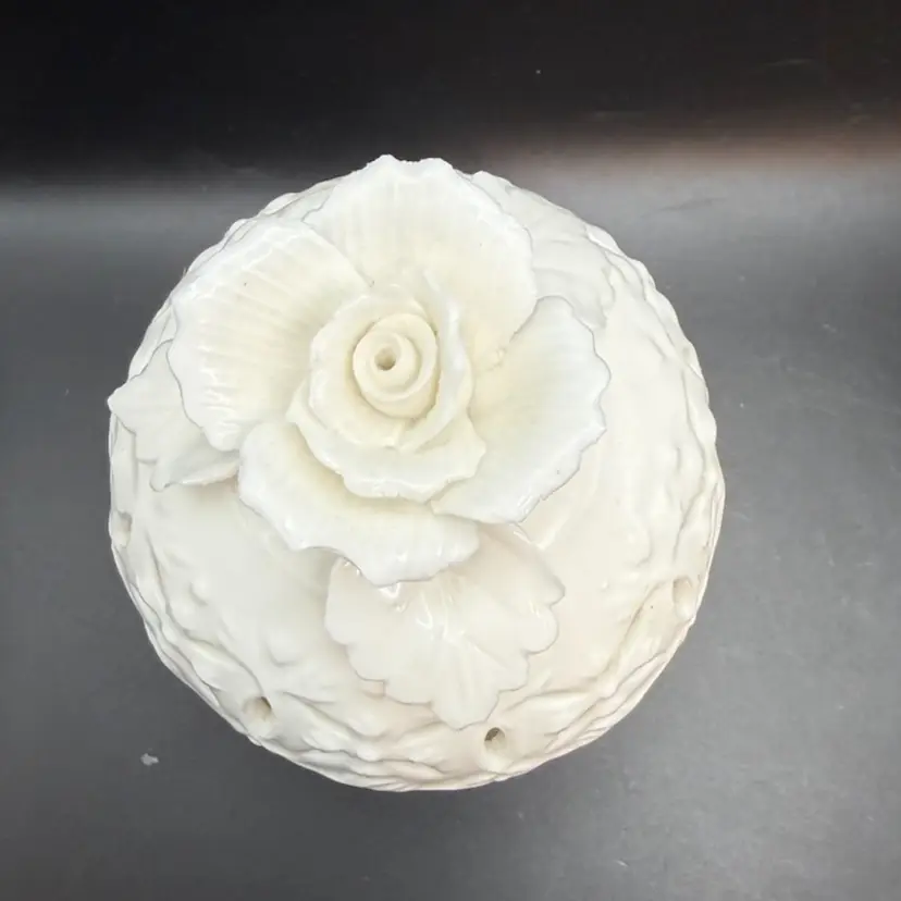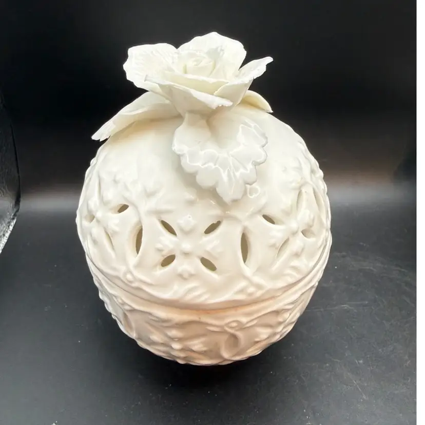 This particular item, with its rose motif and pierced design, aligns with decorative styles popular in the mid to late 20th century.